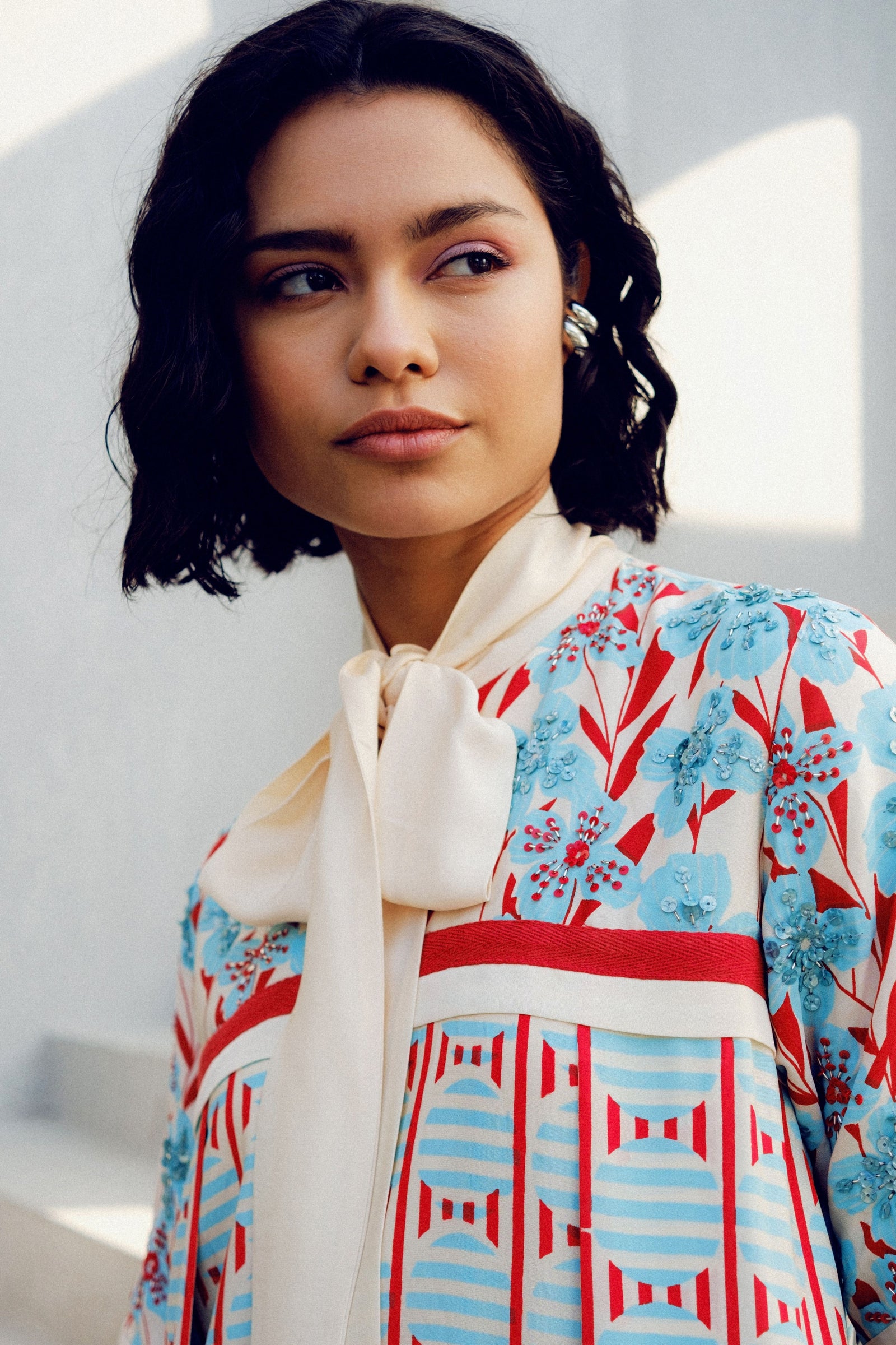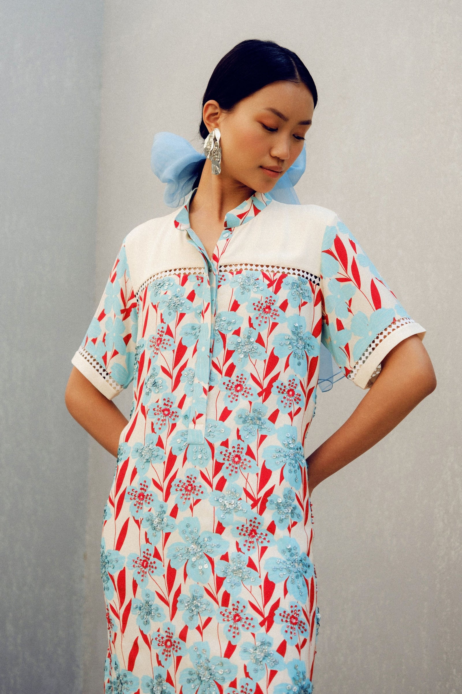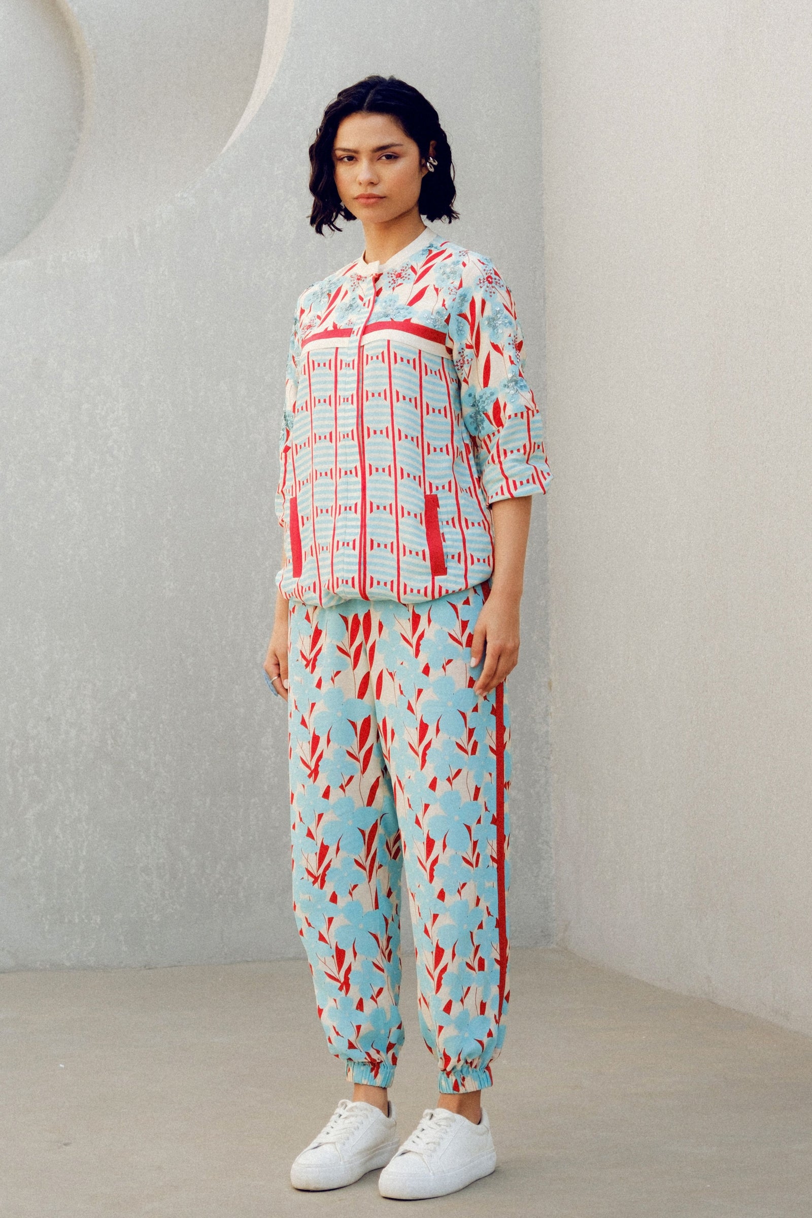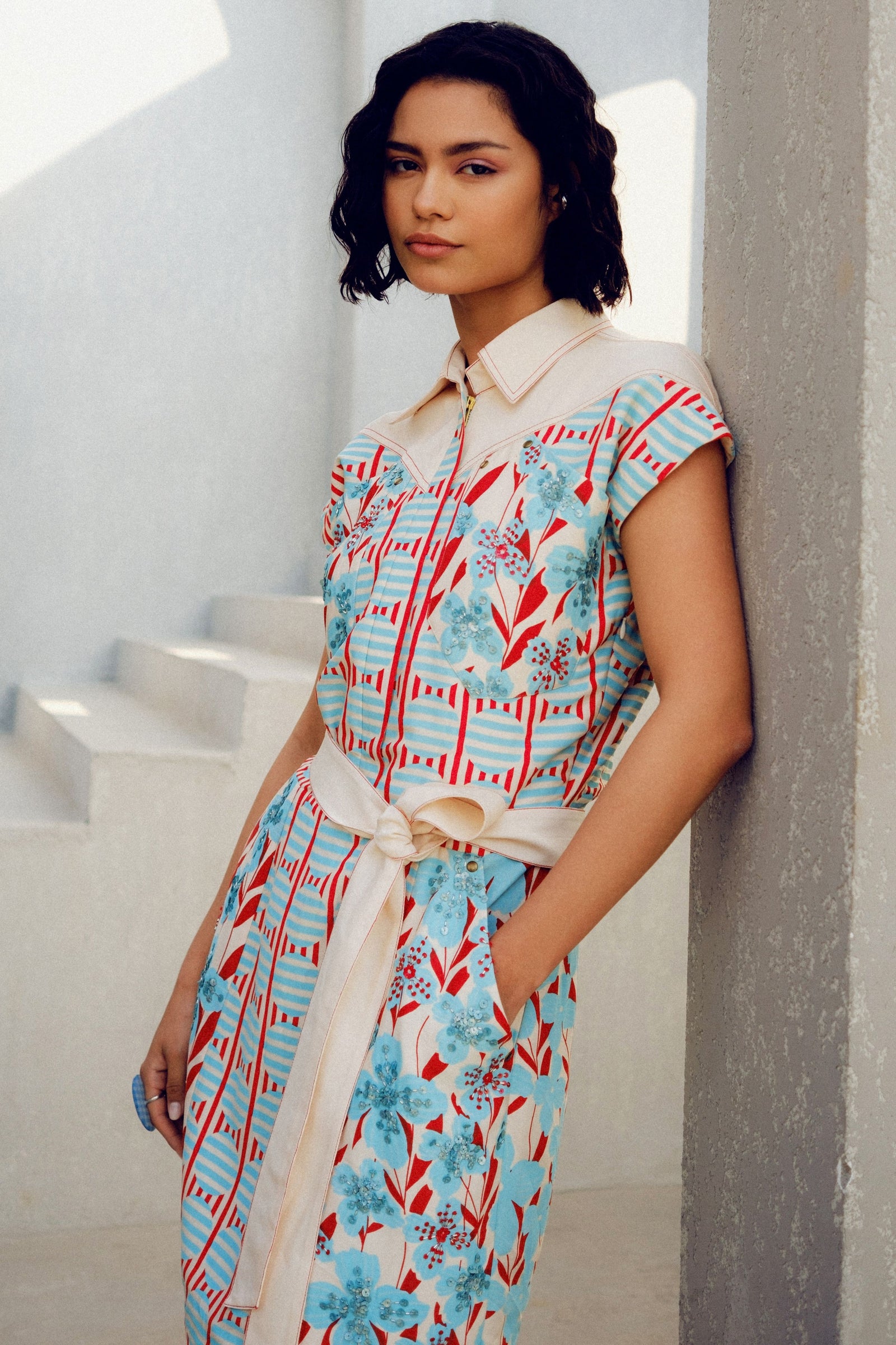 • The Red Margot waistcoat co-ord set is made of pure crepe. It features delicate floral embroidery and sequins detailing at the hemline of the shirt and trousers.
