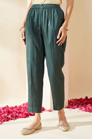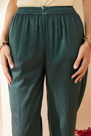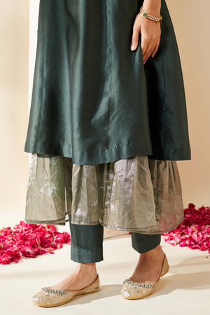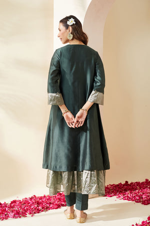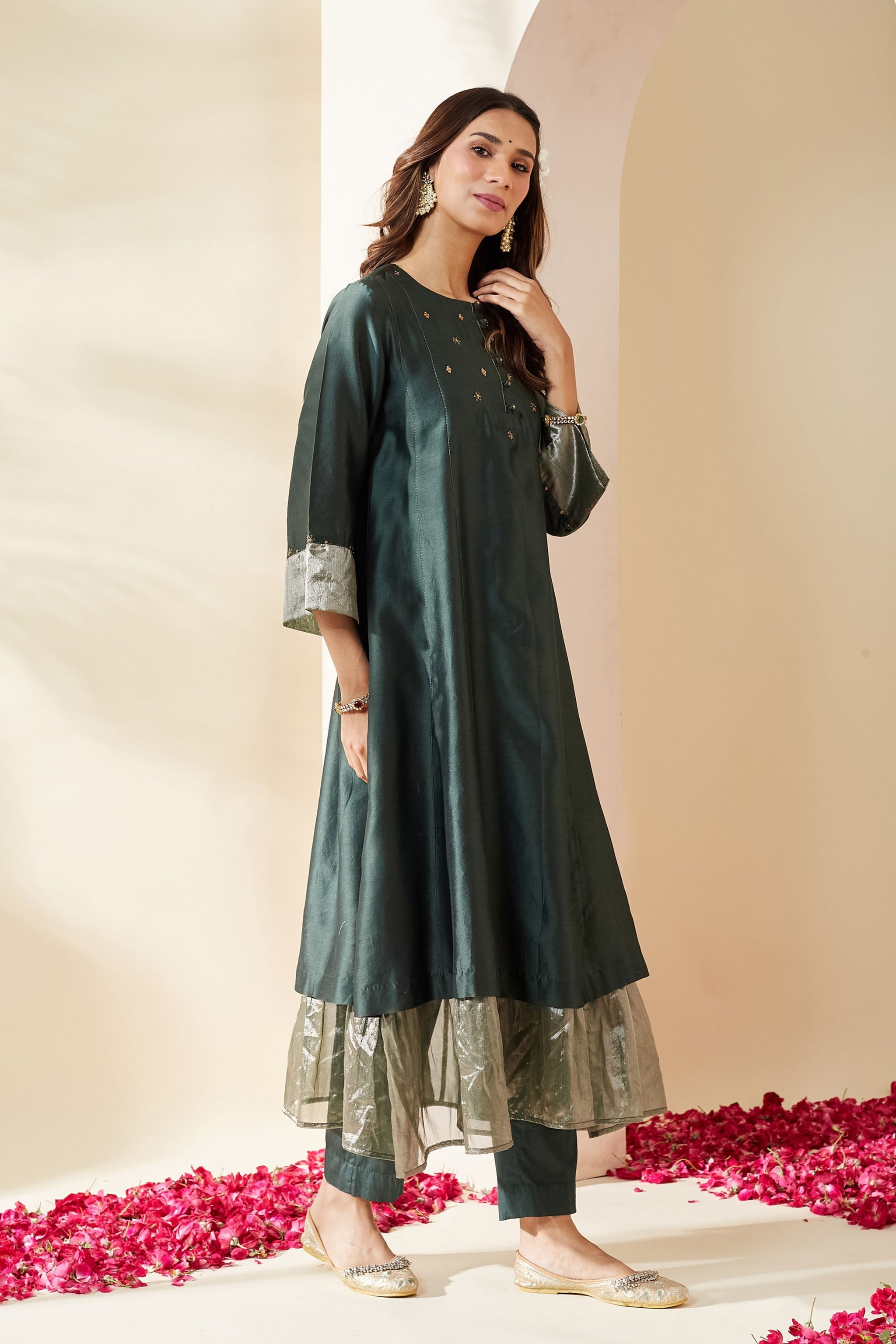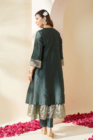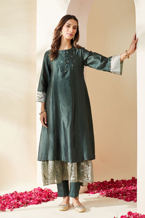 • This long a-line kurta, crafted from rich royal green chanderi fabric, features a round neckline with a potli button front. The double tissue panel adds subtle texture, while the front yoke and three-quarter sleeves are adorned with exquisite hand embellishments, creating a harmonious blend of elegance and artisanal charm. The set comes complete with matching green pants and a green tissue dupatta.