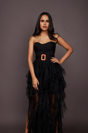 • Corset and ruffled net skirt with neon cutwork & attached inner skirt comes with a belt