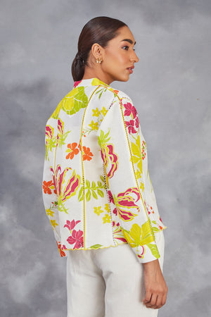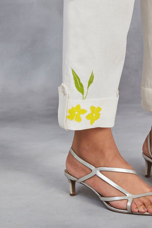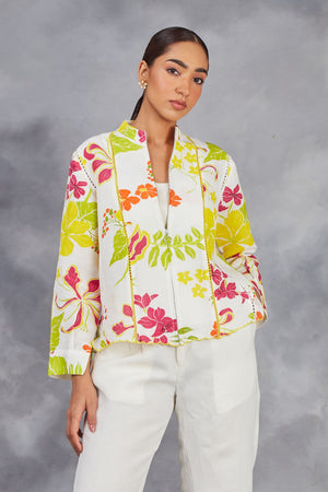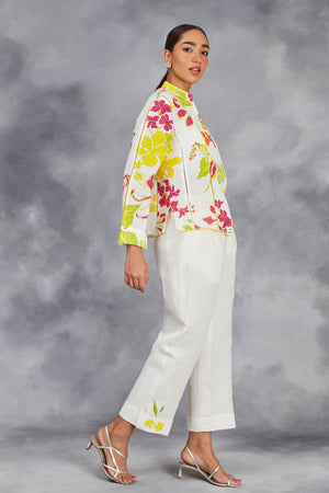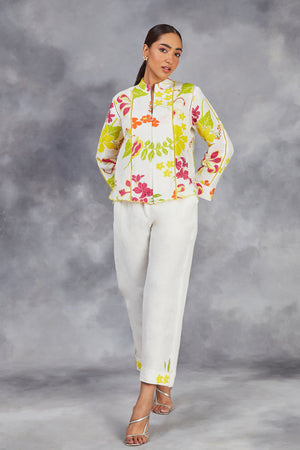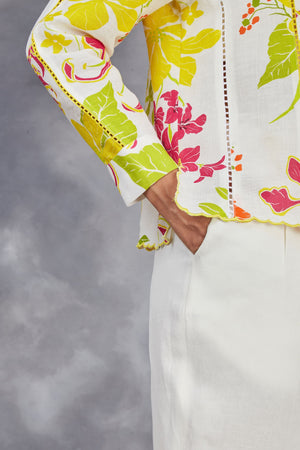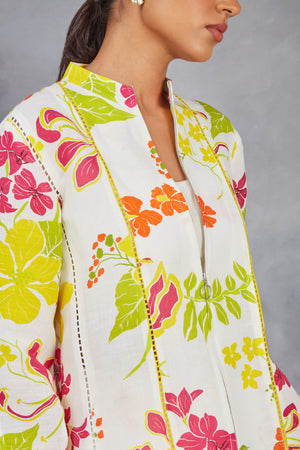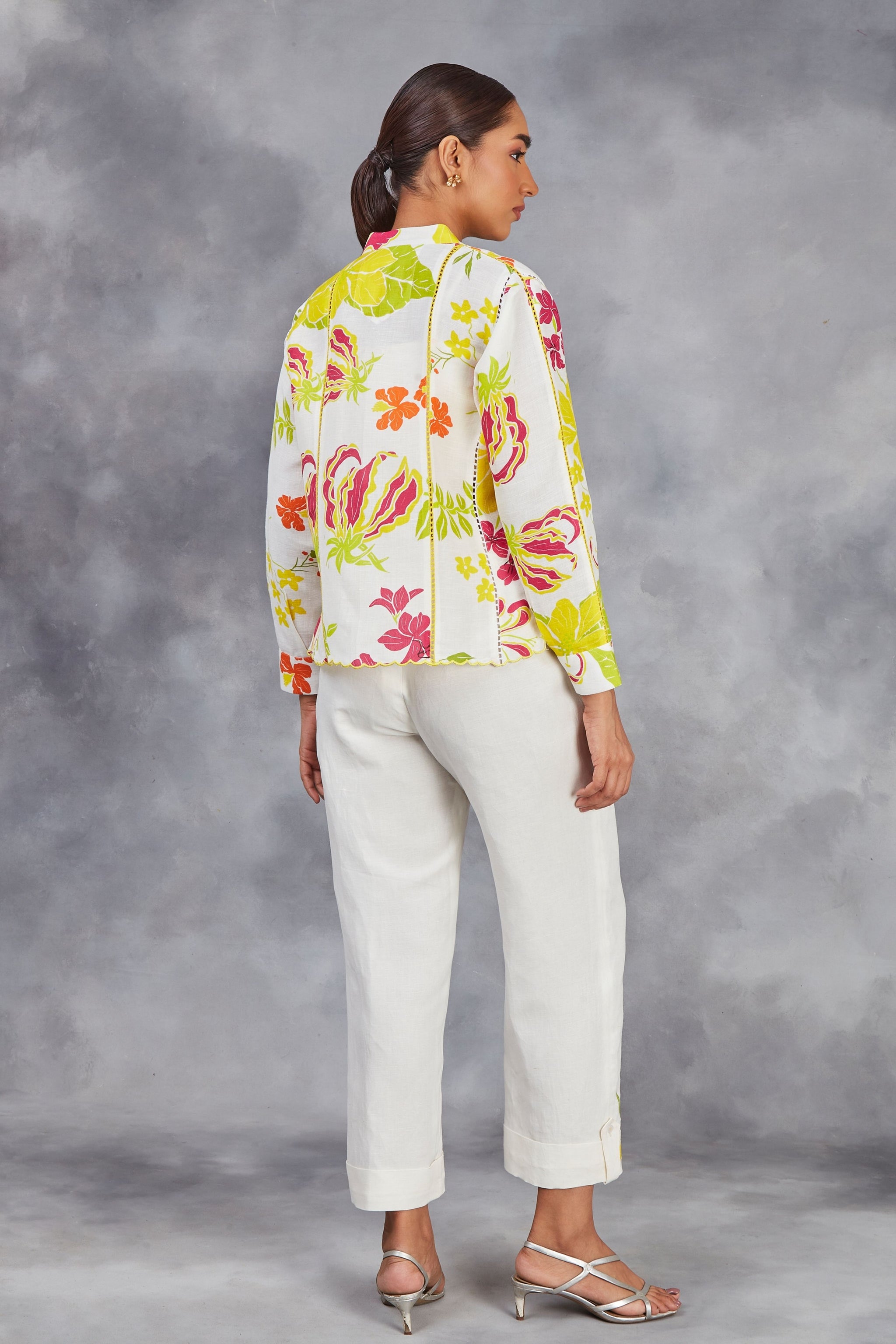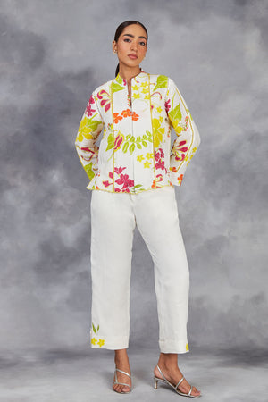• This is a stylish digitally printed off-white pure linen co-ordinate set. The jacket style top features a stand collar, front zip, full sleeves with cuffs, beading and a scalloped hemline. Adorned with a beautiful in-house hibiscus digital print. It is paired with straight pants which have a rolled-up hemline and appliqued floral motifs.