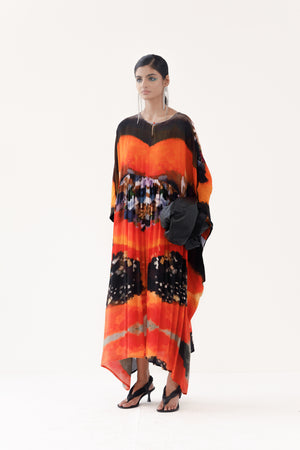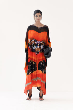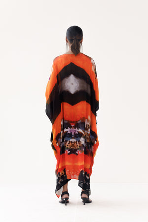 • Printed lush orange kaftan dress. The hues from the food art story make the dress come alive.