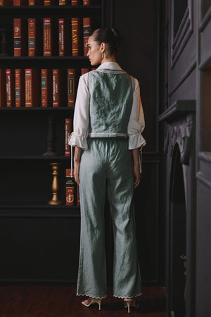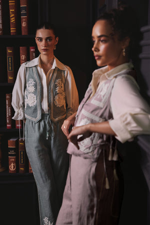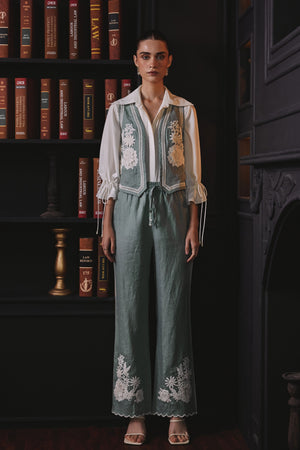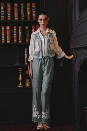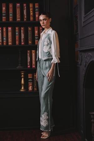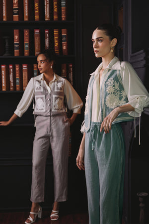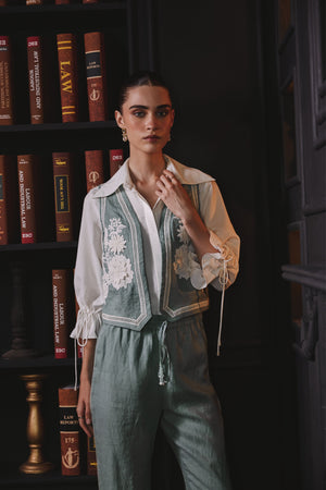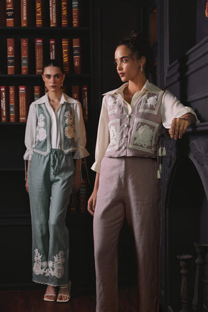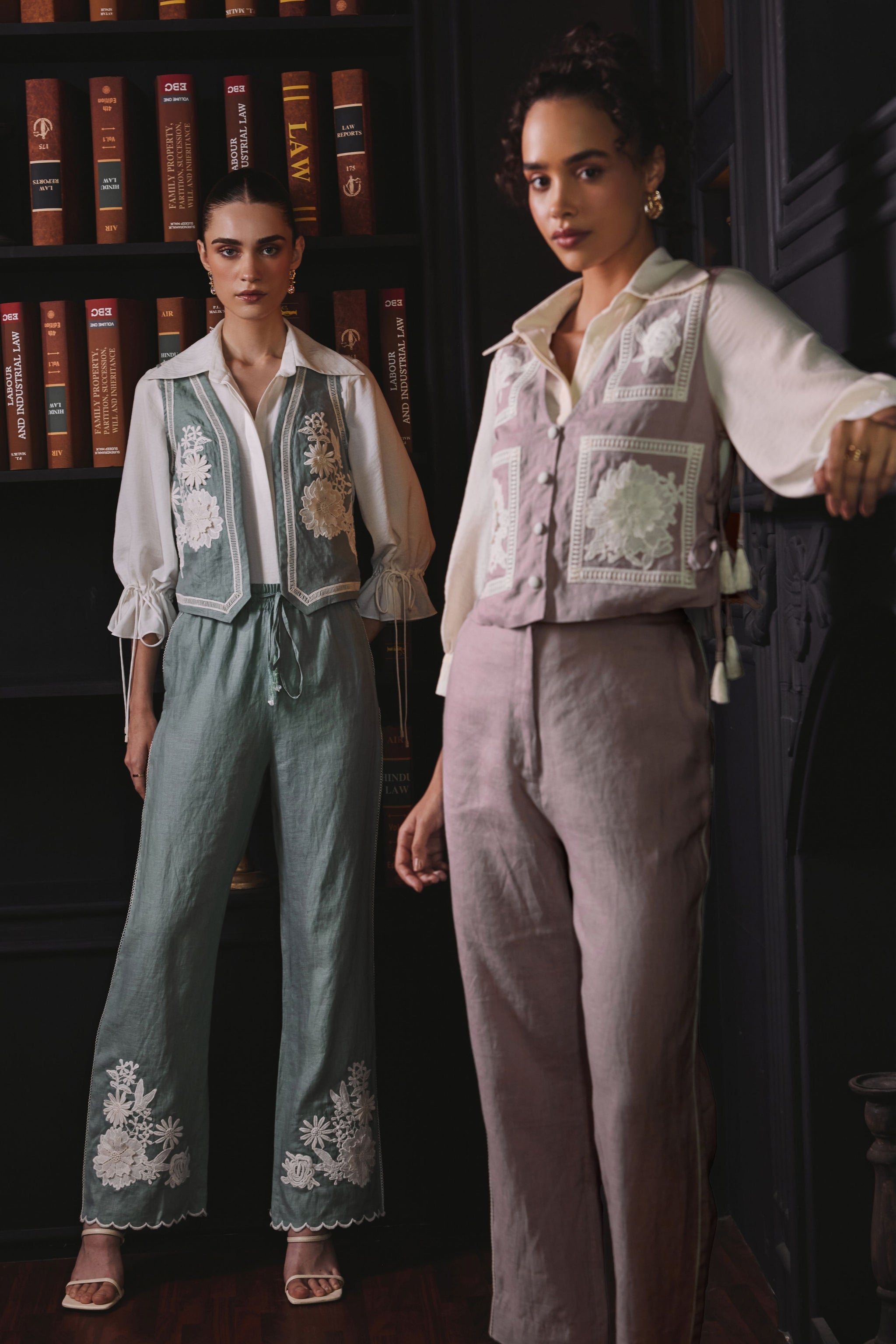 • Relaxed fit shirt front closure concealed placket ties with tassels on the sleeve front open vest lace highlights relaxed flared pants elasticated waistband lace highlights & embroidery.
