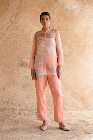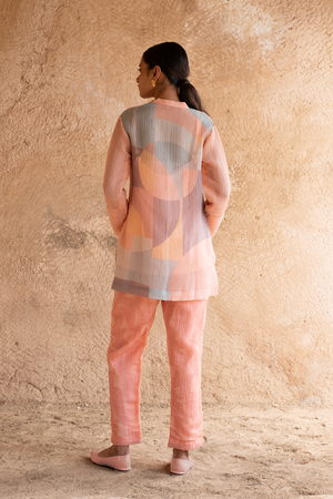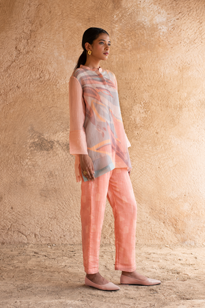 • A three piece co-ord set comprises of a collared shirt pattern with long cuff sleeves expressing abstract prints designed in-house ,paired with pants and the inner.