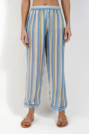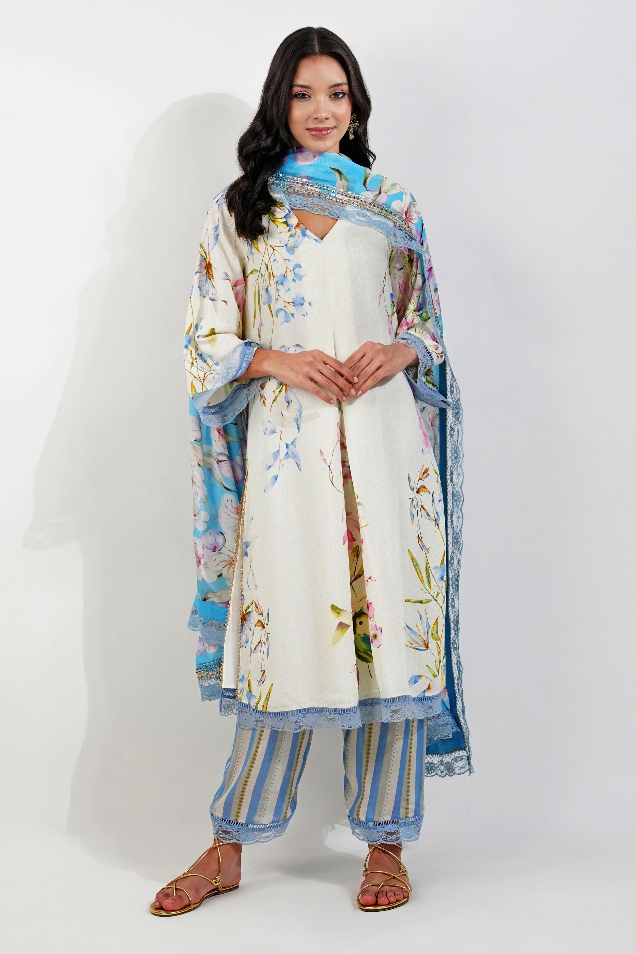 • V-neck box pleat kurta with floral print finished with laces. The kurta is completed with printed muslin pants and a chiffon dupatta that is adroned with sequins border and lace.