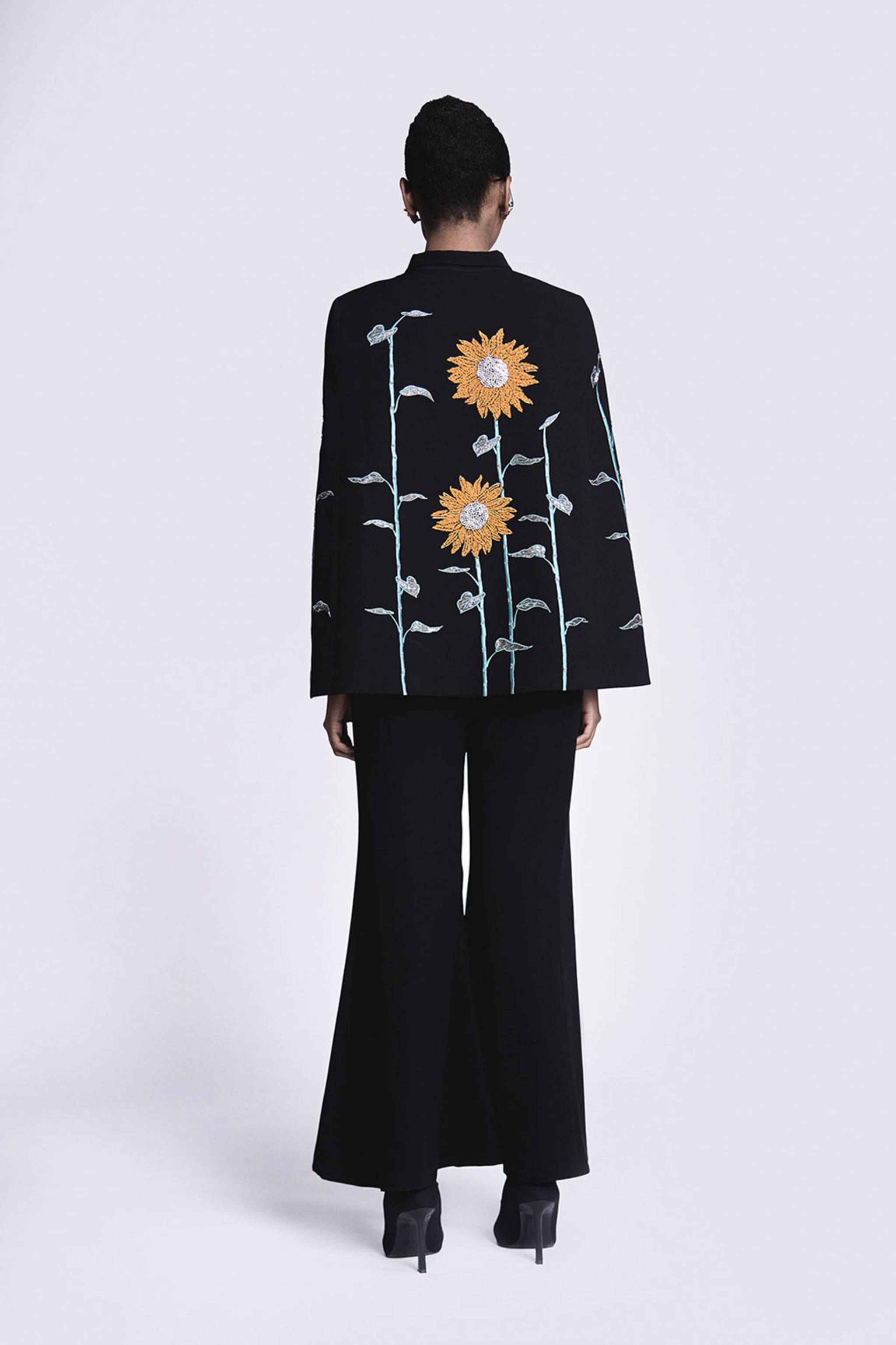 • Bell bottom pants with a side concealed zip opening and a semi-elasticated back.
