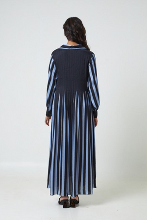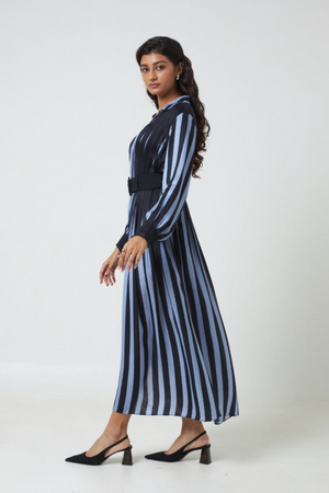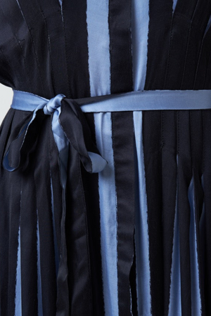 • The sunrays dress, crafted from the softest bemberg twill satin fabric, features a striking black and blue stripe print with pleating all over. It includes a collar and bell sleeves, comes with a detachable belt for styling. Styling tip: pair with heels or boots and minimal jewellery.