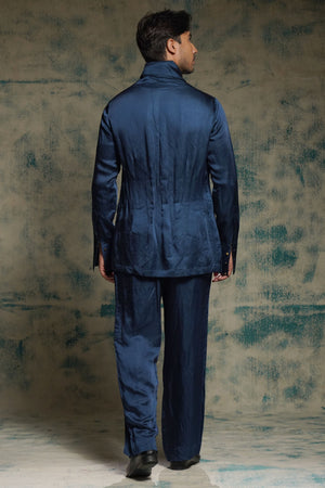 • This refined tealstone angrakha kurta set features a striking tealstone hue and an exaggerated collar, accented with gold button detailing for a bold yet elegant statement. Paired with straight trousers, it completes a look of contemporary sophistication and timeless style.