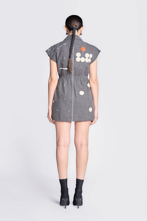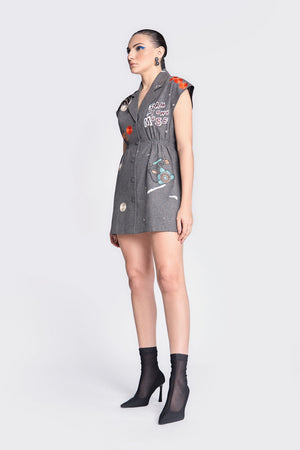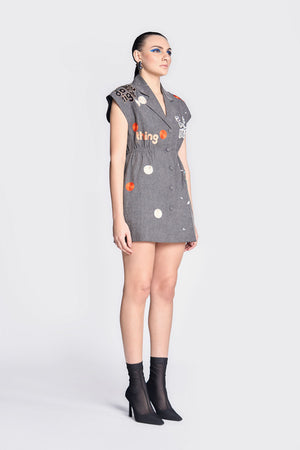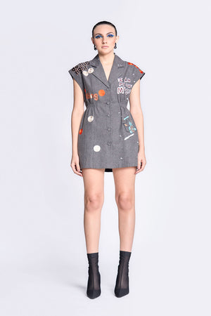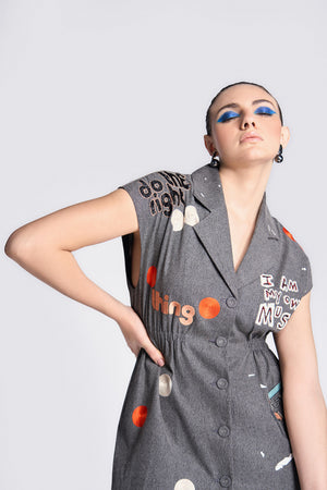 • Robe dress embroidered with funky motifs like vintage telephone, circles, and text. It has notch collar, elasticated waist and fabric-covered buttons.
