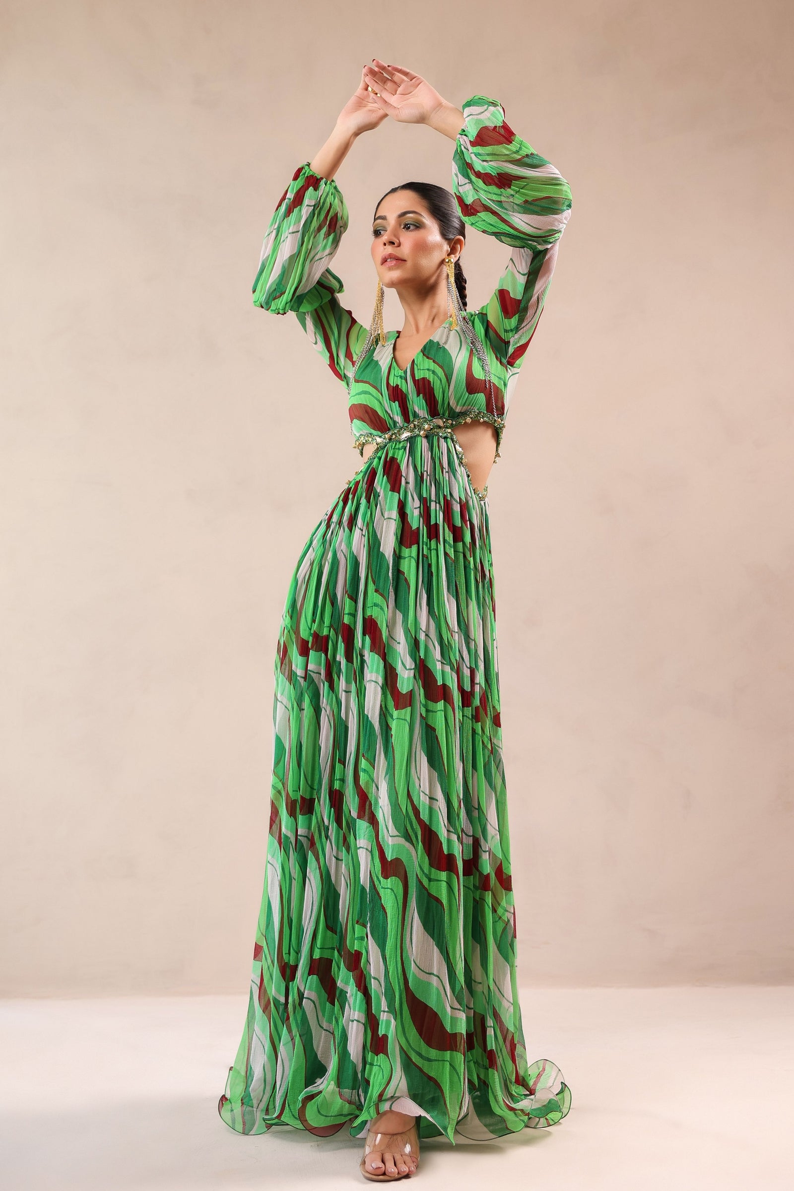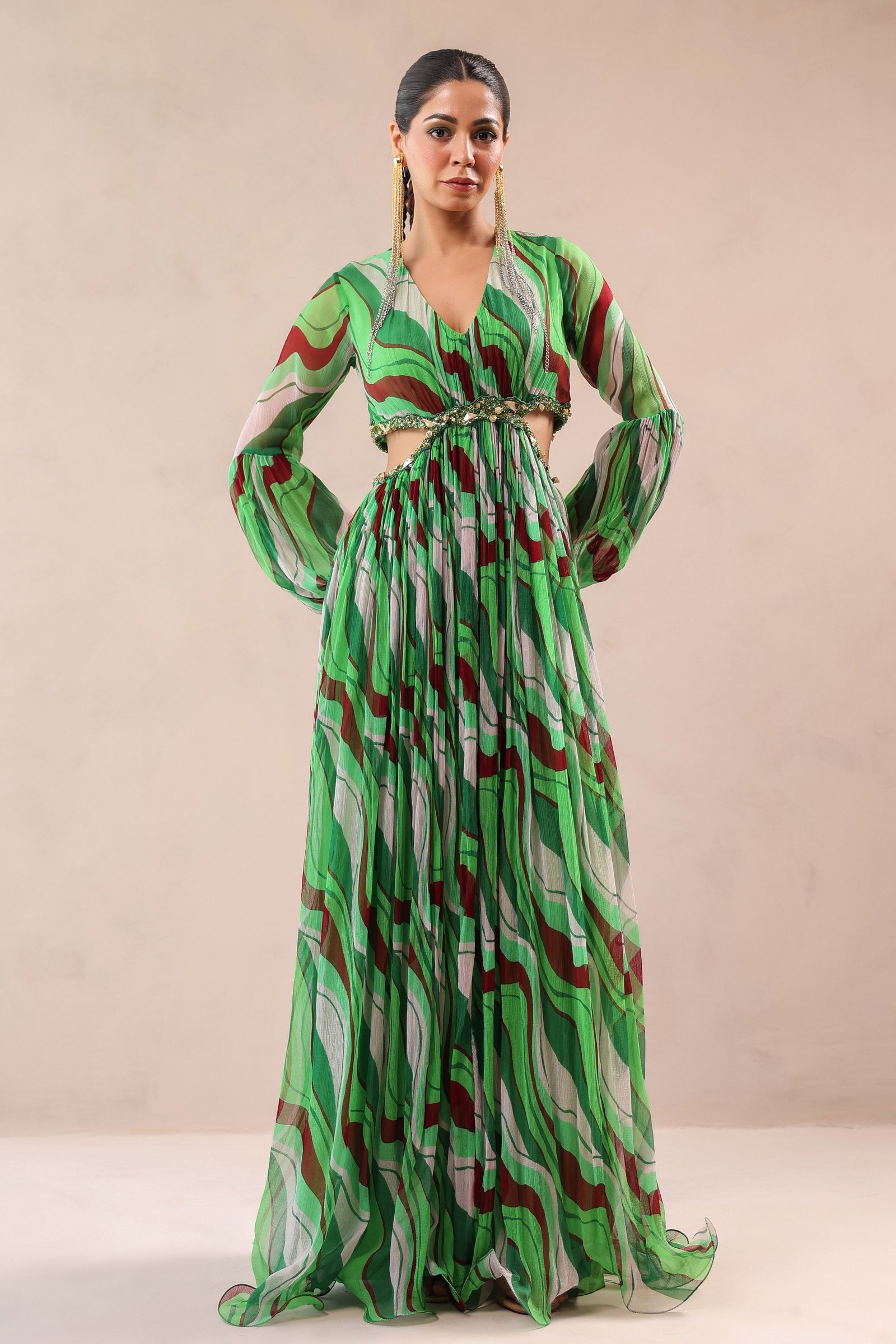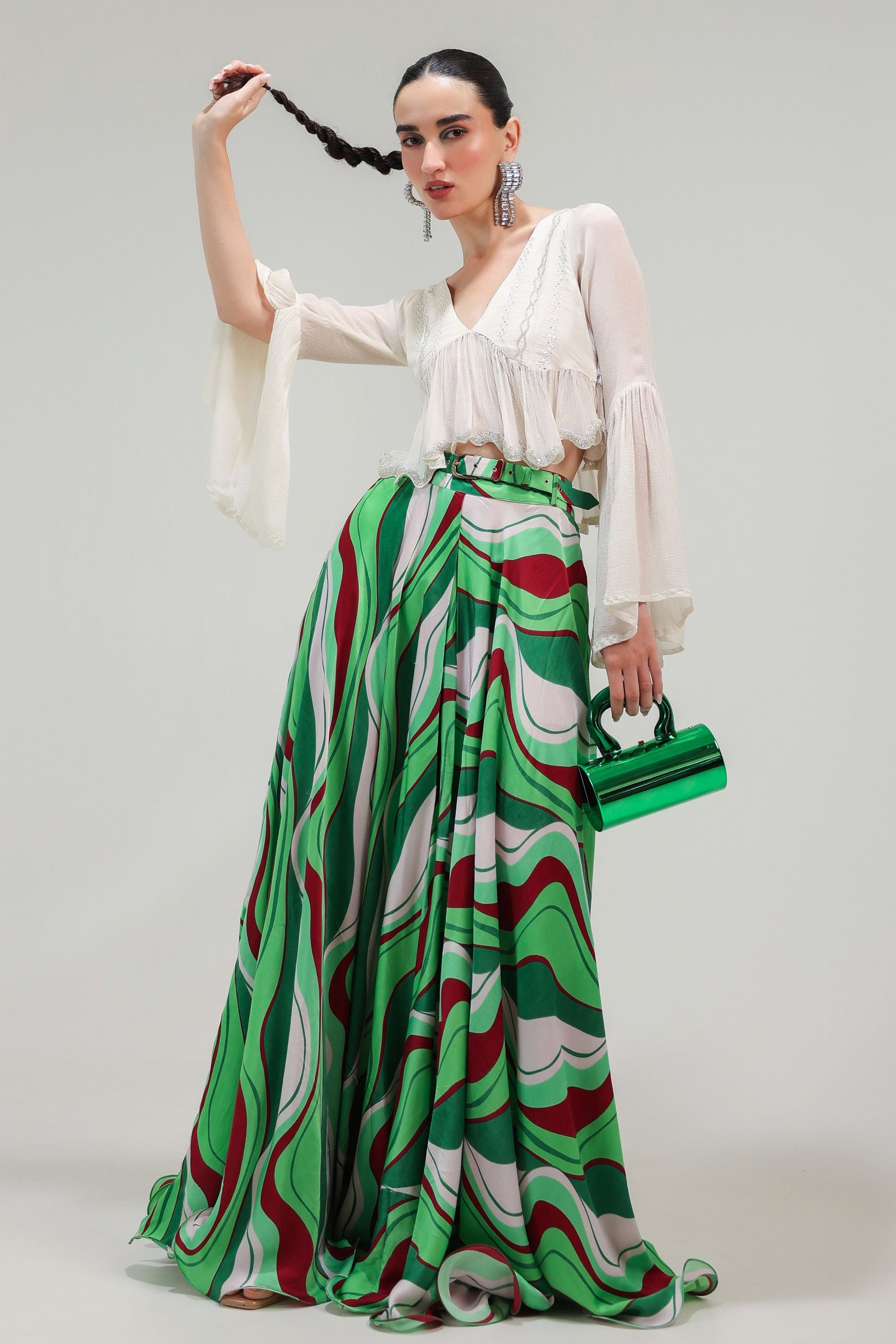 • Featuring our bumblebee green popppy planet print ruched peplum tunic embroidered in multi-colour sequin & pearl work paired with bellbottom, embellished belt & rose red dupatta set.