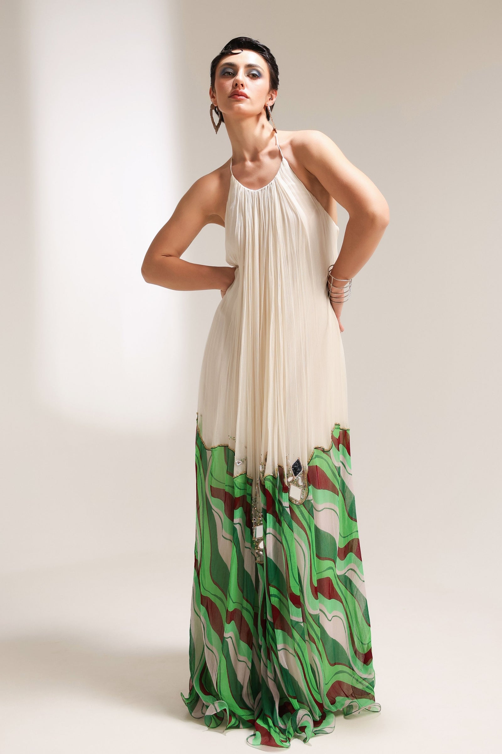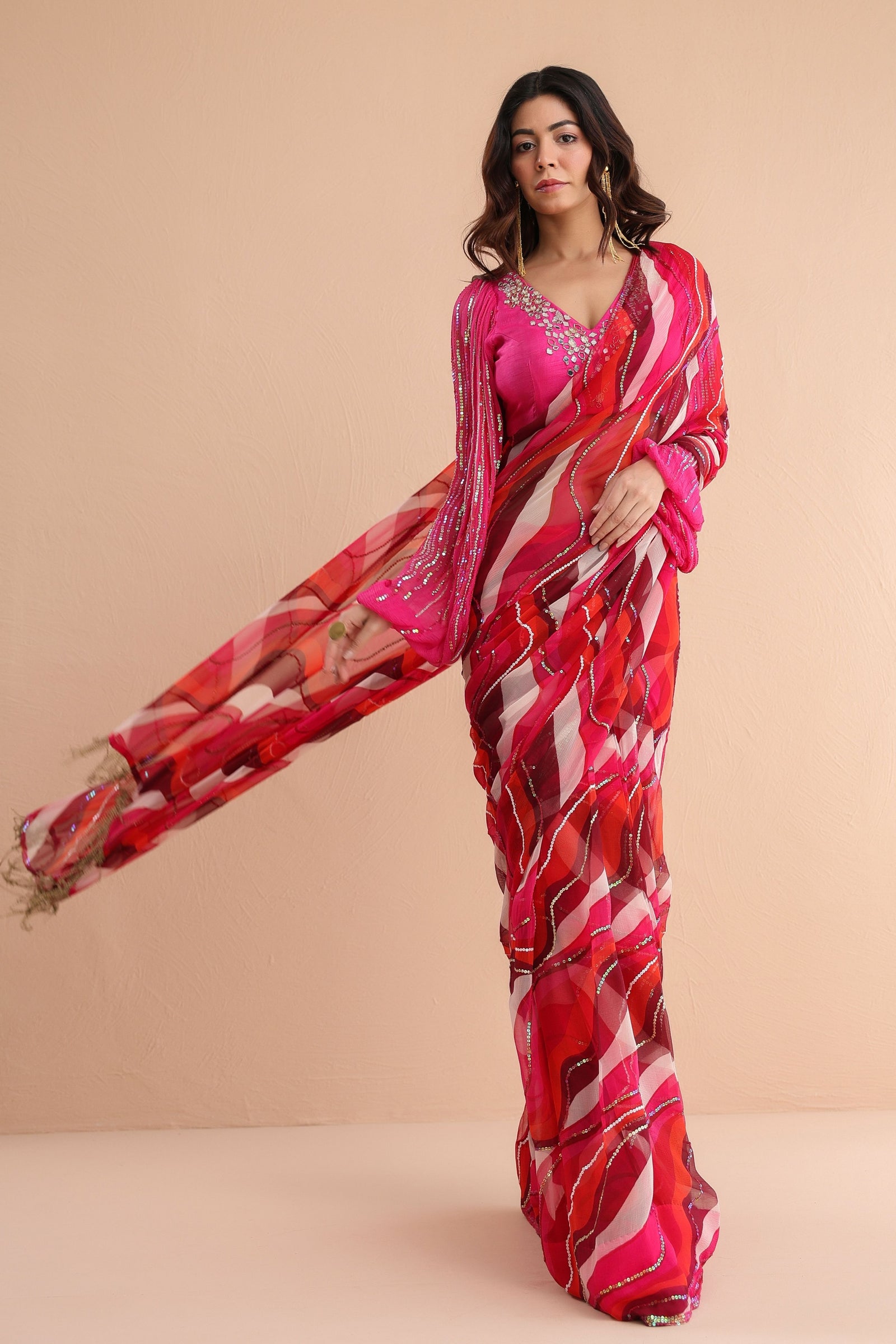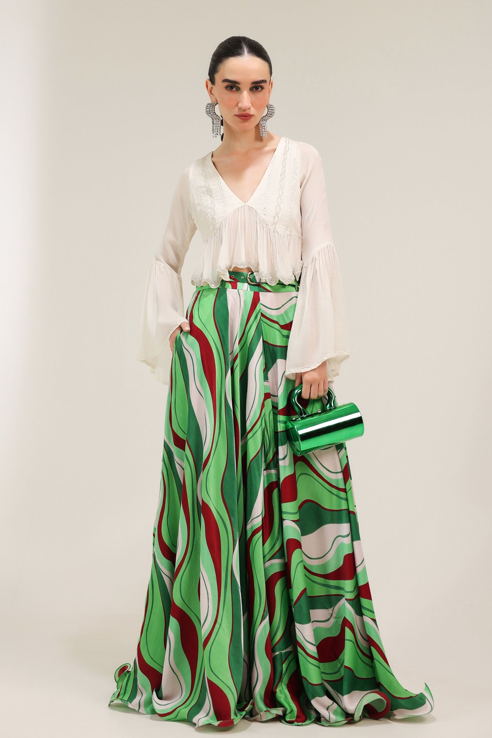 • Featuring our bumblebee green popppy planet print ruched peplum tunic embroidered in multi-colour sequin & pearl work paired with bellbottom, embellished belt & rose red dupatta set.