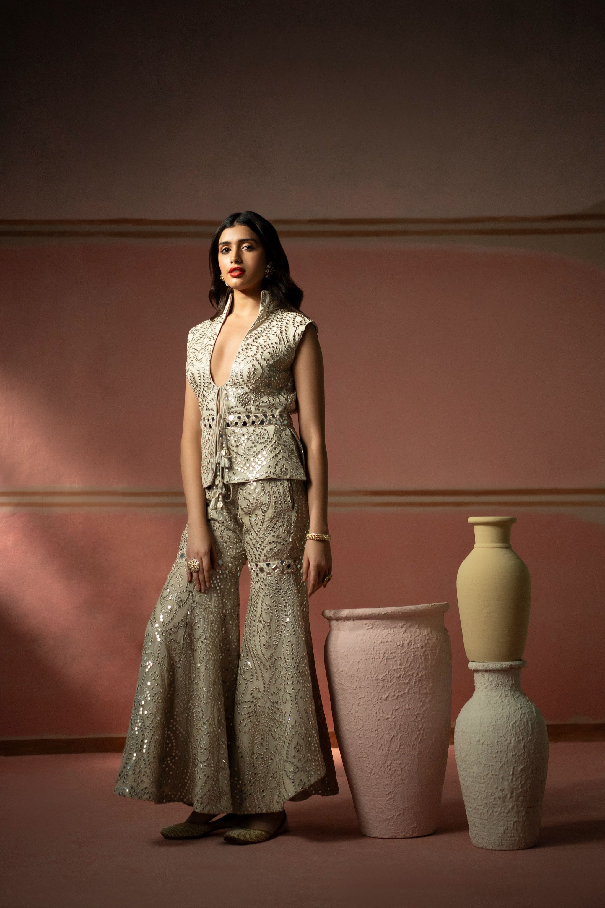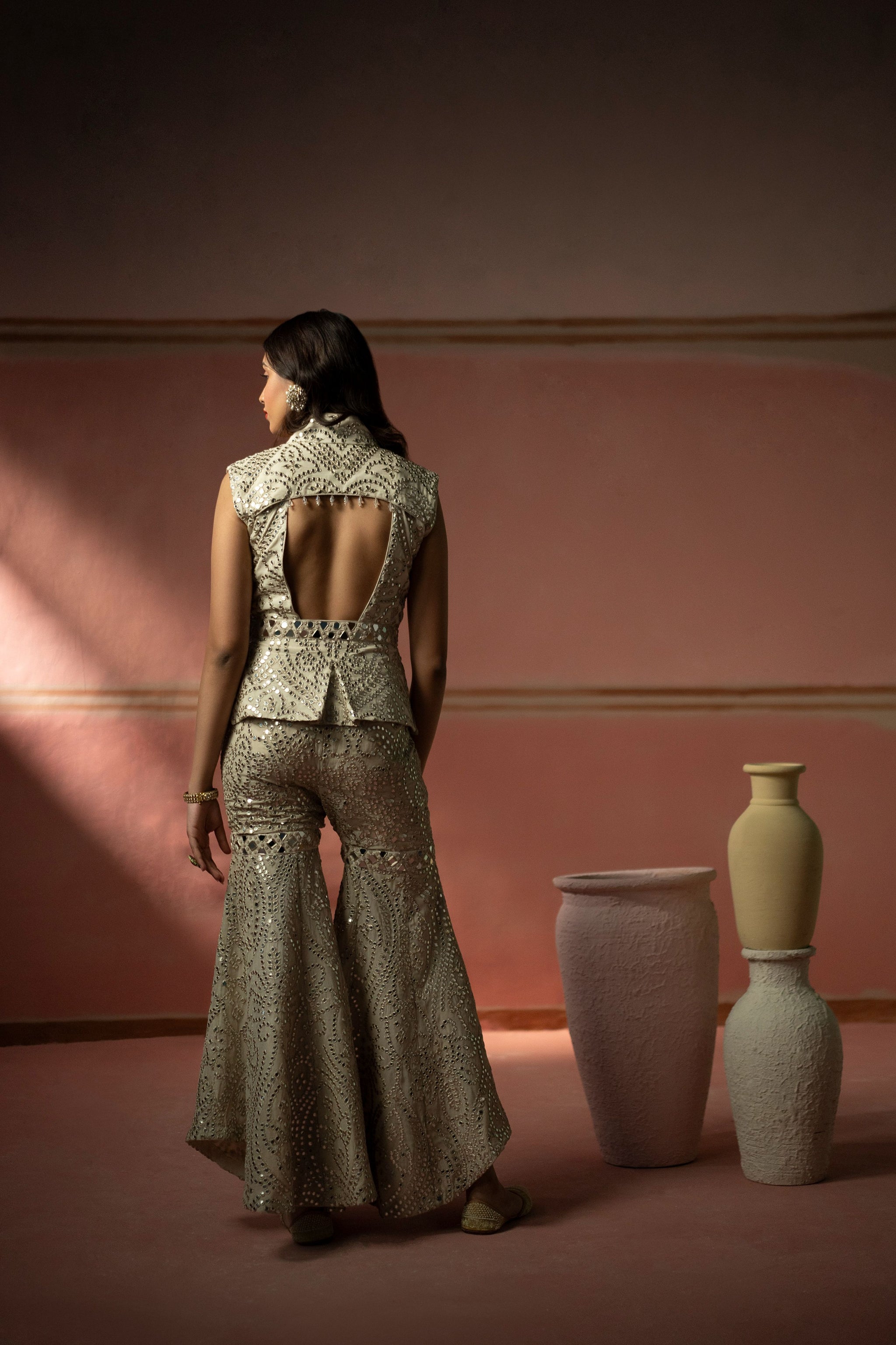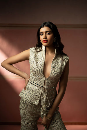 • Georgette silver zari mirrorwork u neck tassle jacket