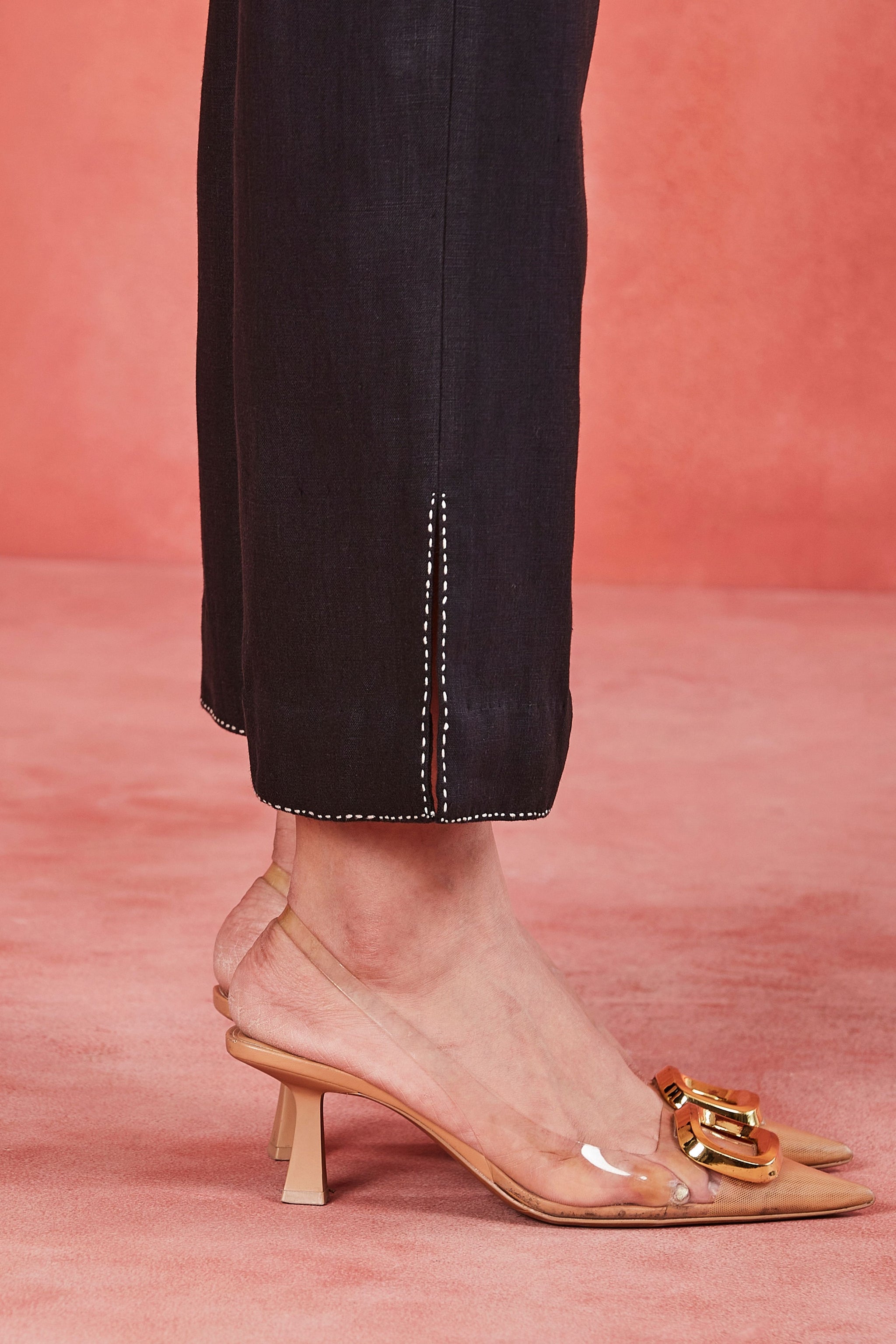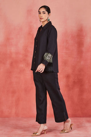 • This black pure linen co-ordinate set exudes sophistication, with a shirt featuring a sleek collar, front buttons, and refined cuffs. Embroidered with silk thread floral embroidery and sparkling black swarovski crystal tassels. Paired with matching straight-fit pants adorned with side slits and pockets. This handcrafted ensemble showcases unique charm and character. It may have slight irregularities in pattern, colour, or texture, celebrating the craftsmanship and individuality of each piece. Embrace these variations as a part of the product's story, crafted with care and attention to detail.