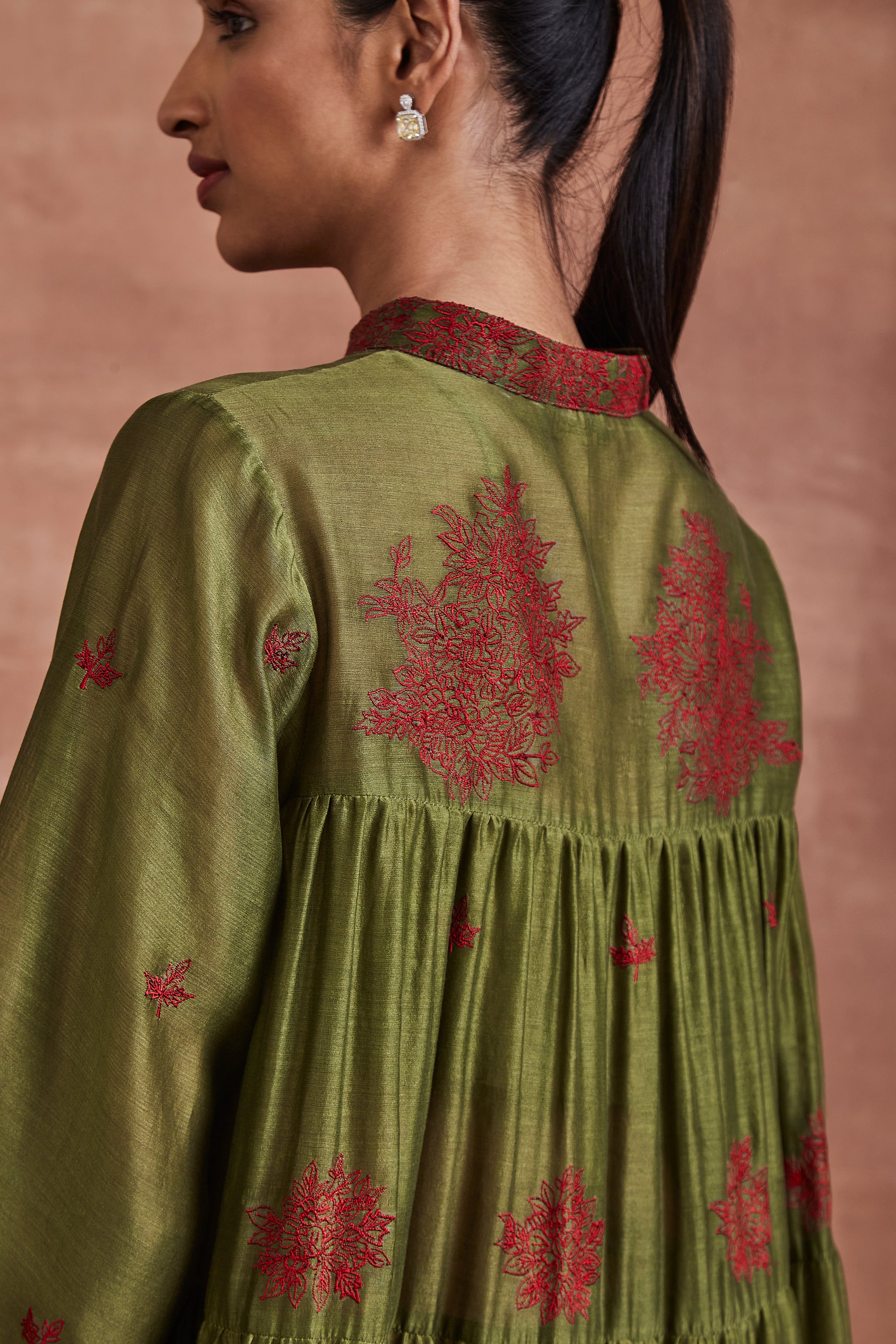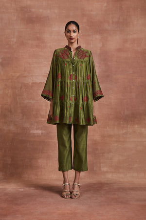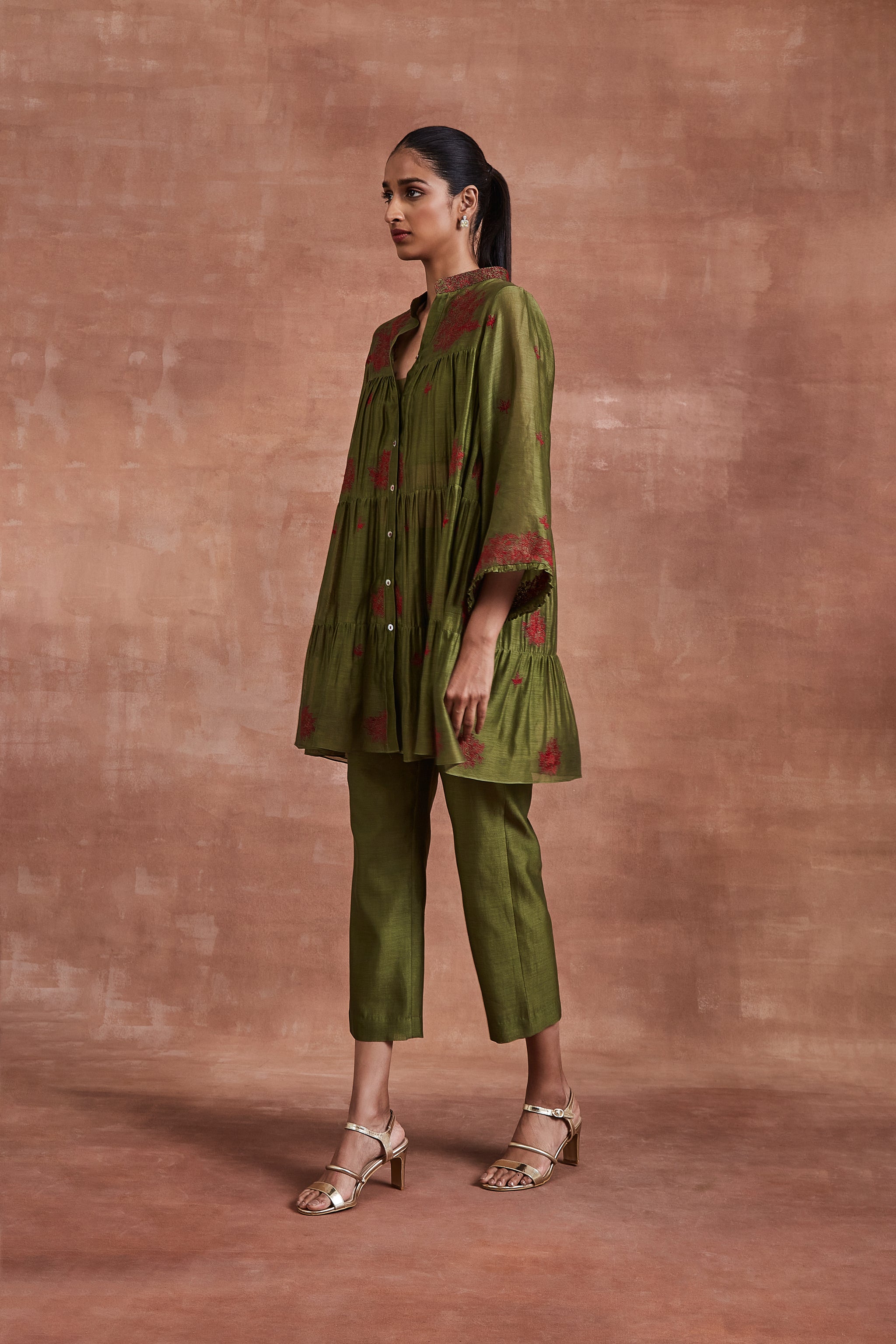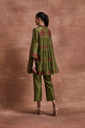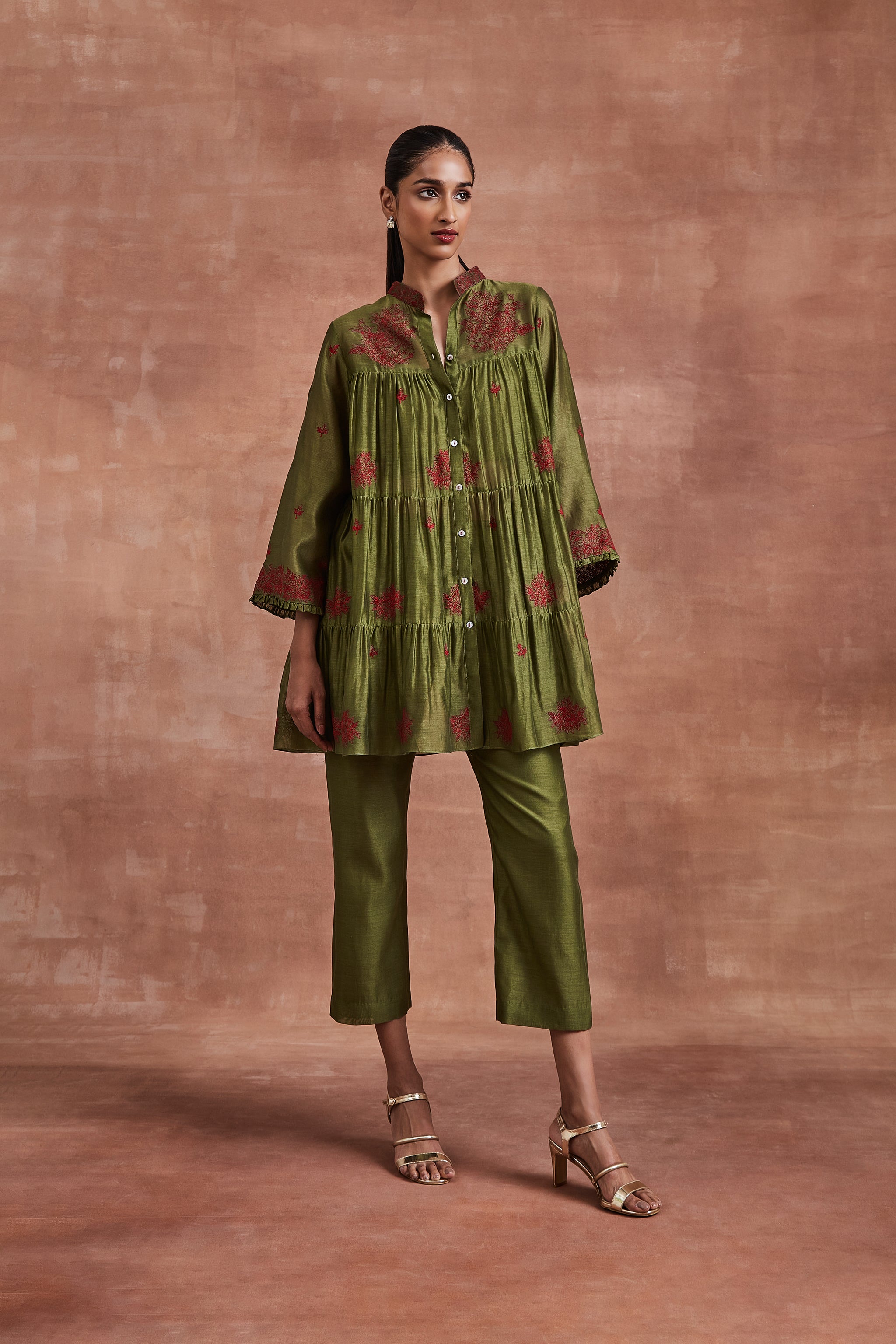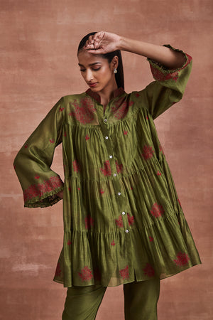 • Make a statement in our Olive Green Chanderi Tiered Coordinate Set, featuring a red silk thread embroidered shirt and complemented by a pair of olive green Chanderi pants. Complete with a bustier or slip as you choose.