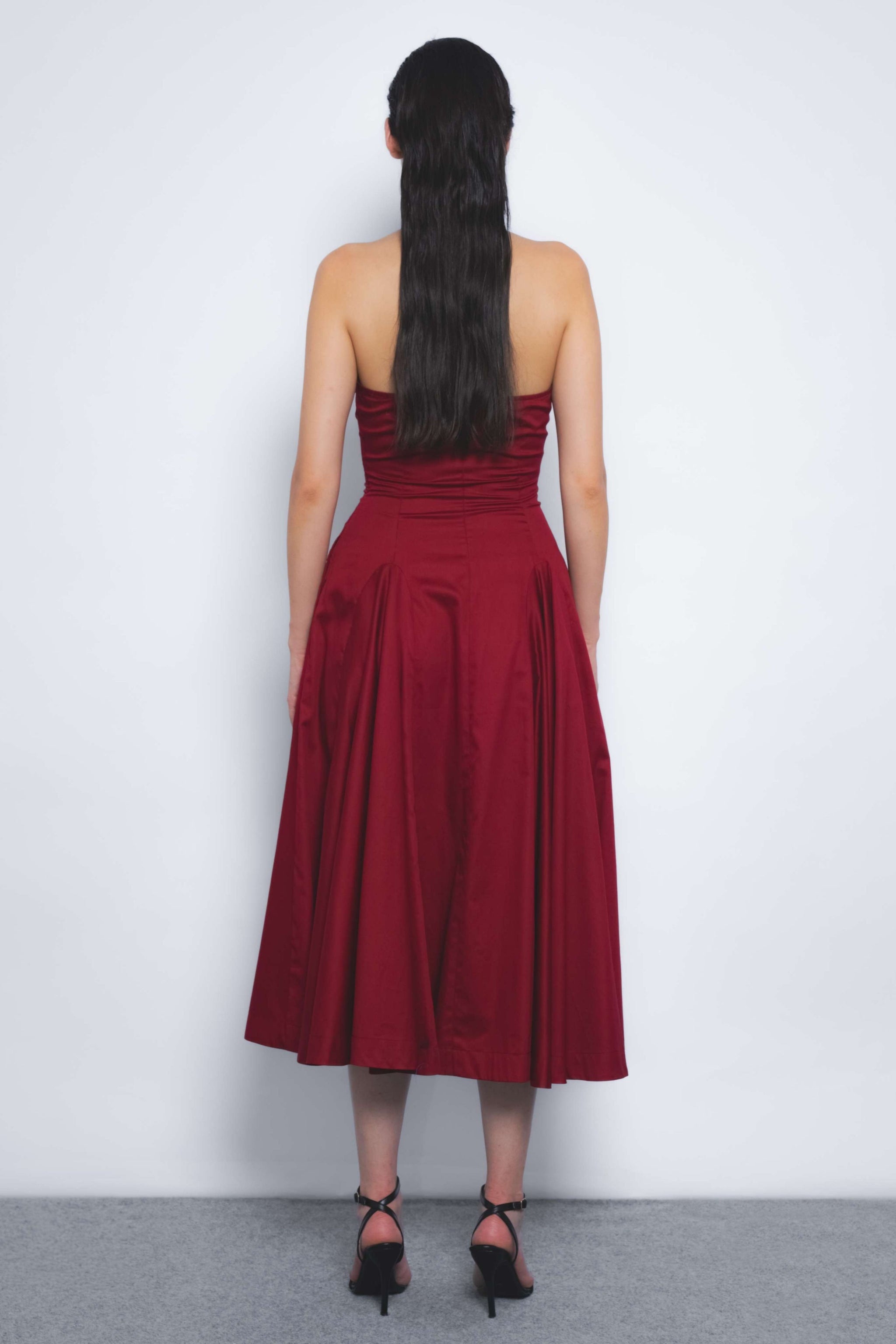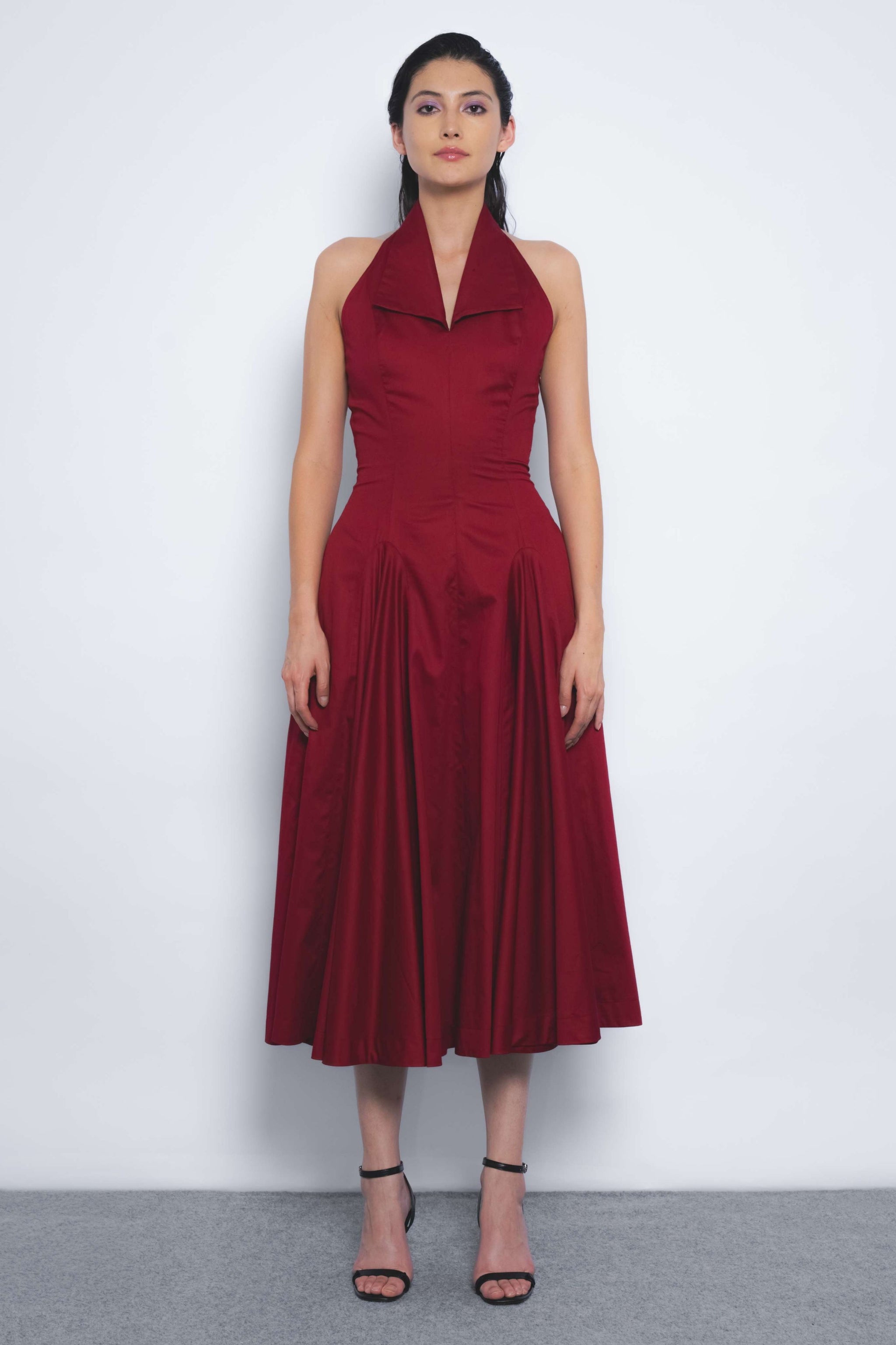 • A classic fit-and-flare silhouette updated with a backless halter neckline and sailor-inspired collar, creating a timeless cocktail look with a breezy, modern twist.