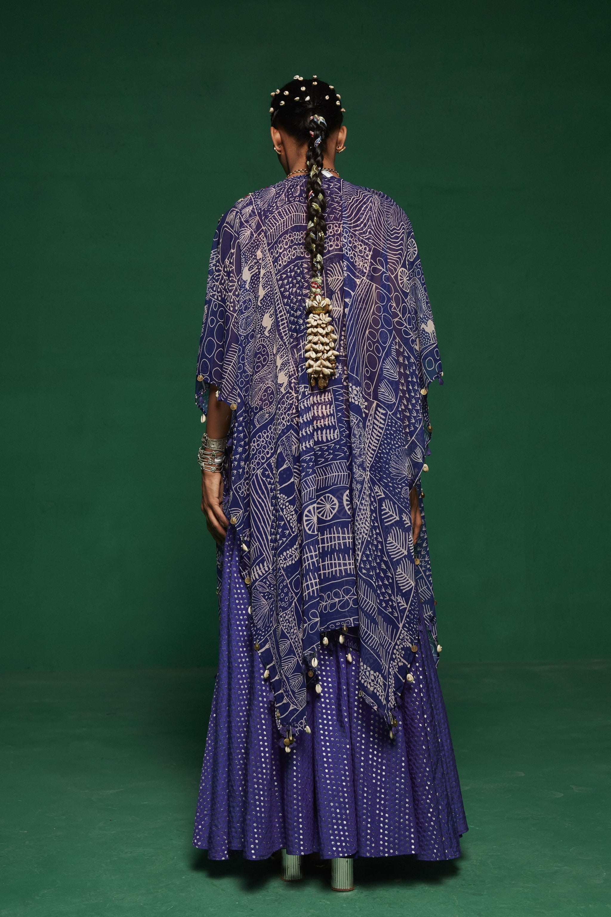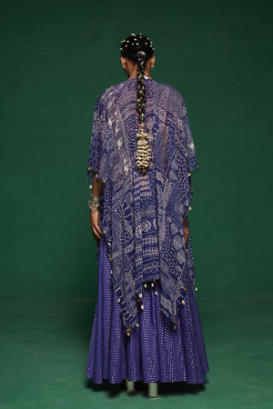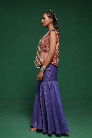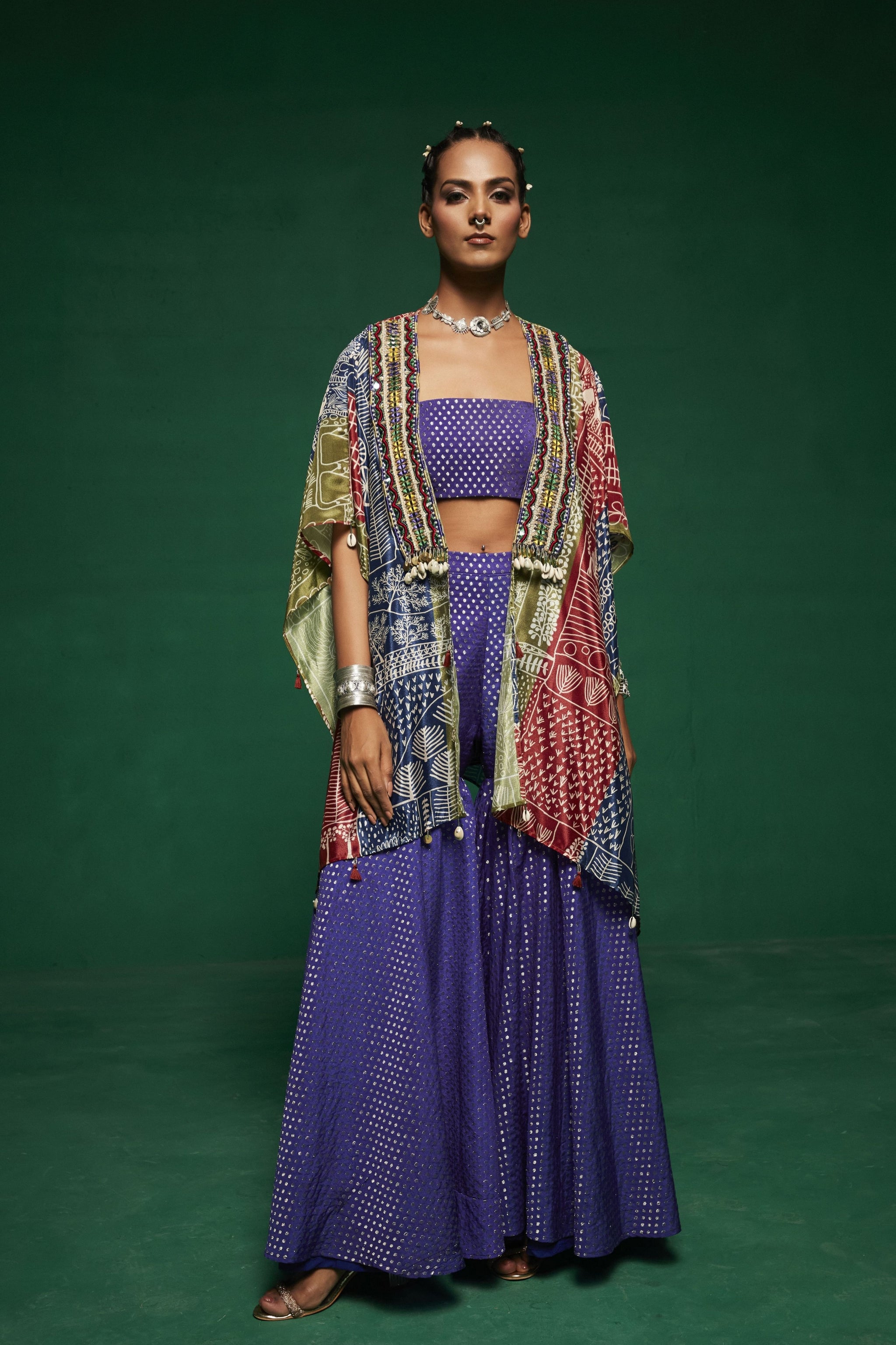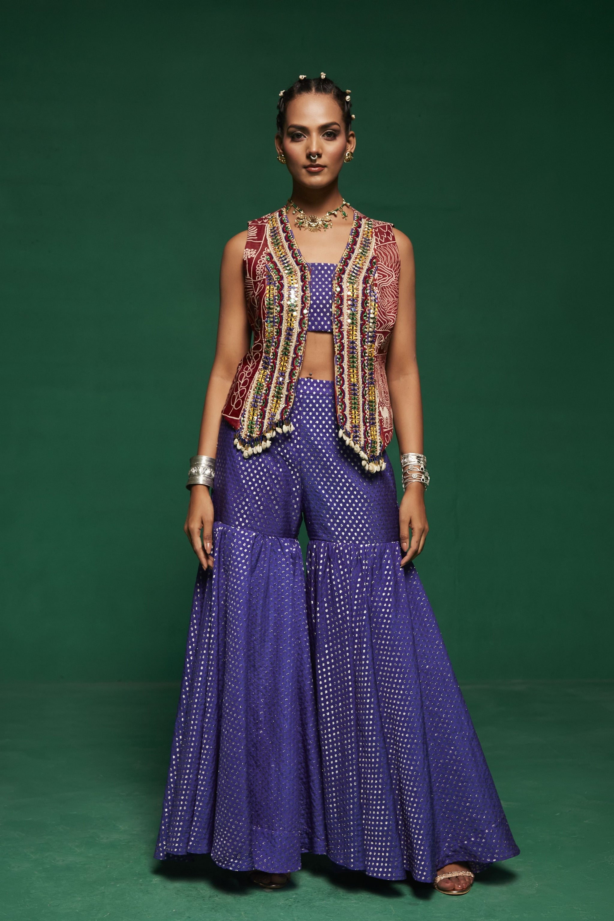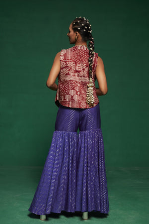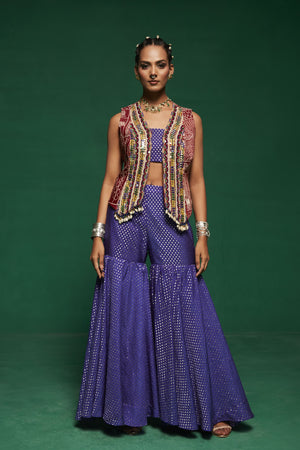 • This blue jacket style kurta paired with sharara pants & a tube top ,the kurta is embroidered with glass beads, pearls, mirror work, thread work, mirror work, sequins, beads and danglings are made with metal coins, handmade tassels, handmade bead balls.