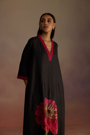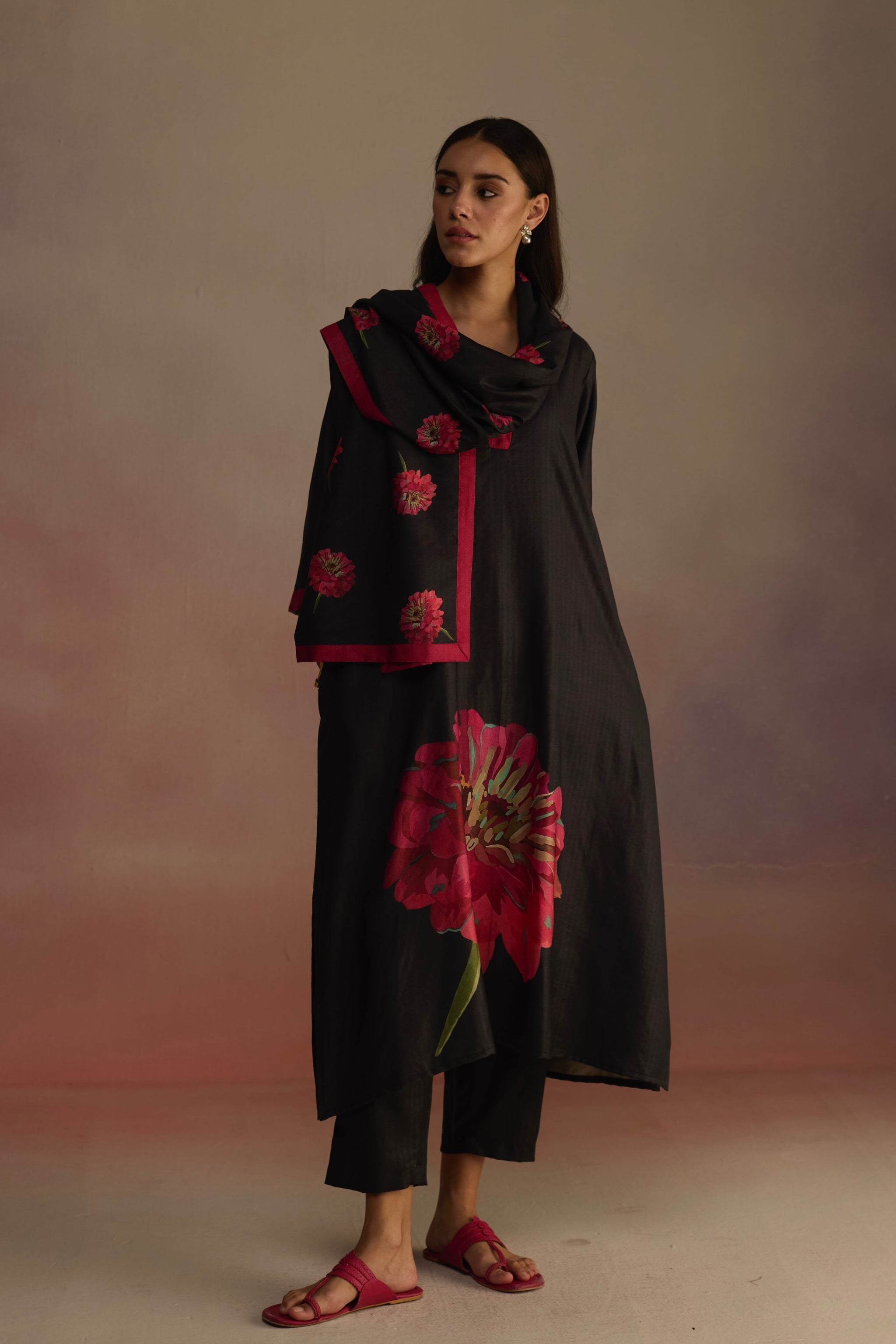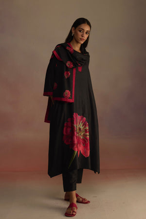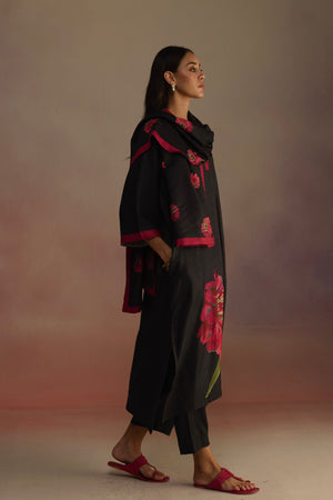 • Long a-line kurta with side slits, a v-neck, and watercolor hand-drawn floral motifs on the sweep. Features subtle contrasting borders on the sleeves and neck, paired with straight pants and a matching stole with floral details and a contrasting border. Perfect for a cozy winter look.