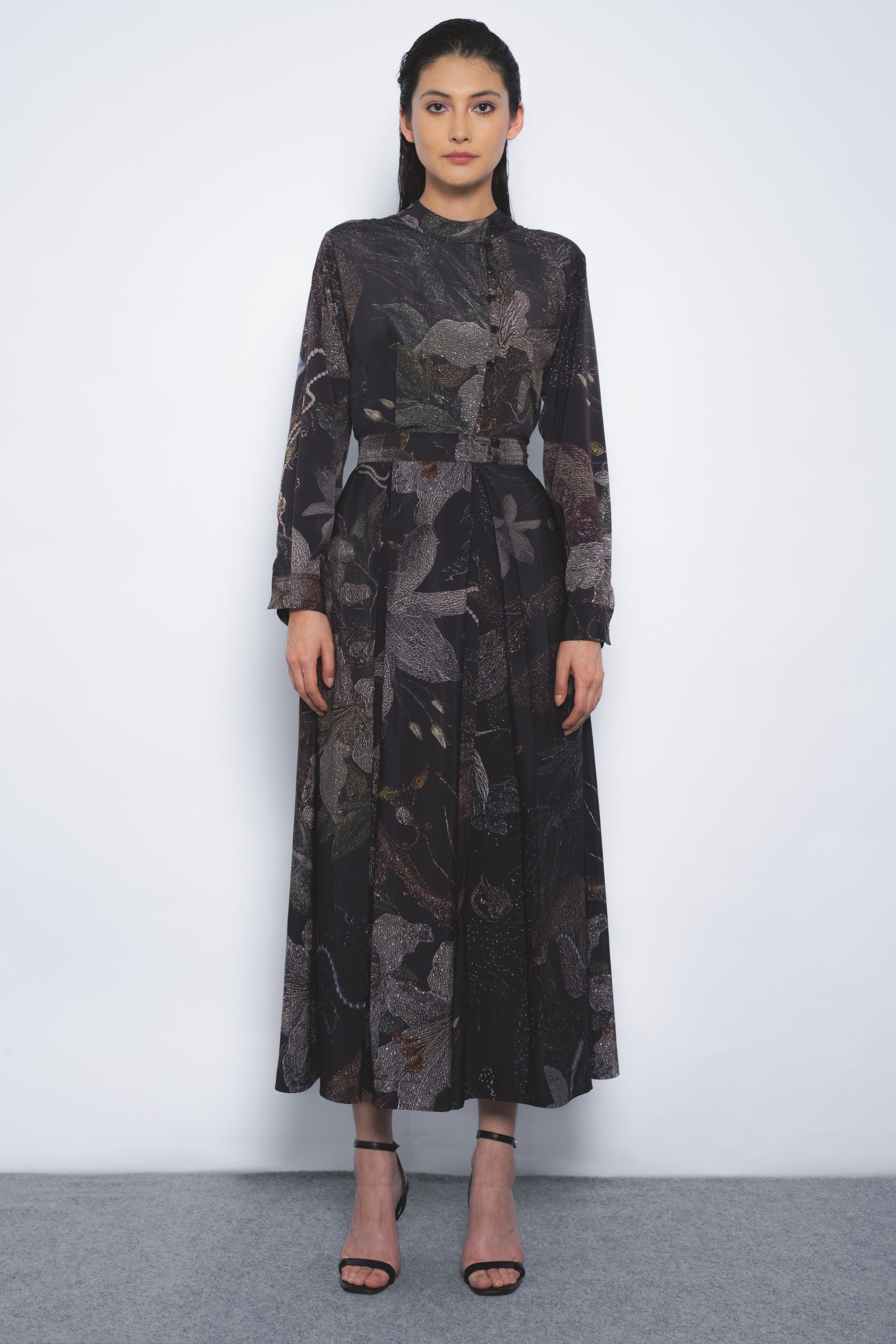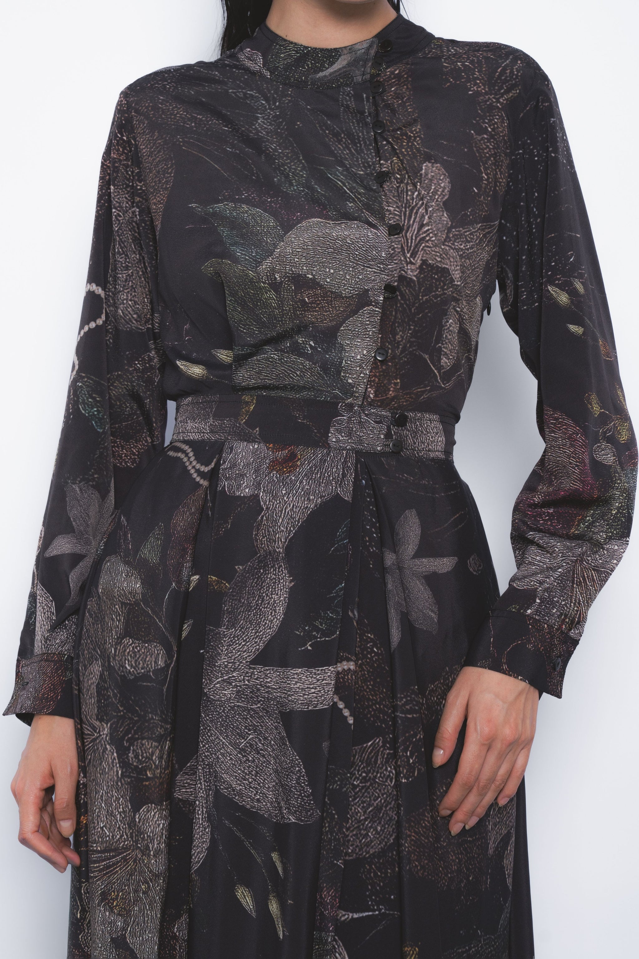 • Merging elements of vegetation, the sea, and the stars, this artistic print evokes a balance of elegance and boldness. The style reimagines a classic silhouette with a contemporary edge, defined by its asymmetrical placket placement.