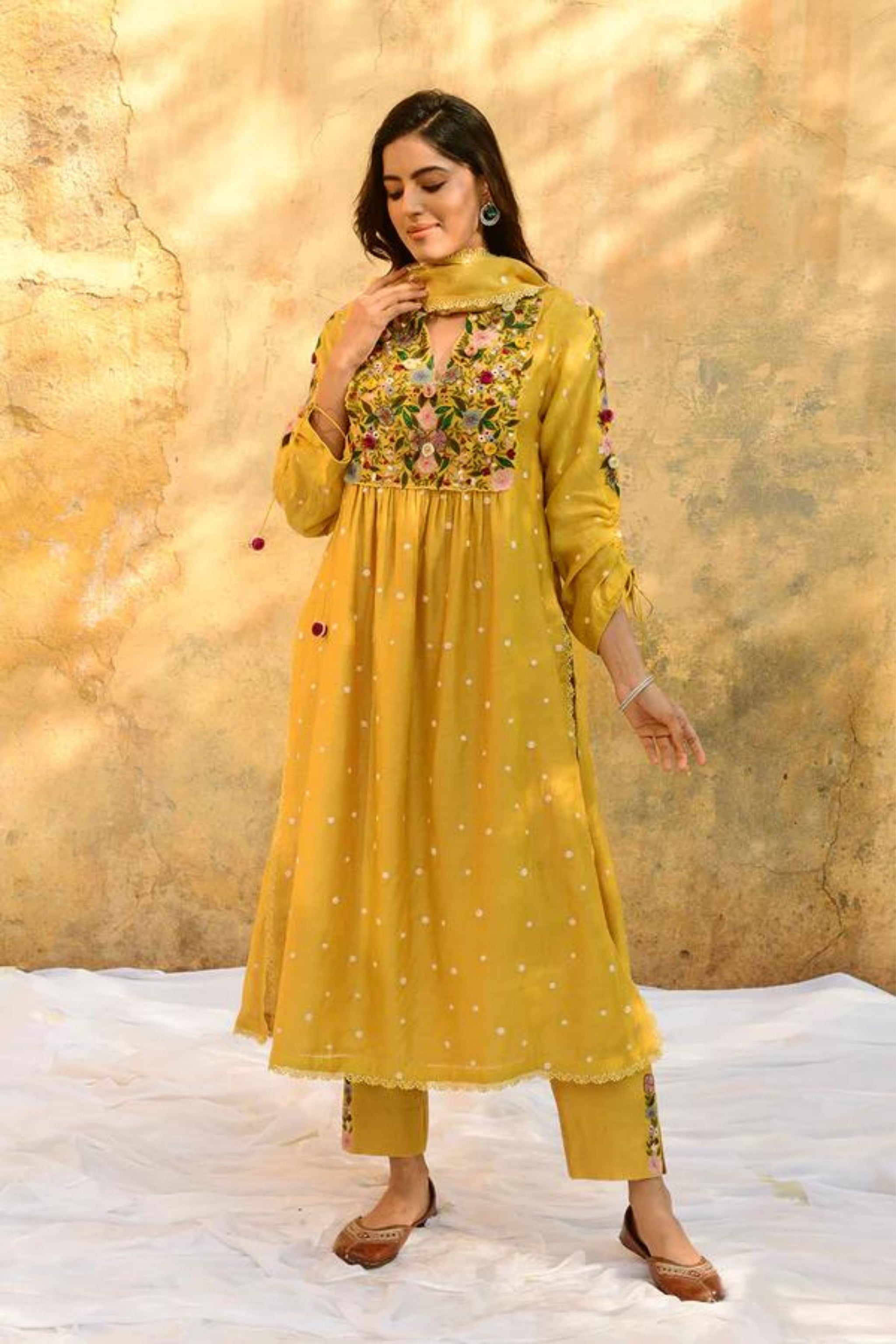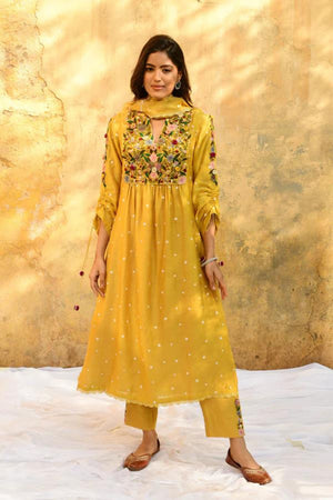 • This dreamy 2 pc kurta set comes with floral applique motifs and resham on the yoke, with slight gathers at the waist, highlighted with handmade 3d rosettes in organza. The sleeves have a pull up detail with handcrafted tassles. The embroidred pants are a narrow fit. Optional embroidered organza dupatta available on request.