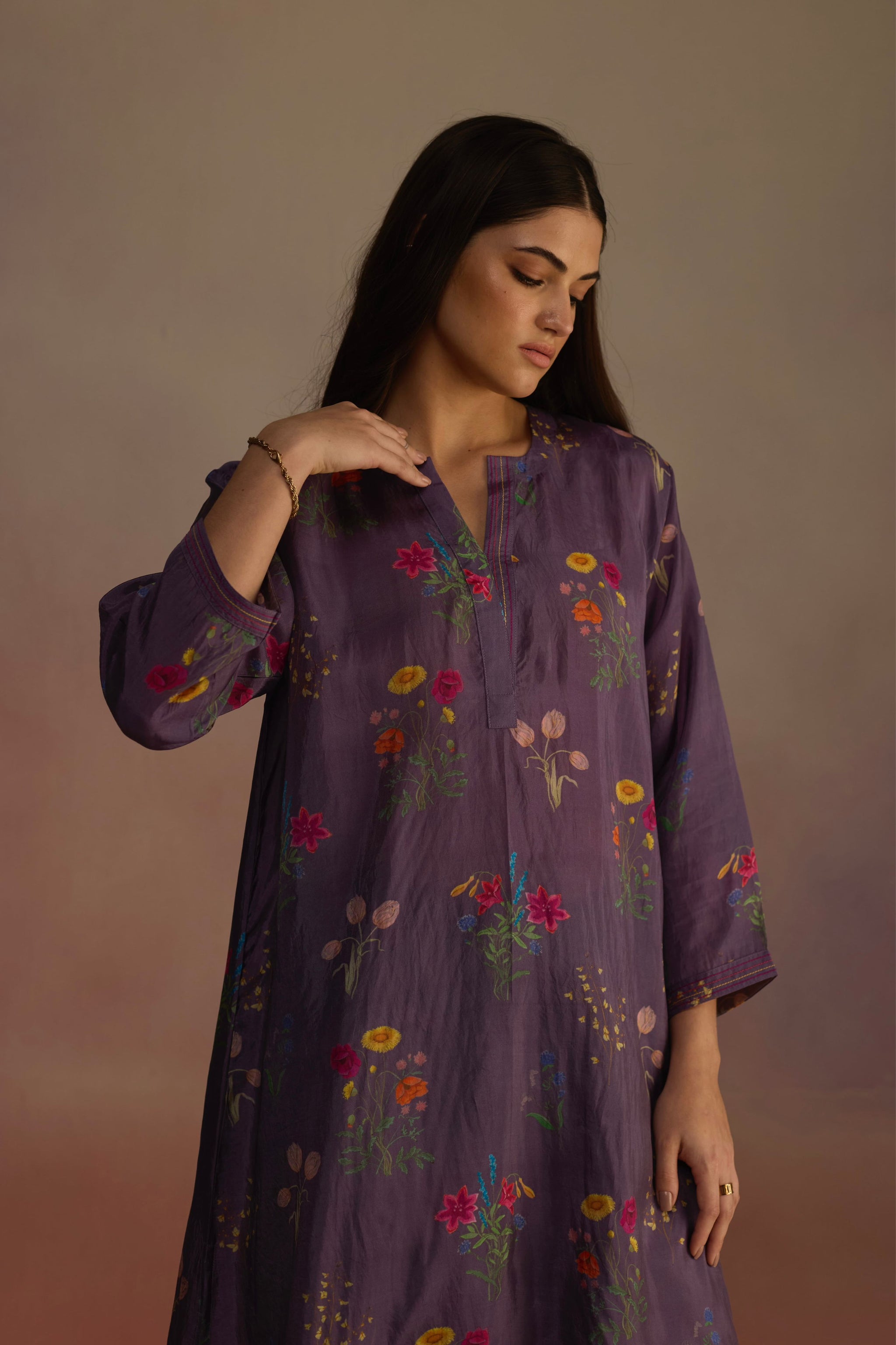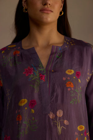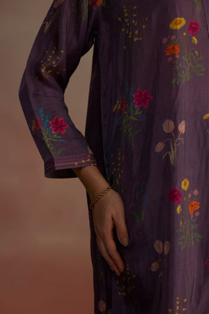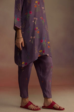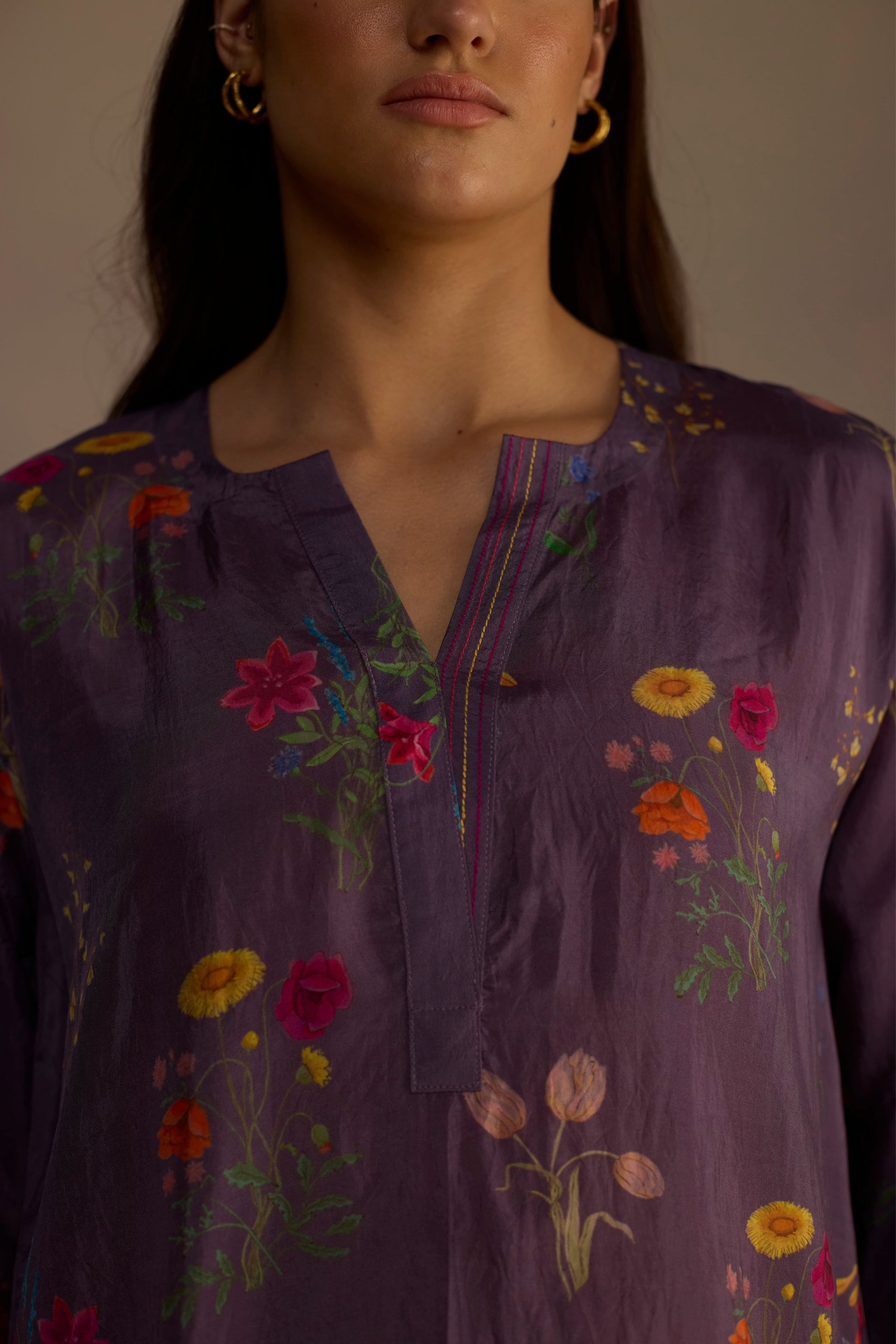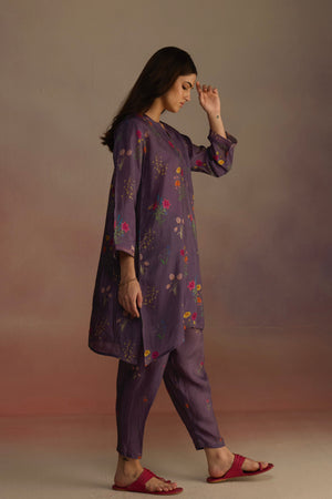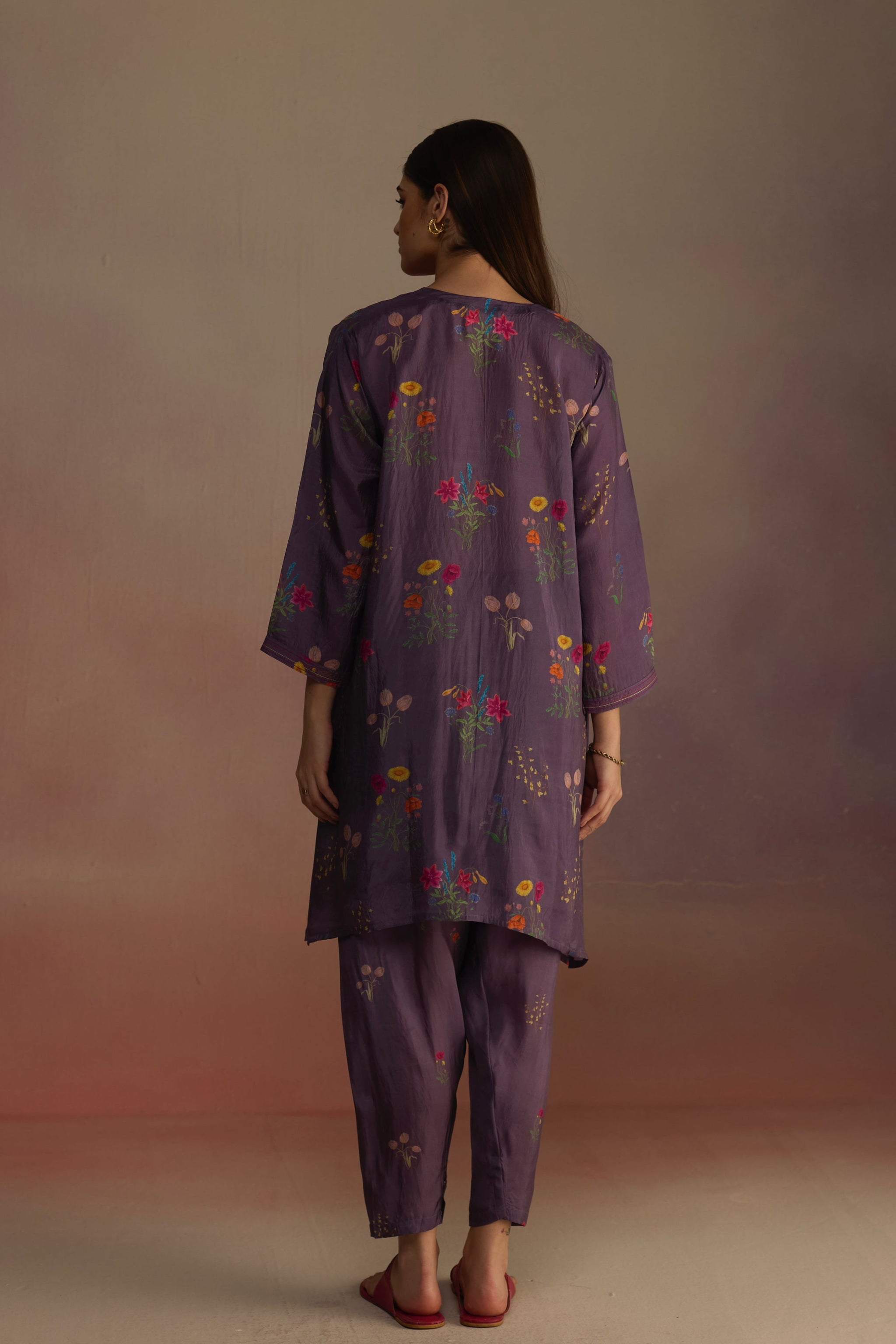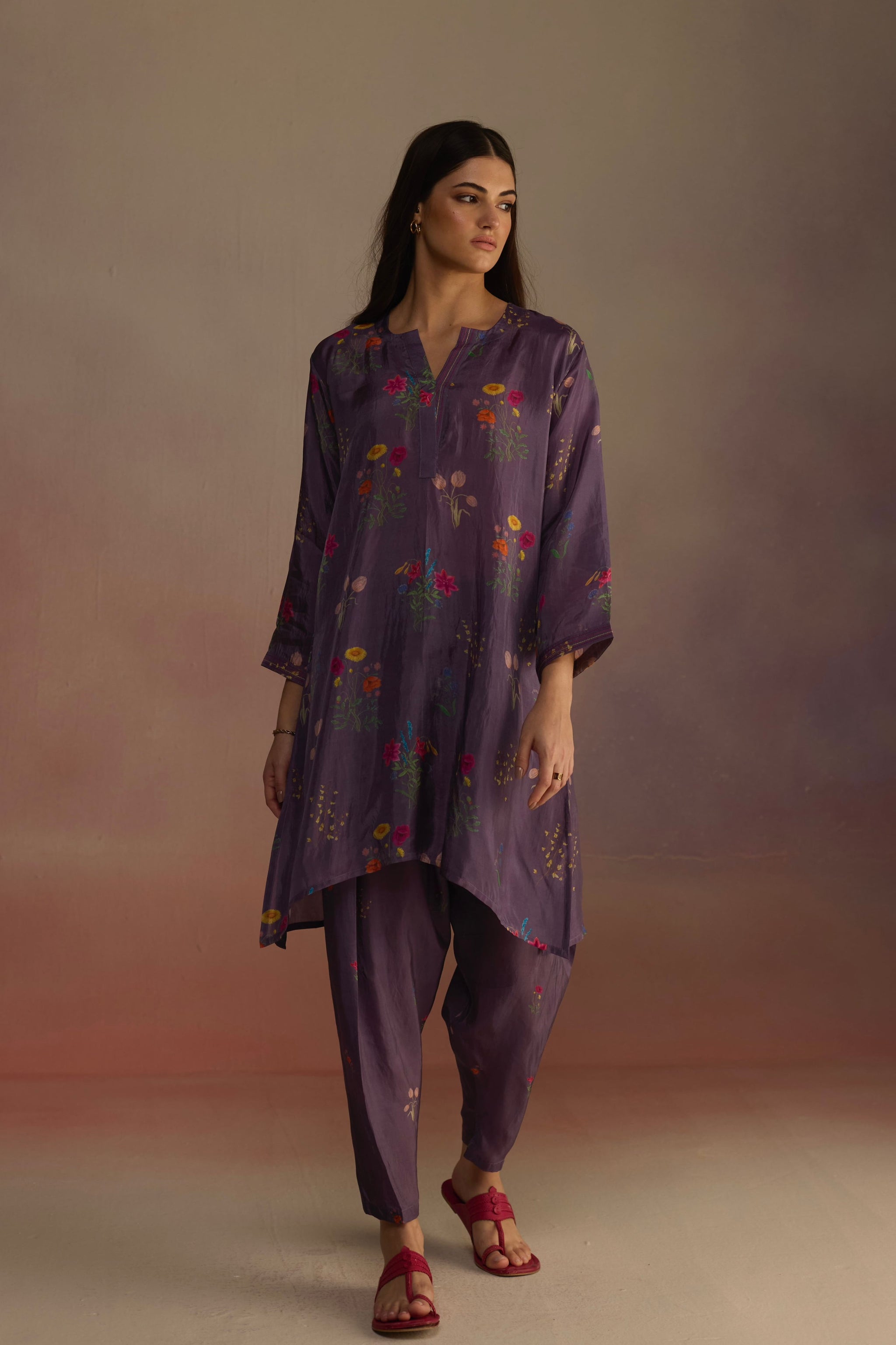 • The zaira short kurta set in habutai silk, features hand-sketched watercolor florals and subtle detailing on the neck and cuffs. Paired with tapered dhoti pants, its a perfect choice for any occasion.