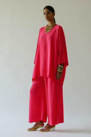 • Zoey pink tunic set. Kaftan style top, v-neck, kaftan sleeves and asymmetric hemline paired with matching flared pants. Top length - 32".