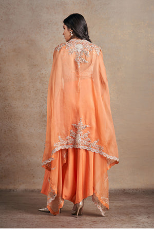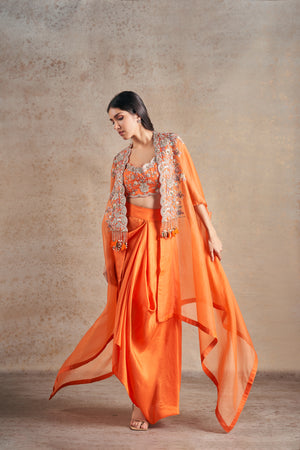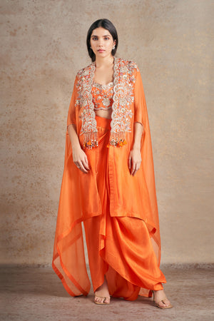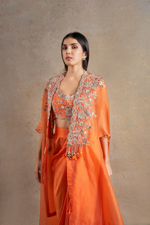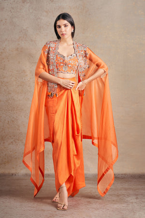 • Wrap yourself in timeless elegance with this stunning orange cape style, meticulously embellished with intricate dori and pearl embroidery. Experience the epitome of sophistication in this thoughtfully curated regal ensemble from Stotram, where luxury seamlessly intertwines with simplicity.