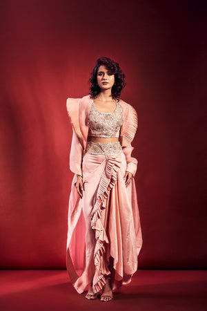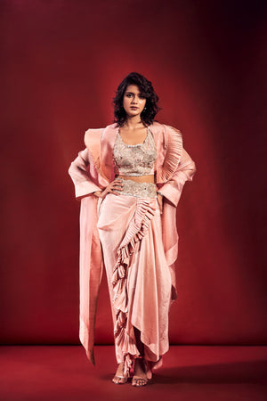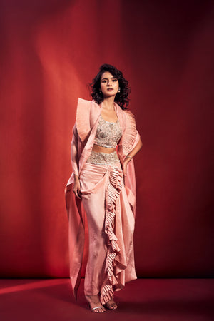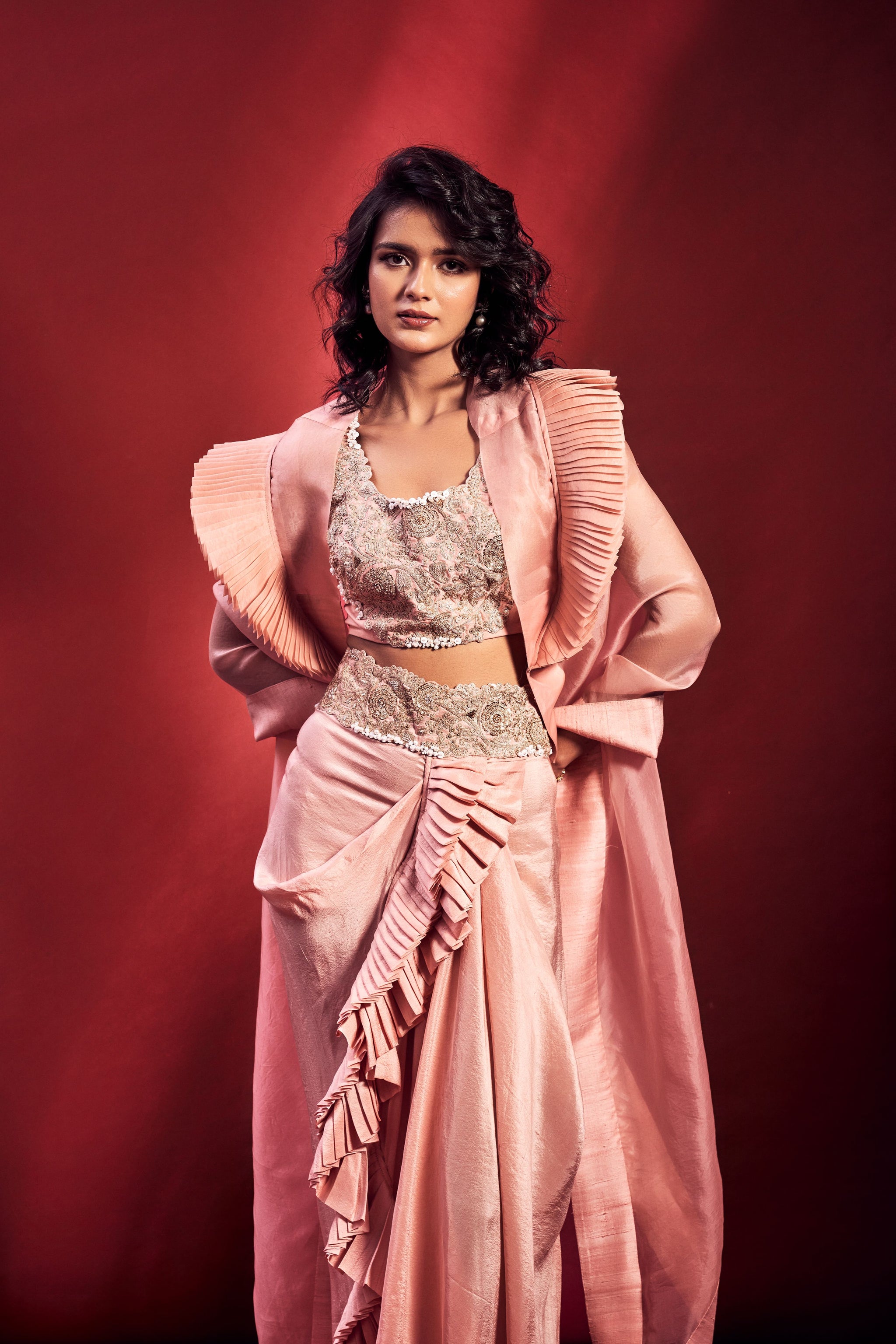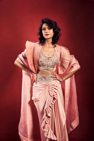 • Dramatic Peach Cape Set Adorned With Delicate Dori And Marodi Embroidery Paired With A Matching Embroidered Blouse And A Draped Skirt.