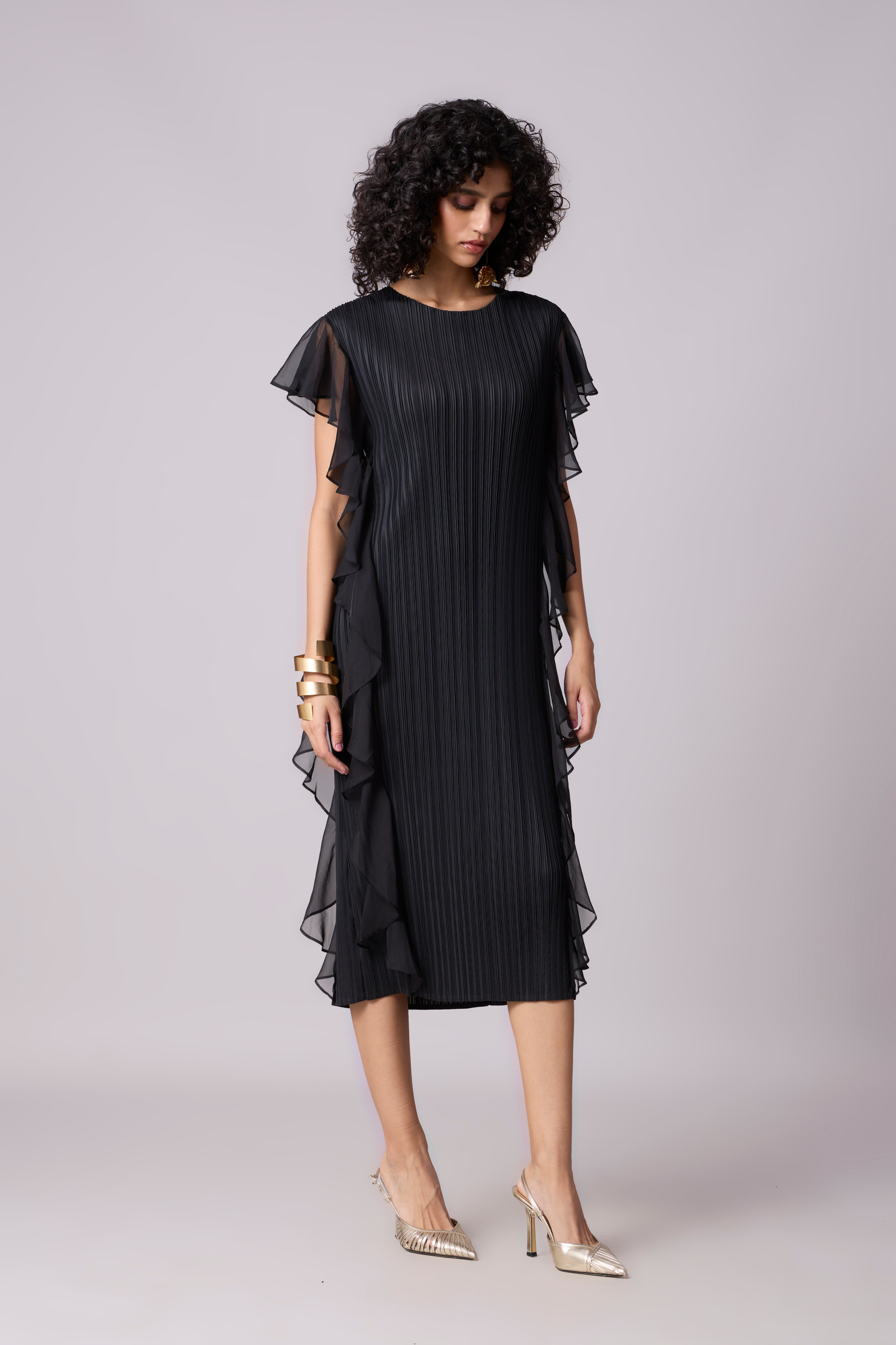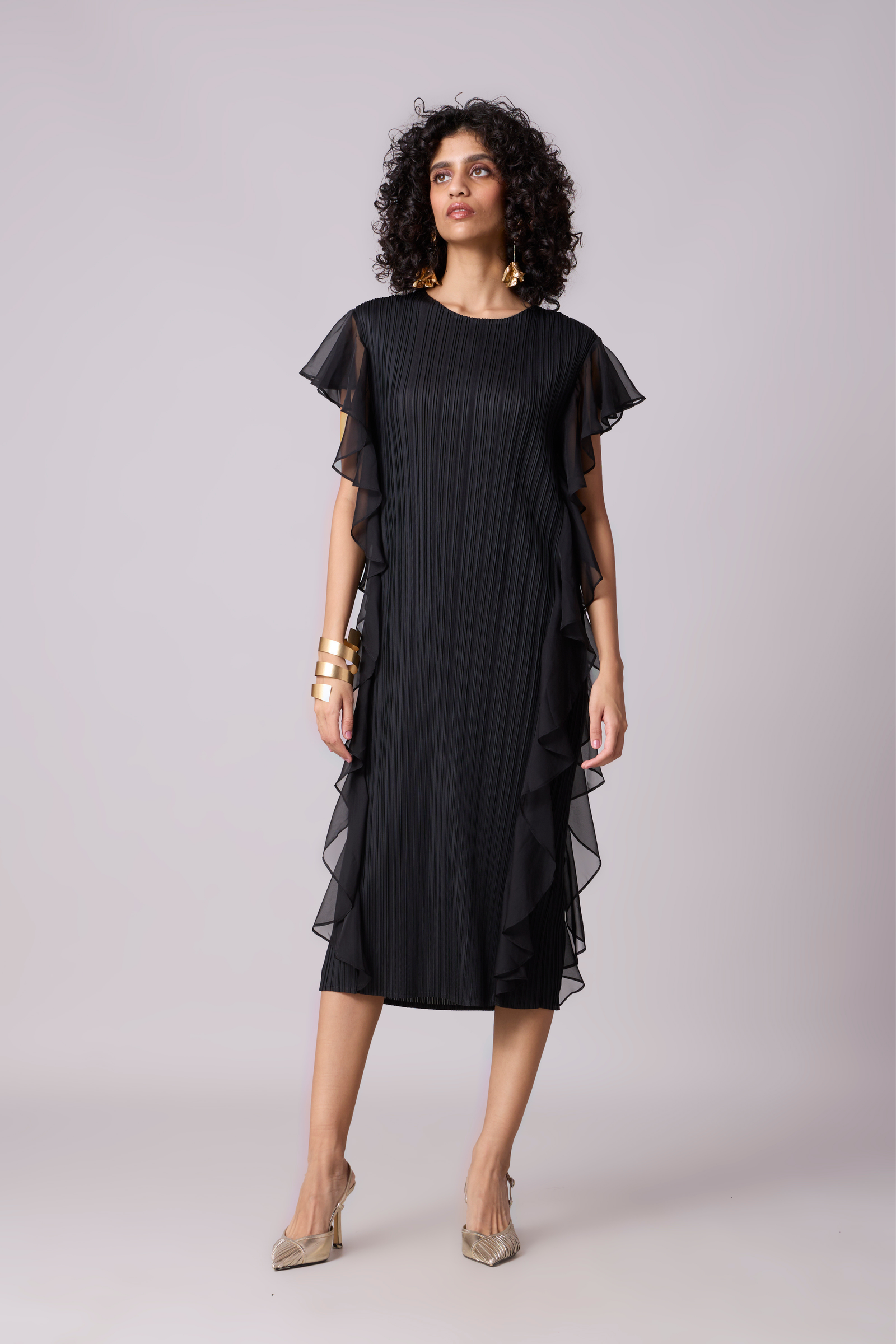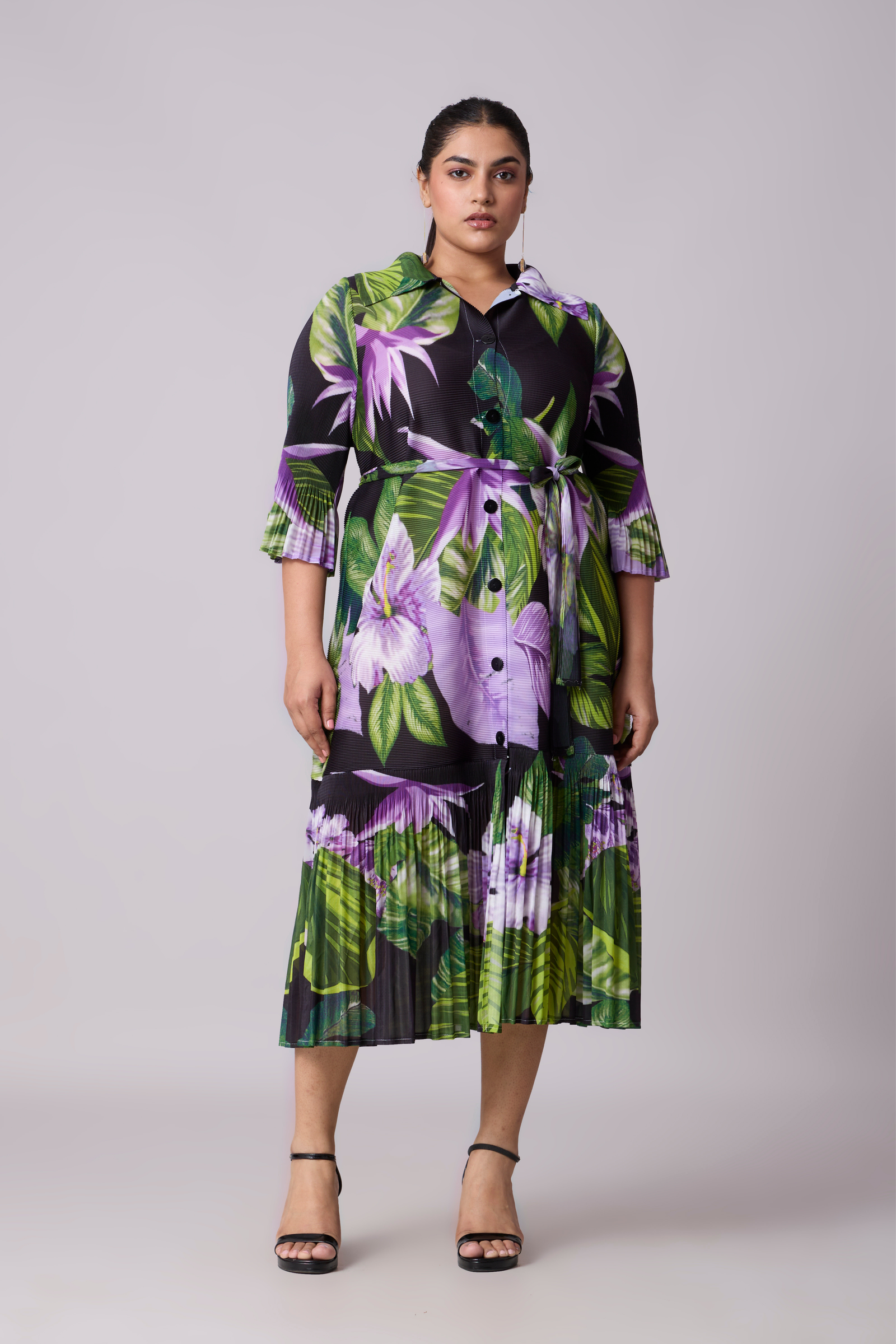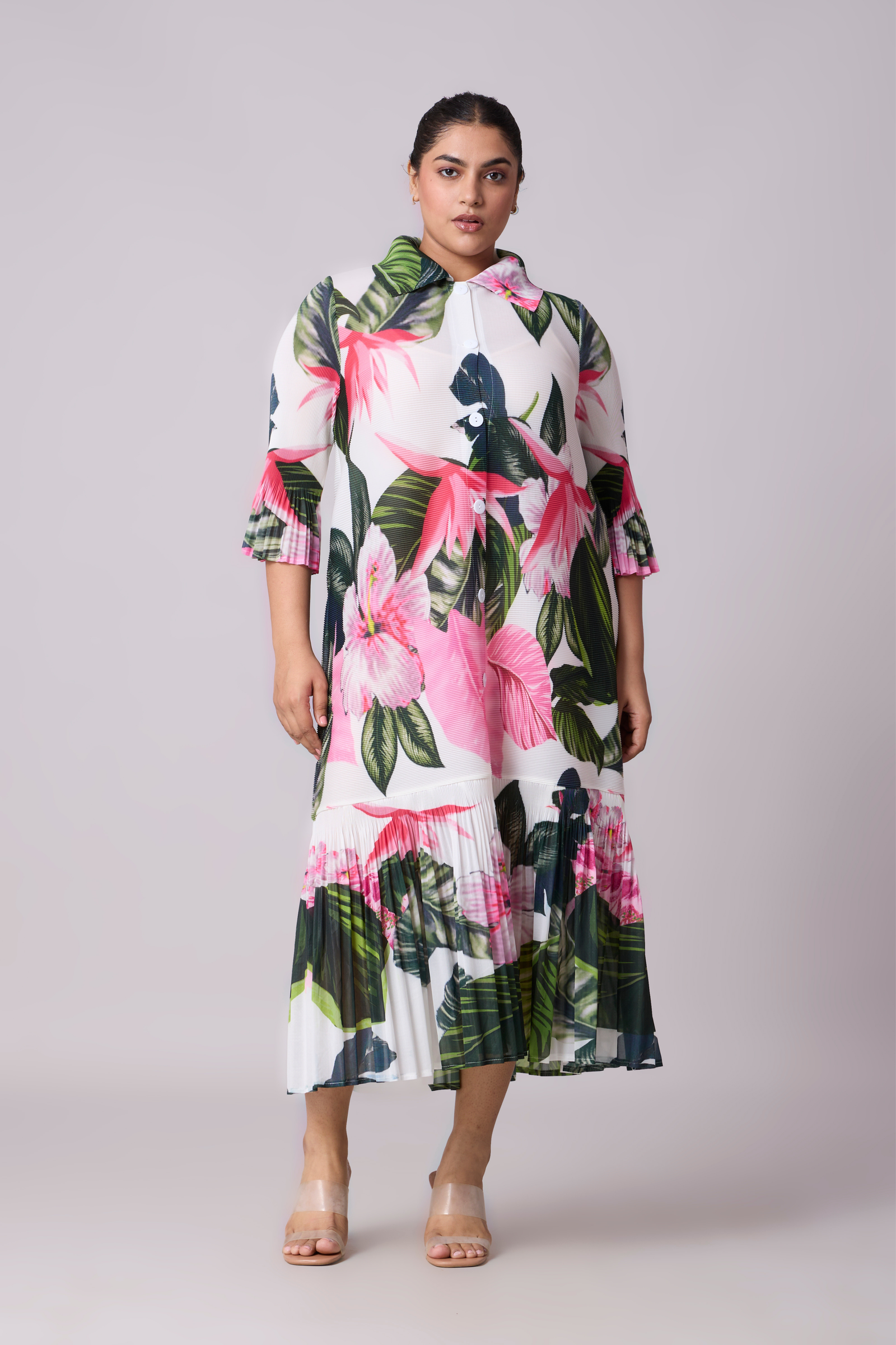 • A vertical pleated shift dress with tulip cut at bottom. Length of Dress - 47 inches. Free size (one size fits all). Fits S to XL.