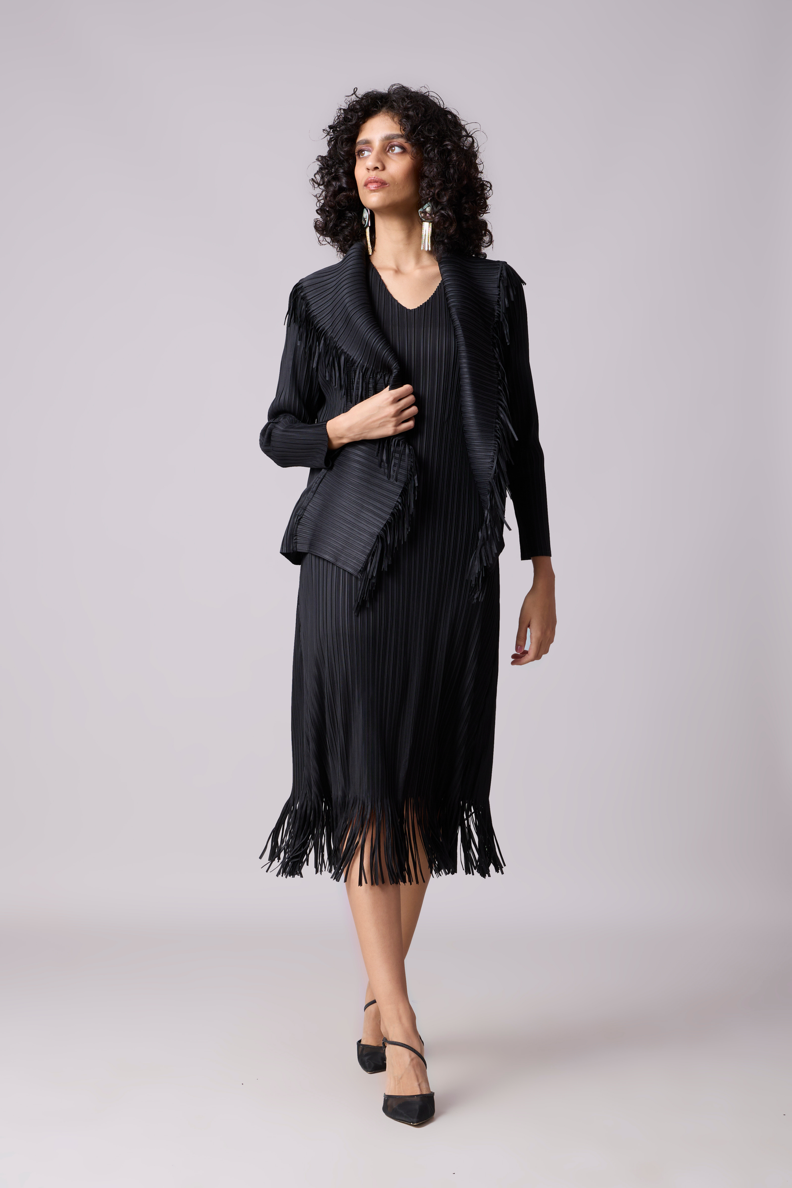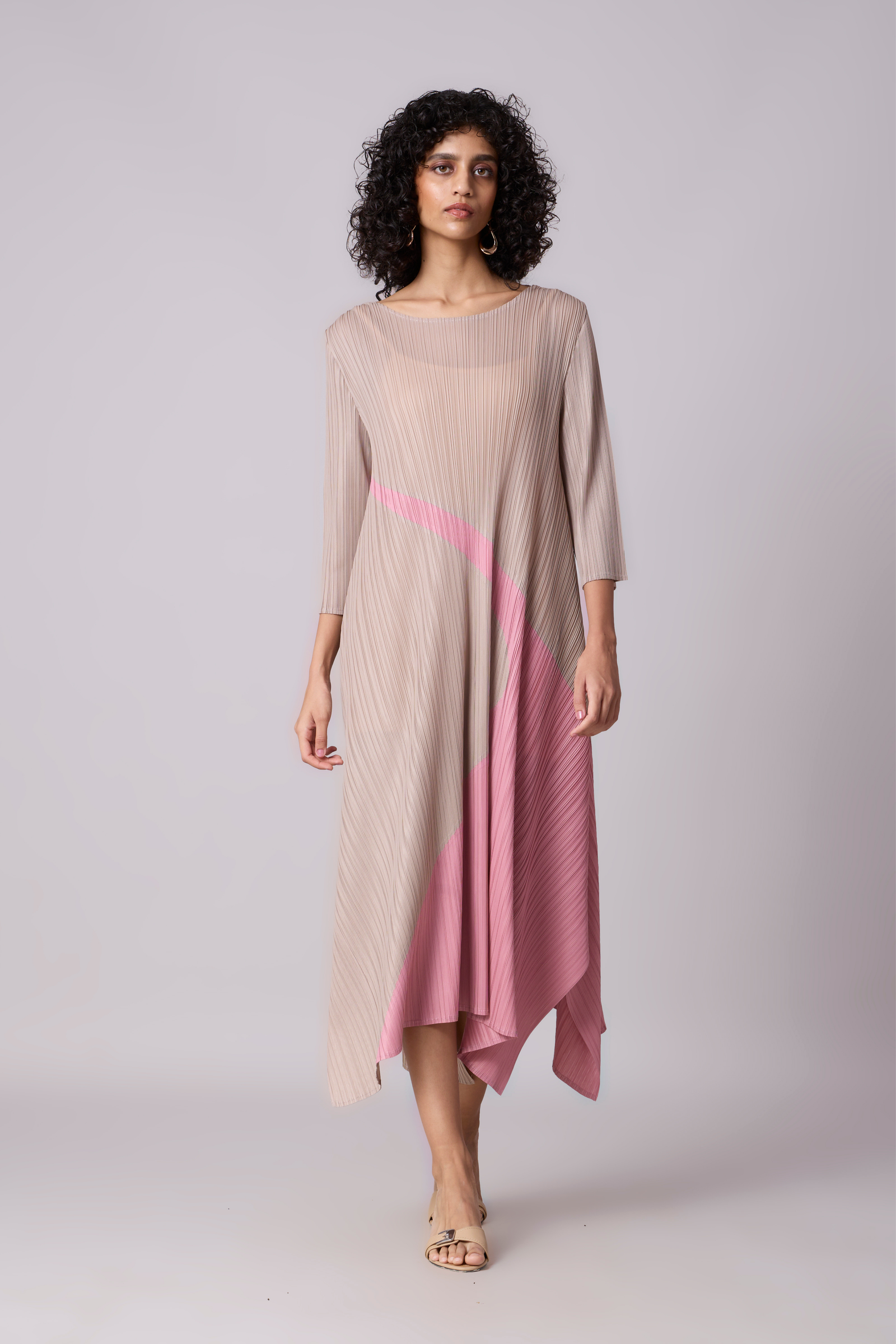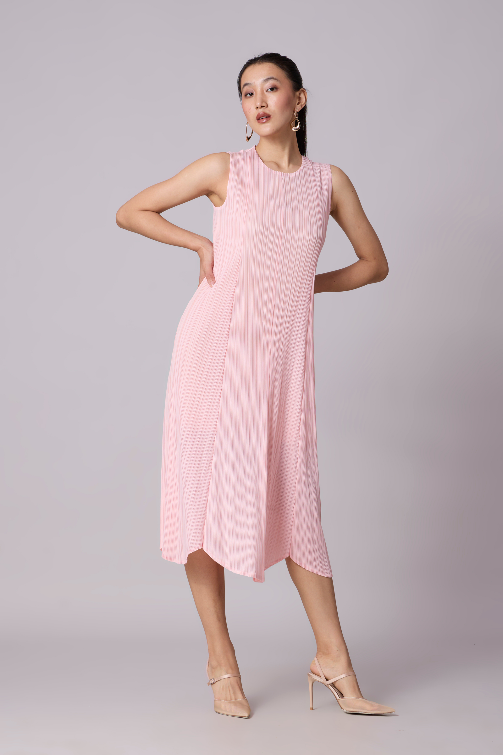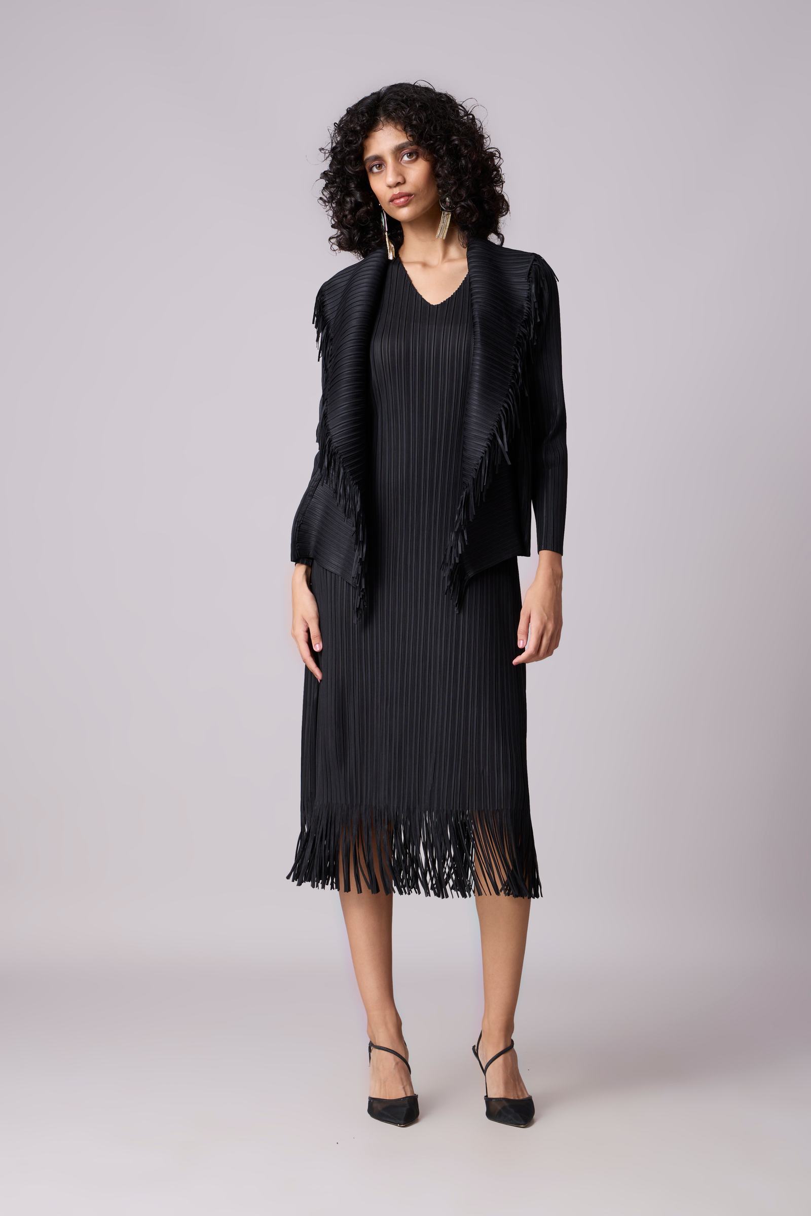• A vertical pleated shift dress with tulip cut at bottom. Length of Dress - 47 inches. Free size (one size fits all). Fits S to XL.