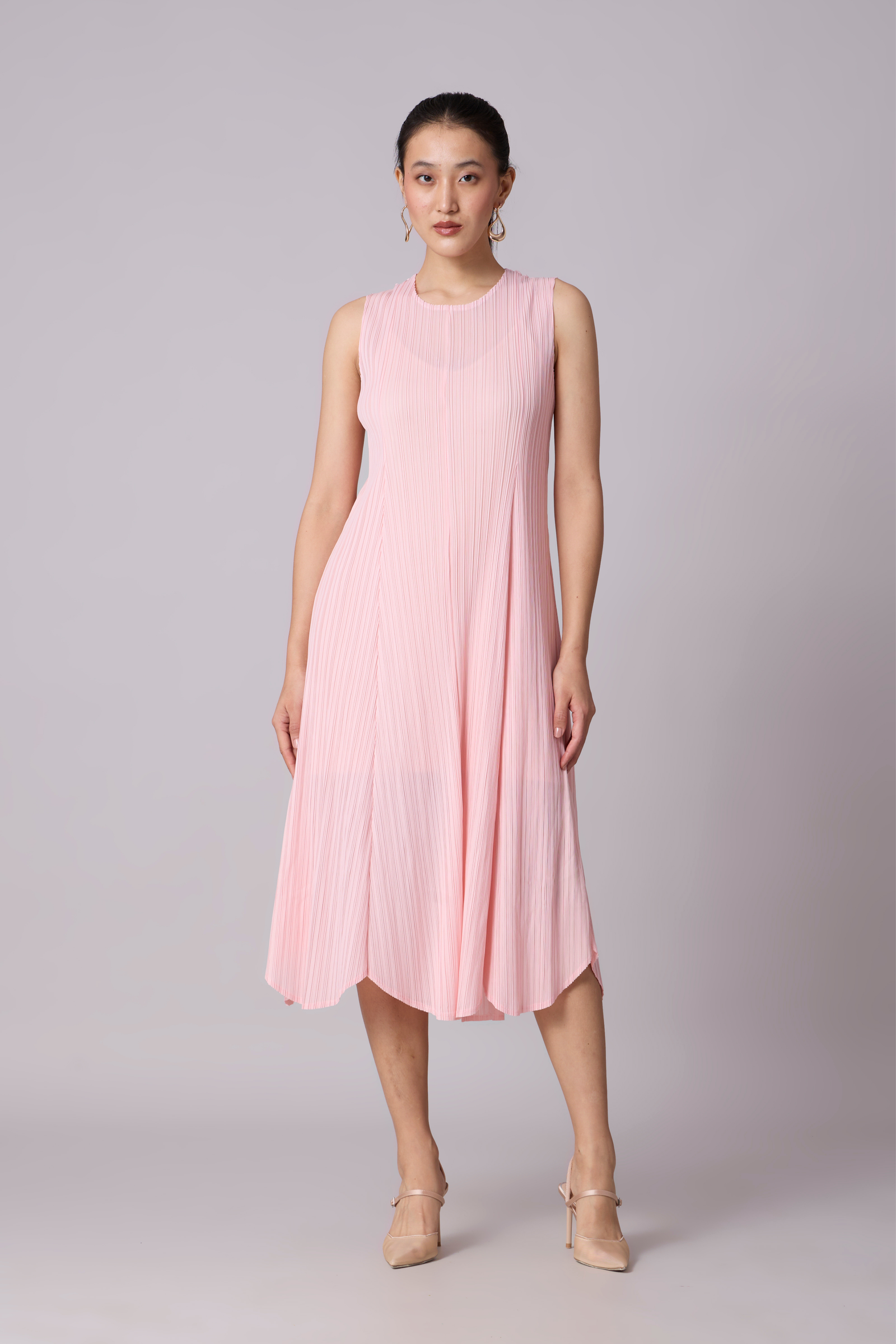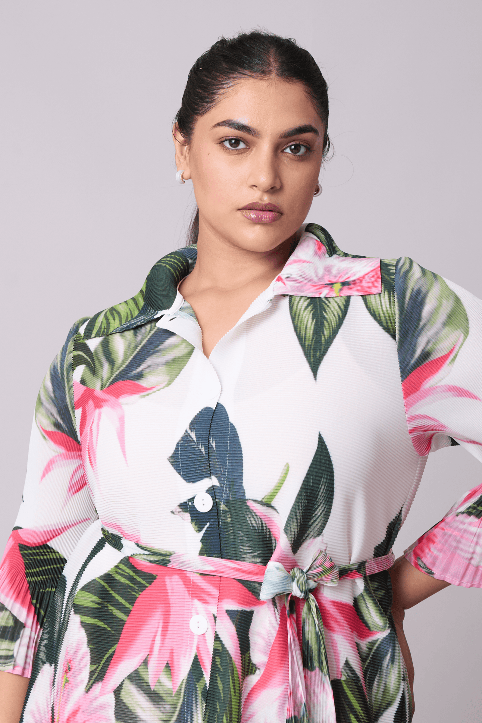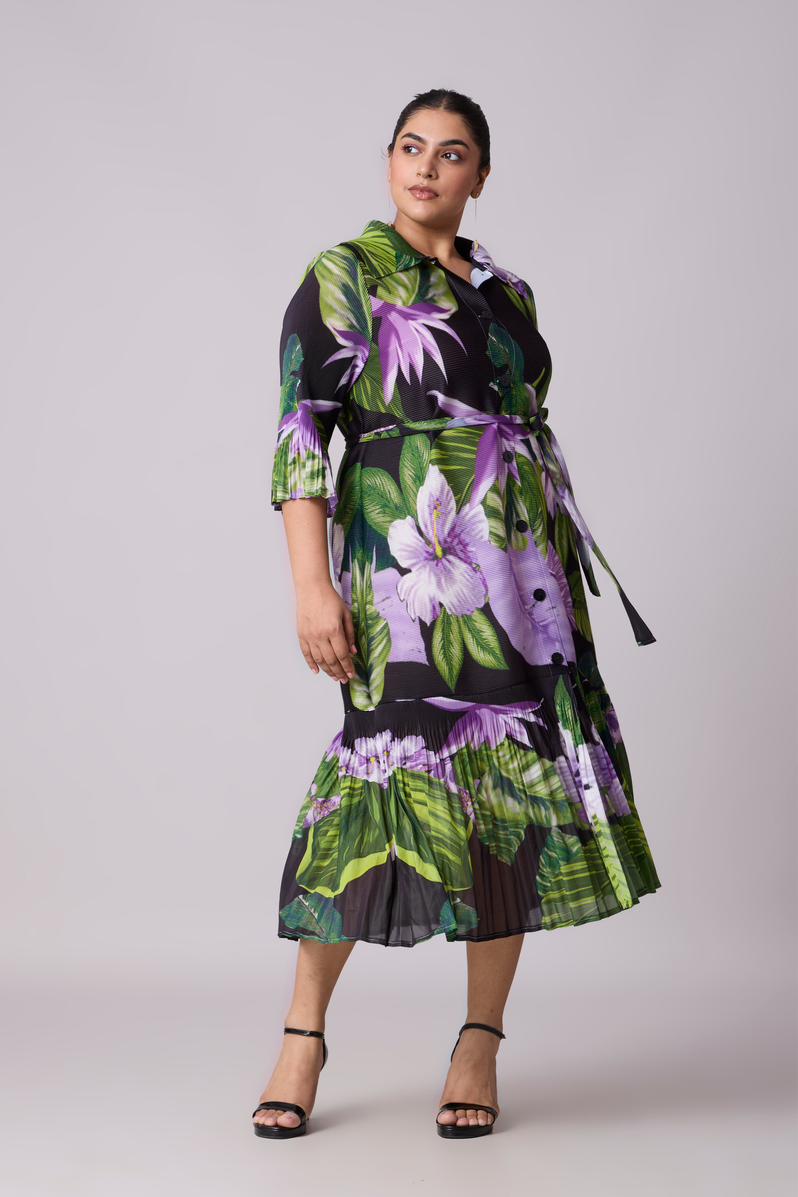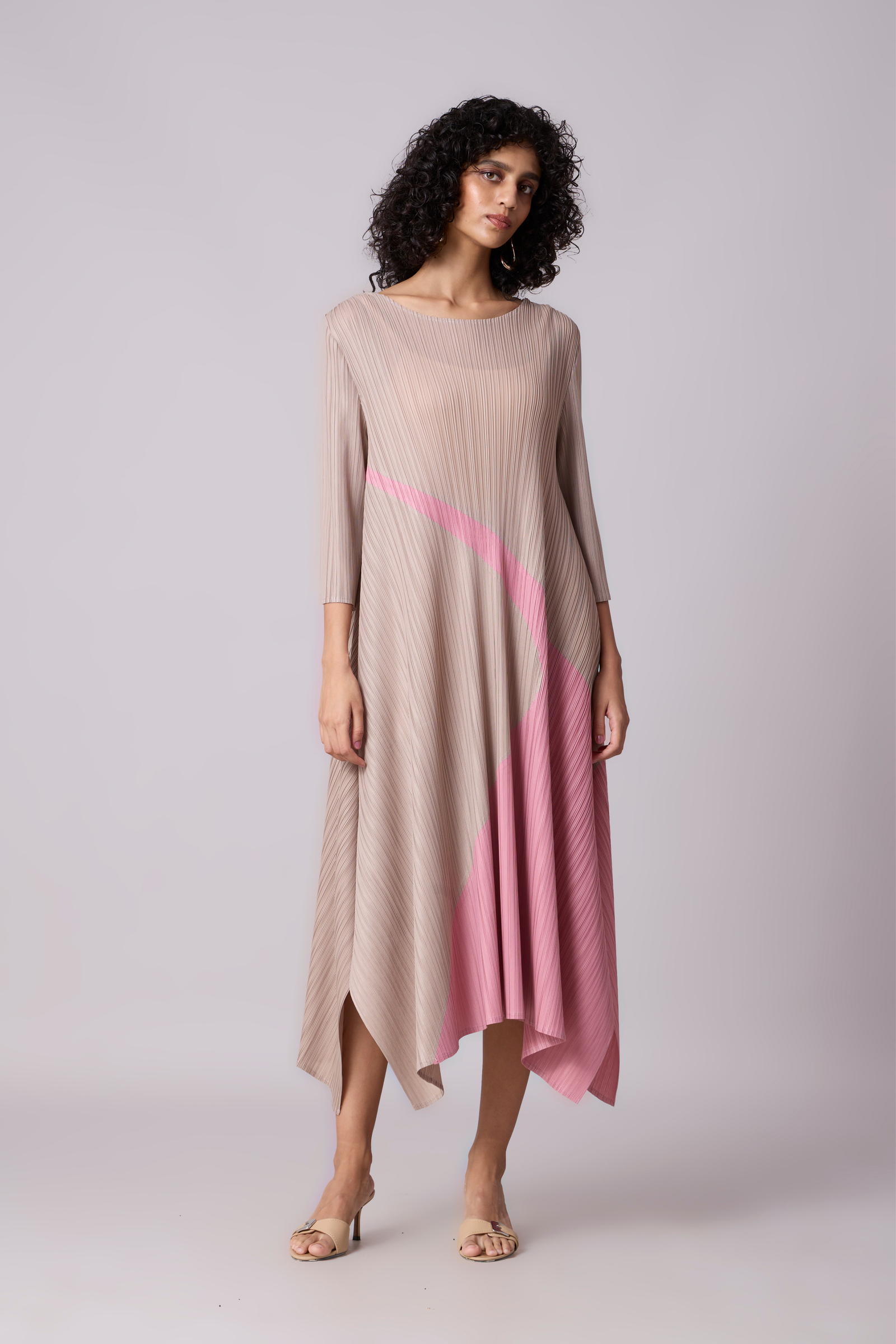 • A vertical pleated shift dress with tulip cut at bottom. Length of Dress - 47 inches. Free size (one size fits all). Fits S to XL.
