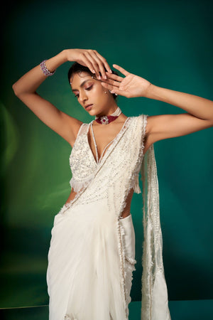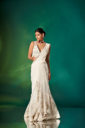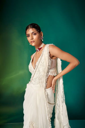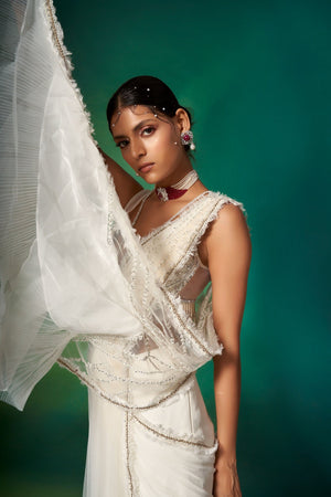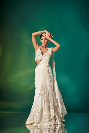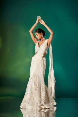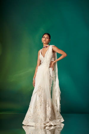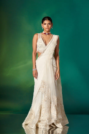 • An Amalgamation Of Delicate Detailing & Effortless Silhouette, Our Ivory Draped Saree Is An Ideal Outfit For The Wedding Season With A Frill Textured Pallu, And An Embroidered Blouse & Skirt Featuring Modern Embroidery.