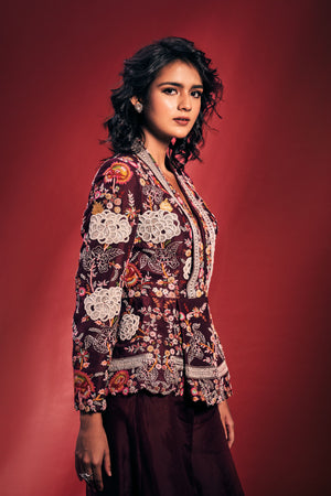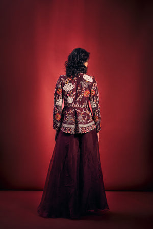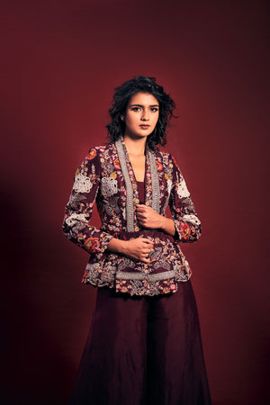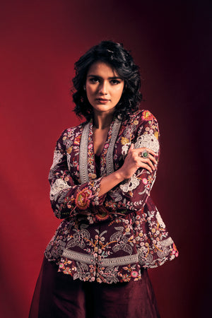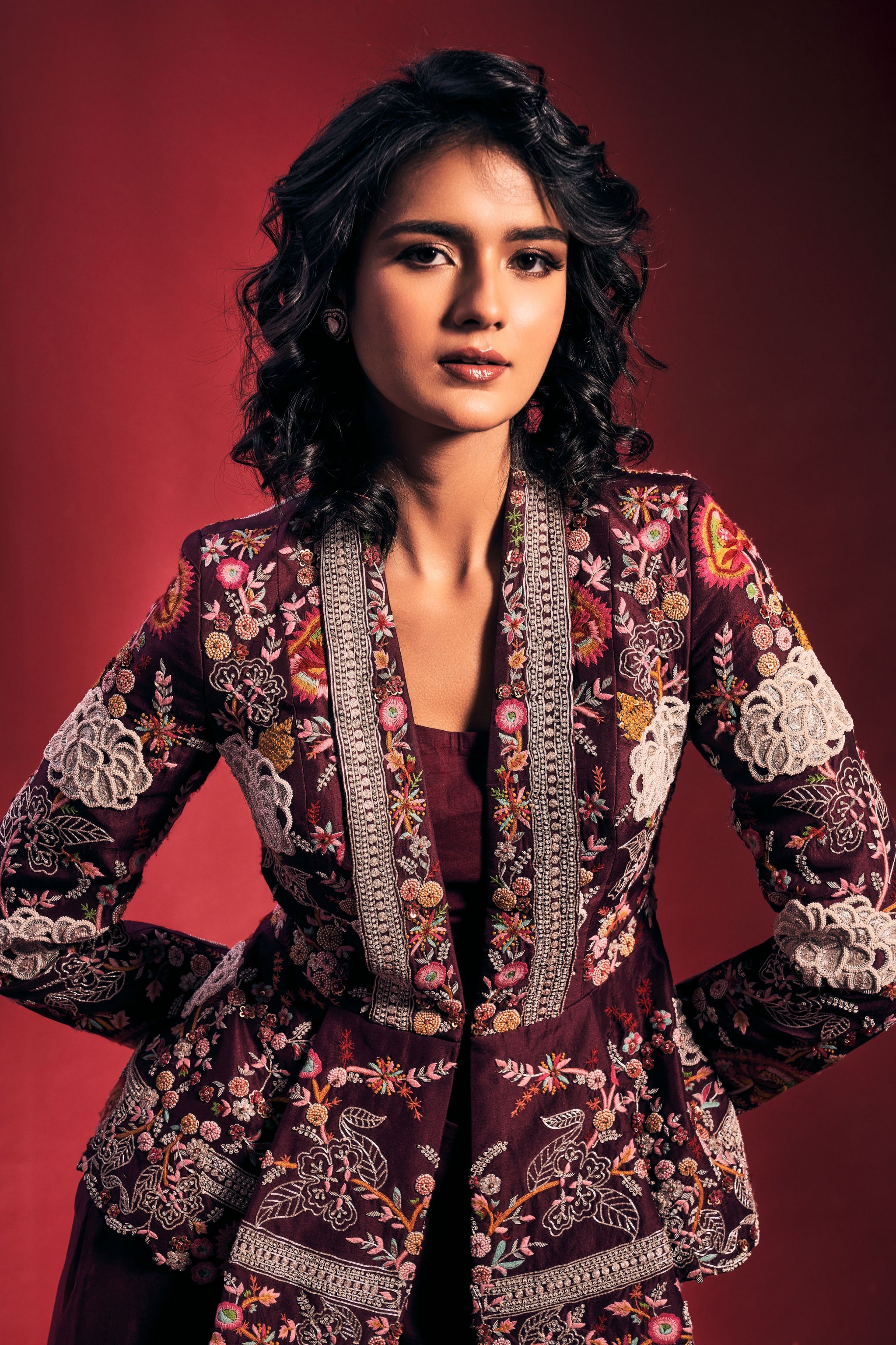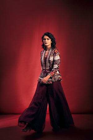 • Contemporize Your Festive Closet With This Wine Jacket Set. Crafted In Silk And Organza, This Set Comes With An Hand Embroidered Jacket In Resham Paired With A Bustier And Palazzo.