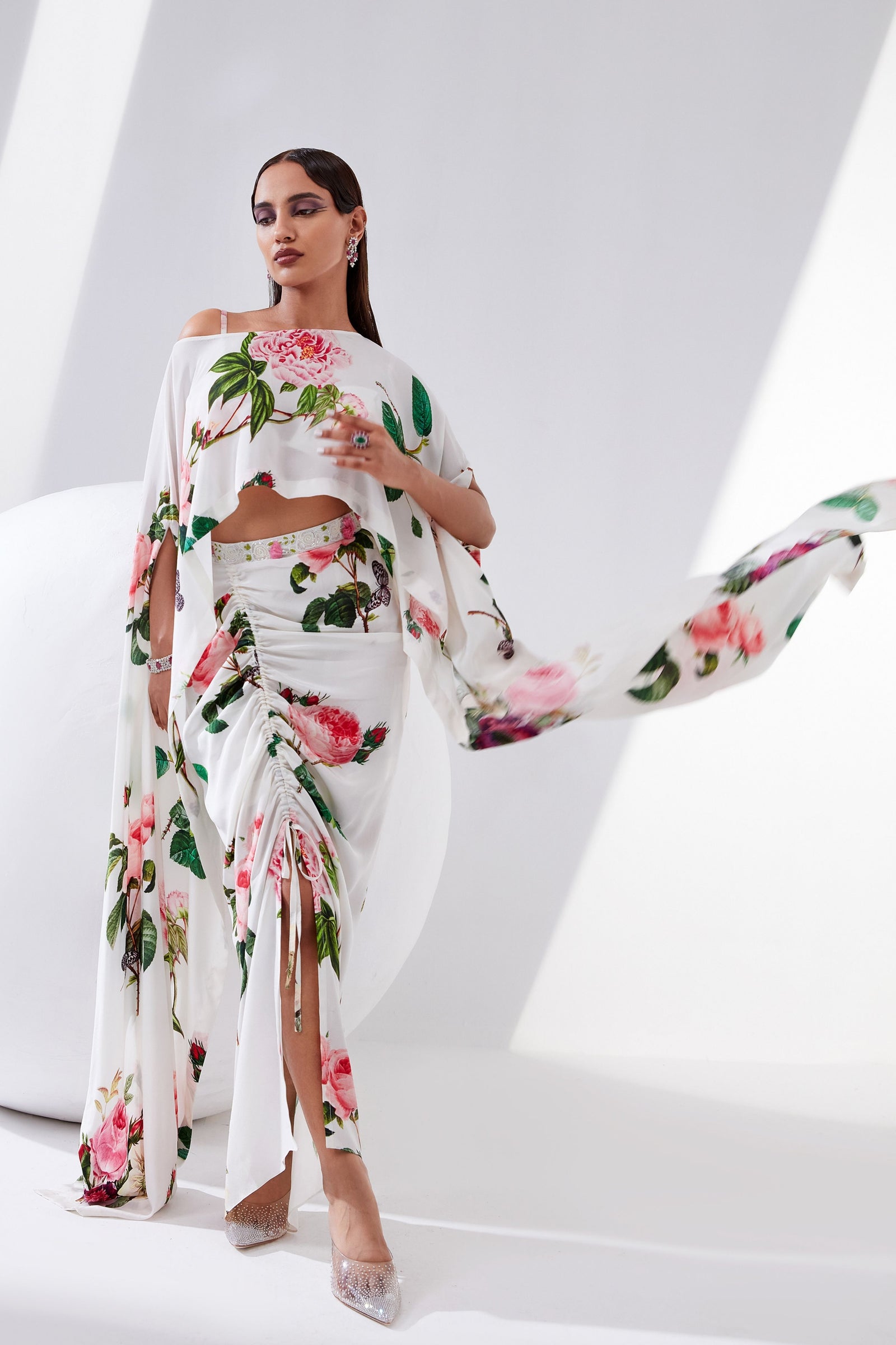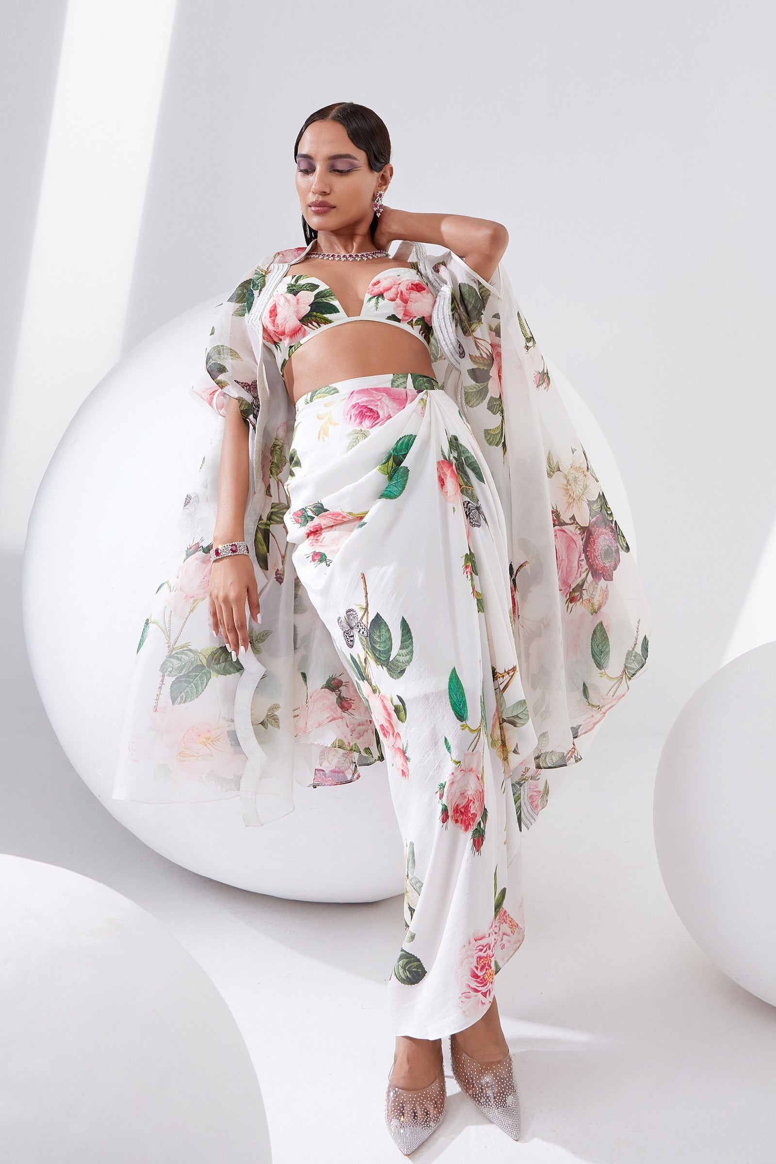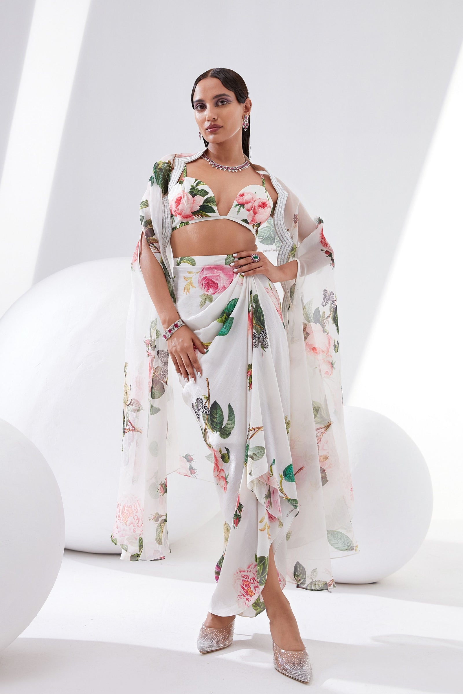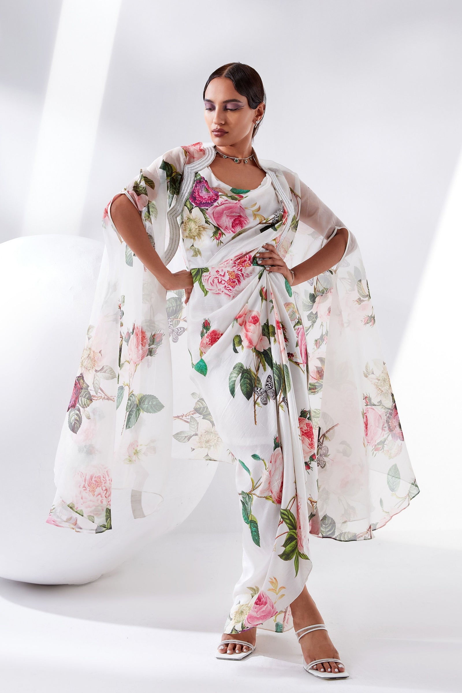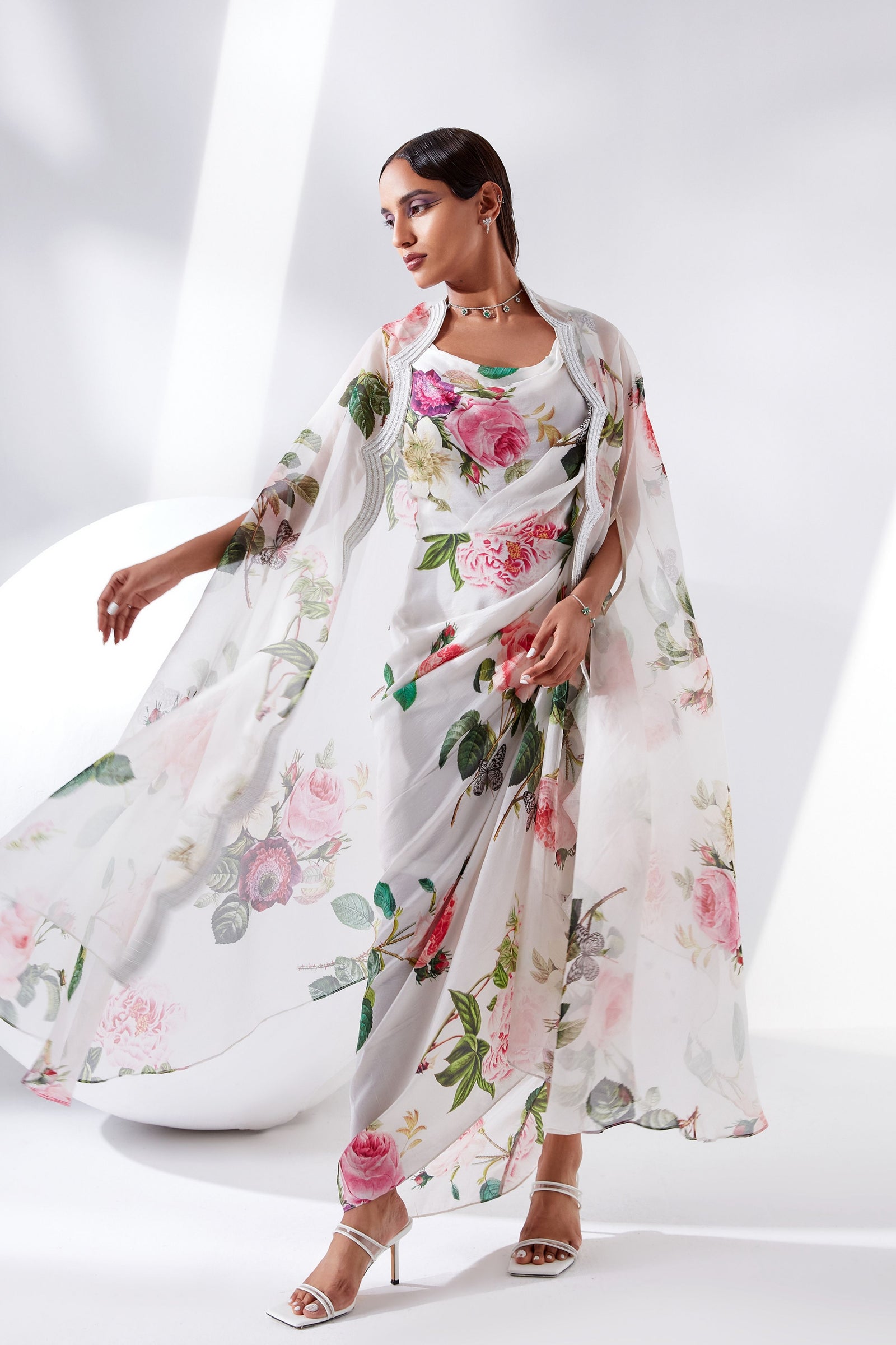 • Botanical print organza cape with scalloped border hand-embroidered with naqshi and fluted beads paired with a draped dress
