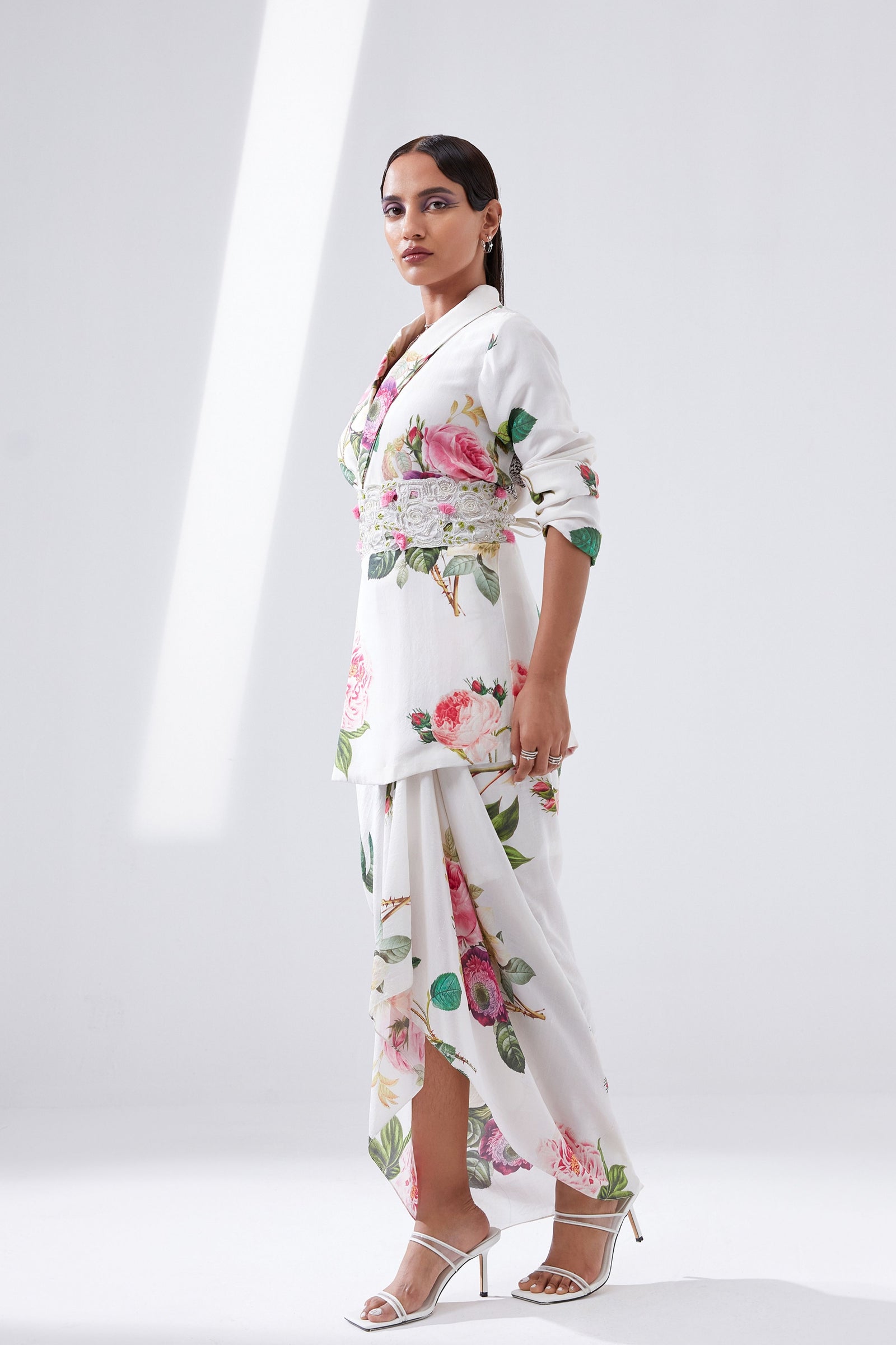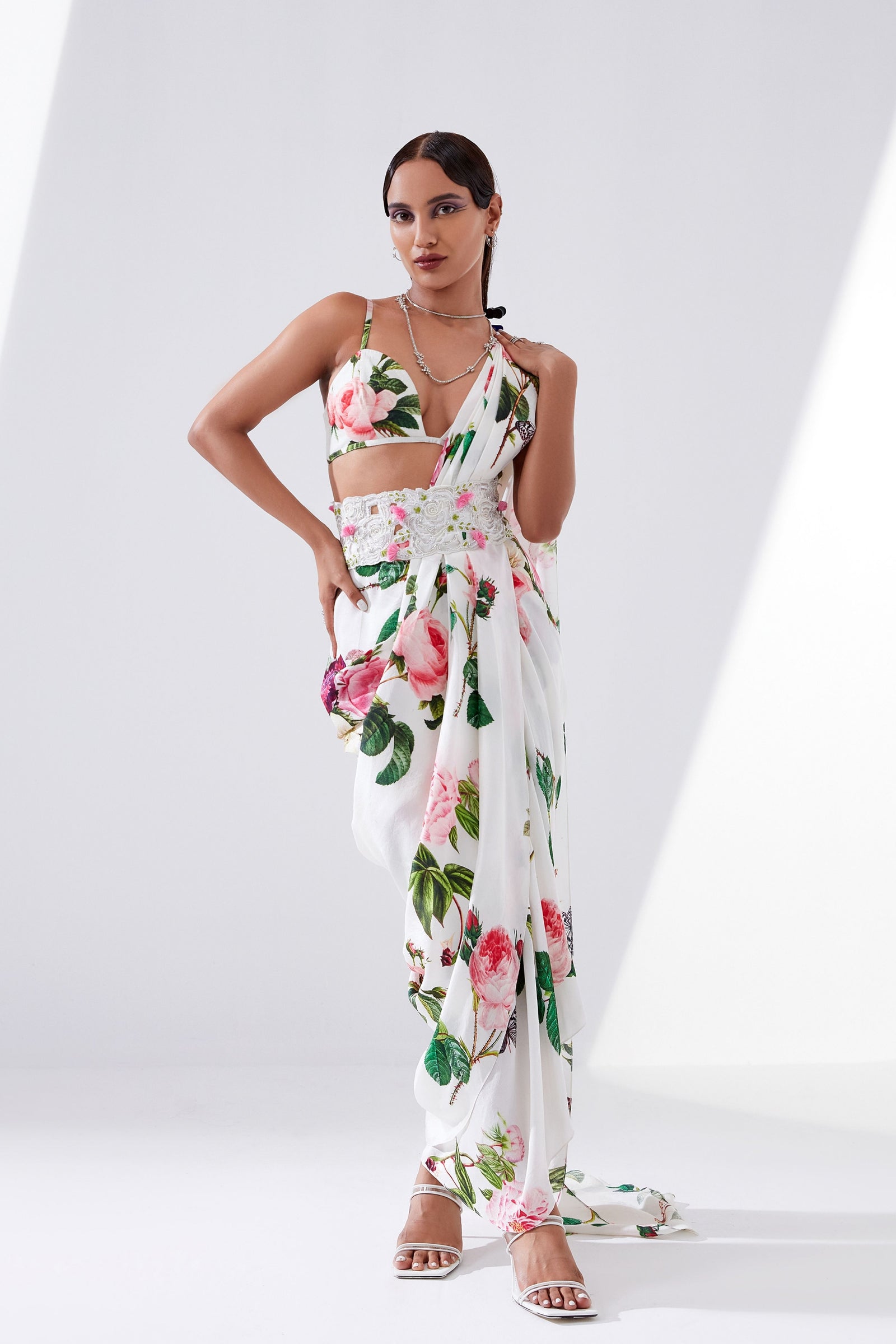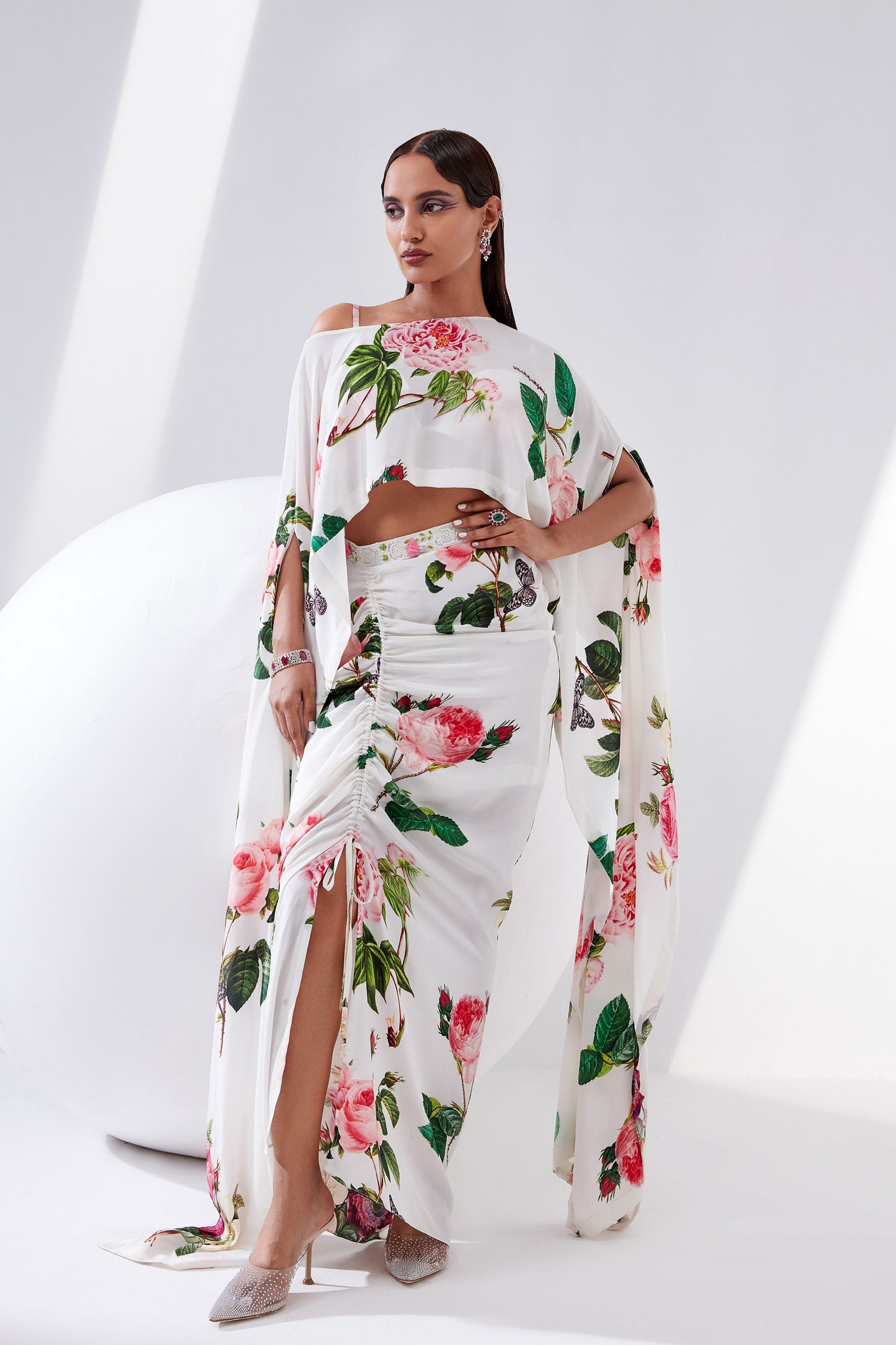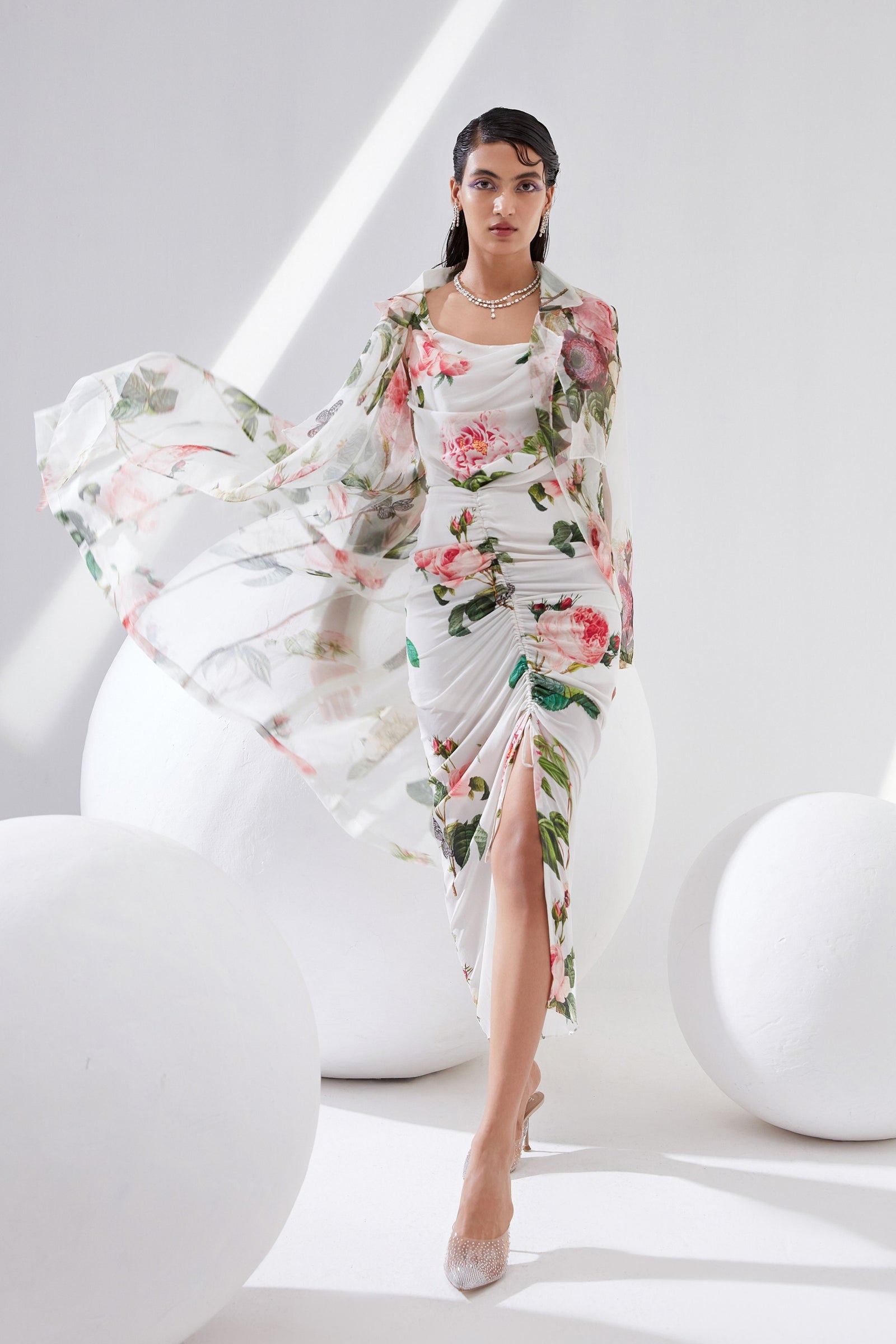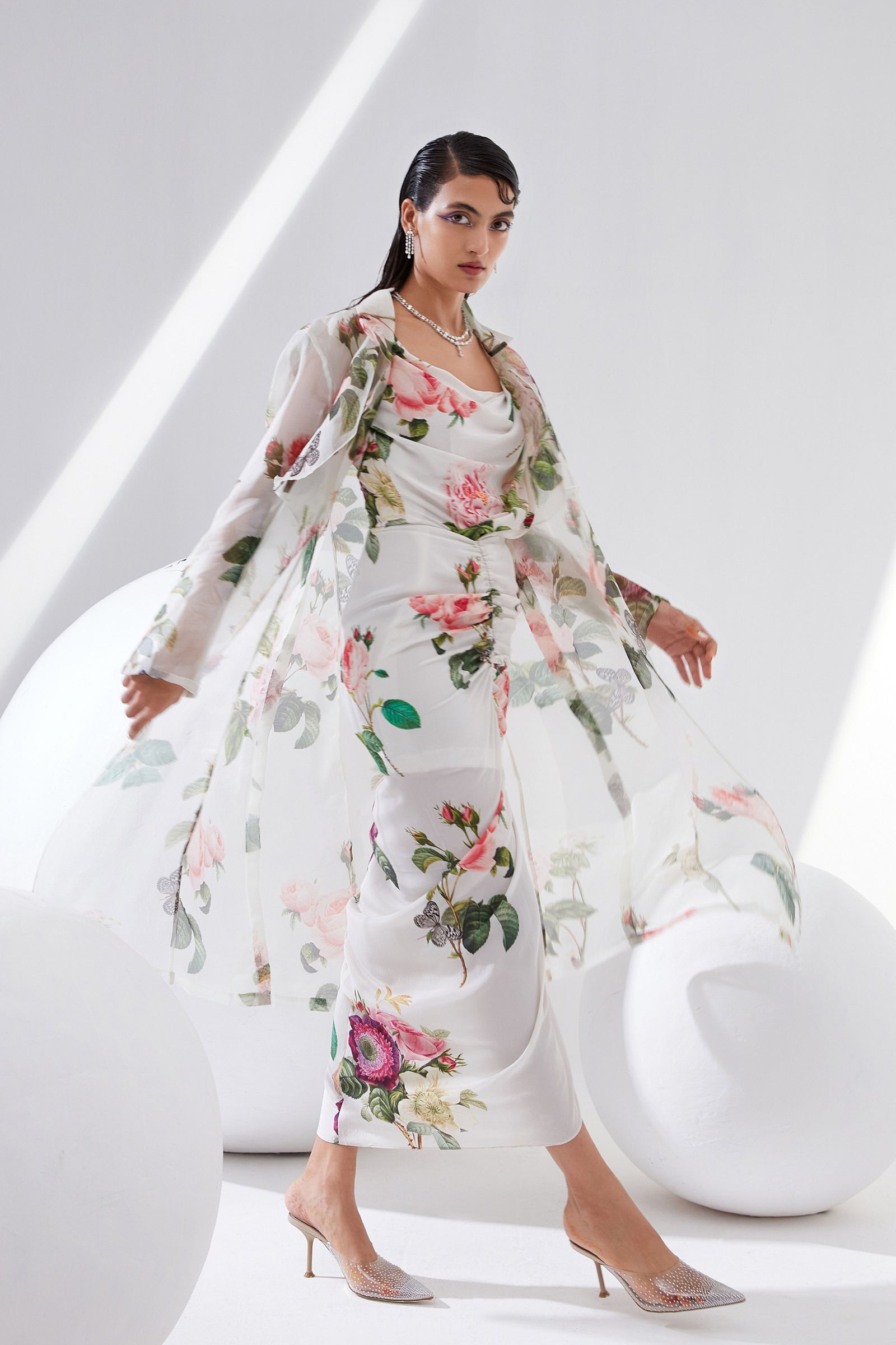 • Botanical print organza cape with scalloped border hand-embroidered with naqshi and fluted beads paired with a draped dress