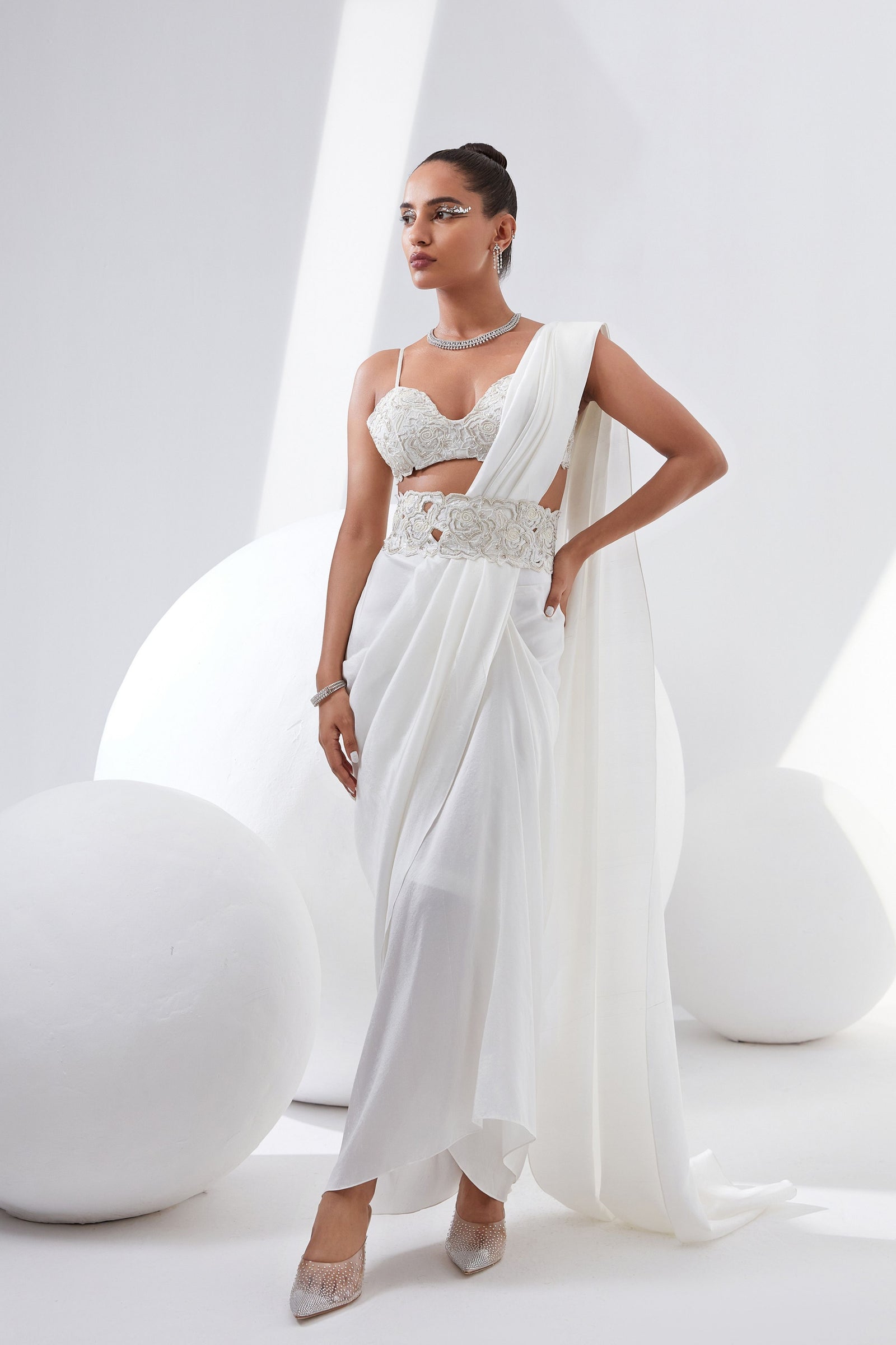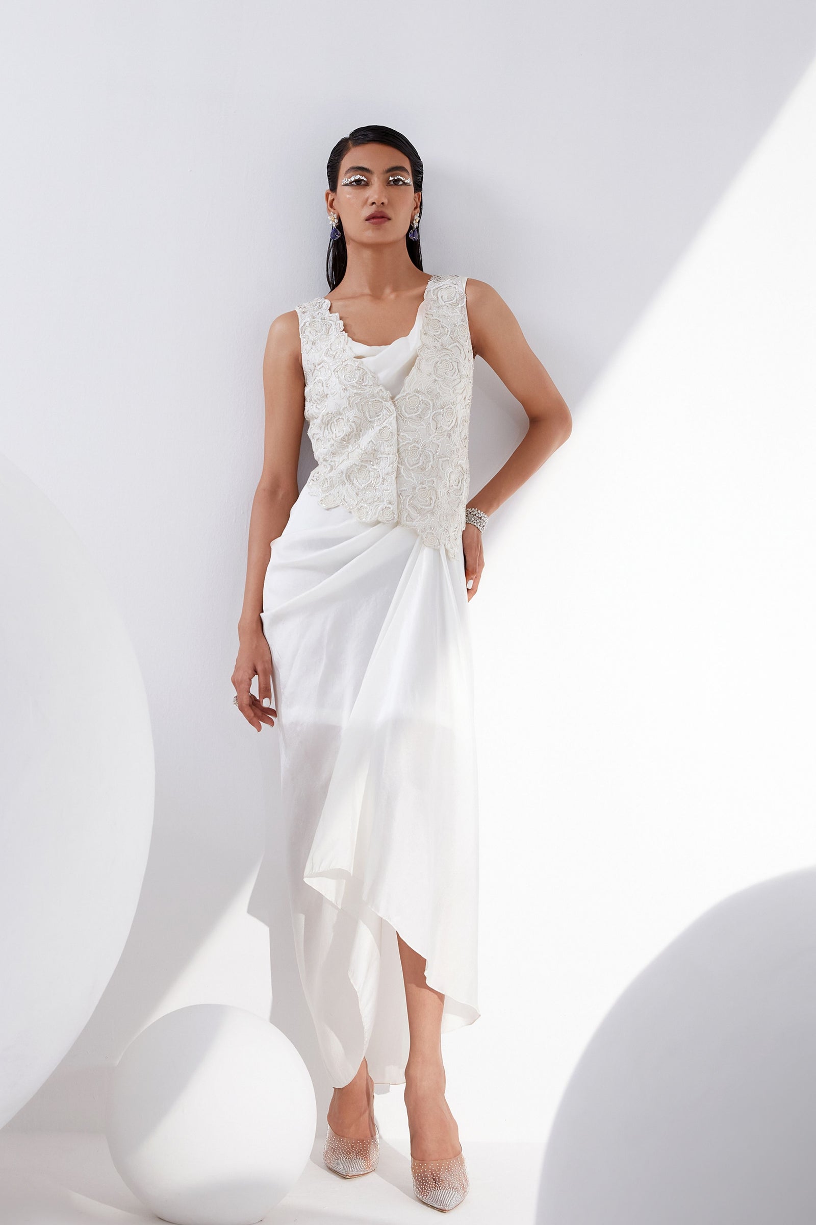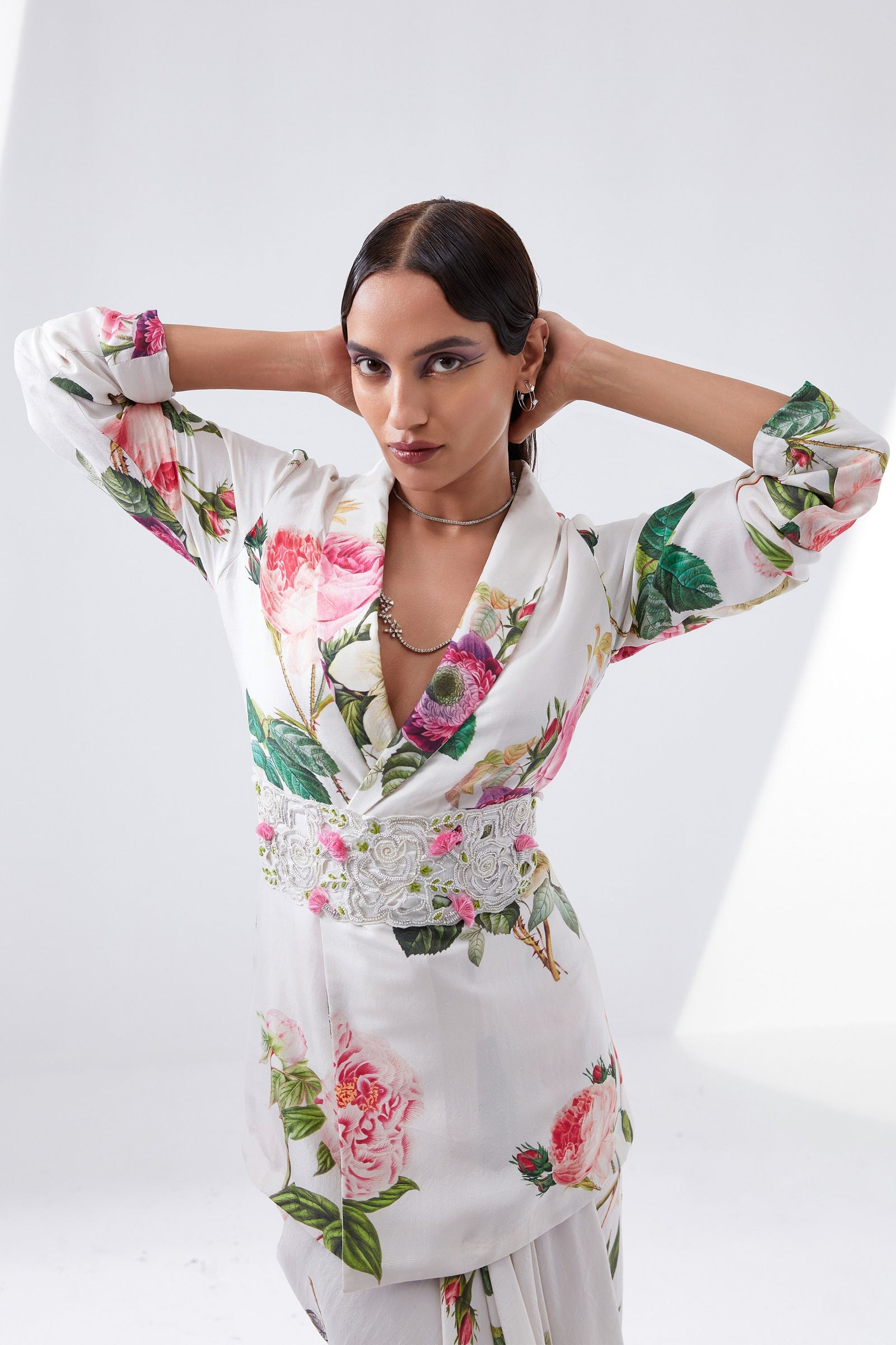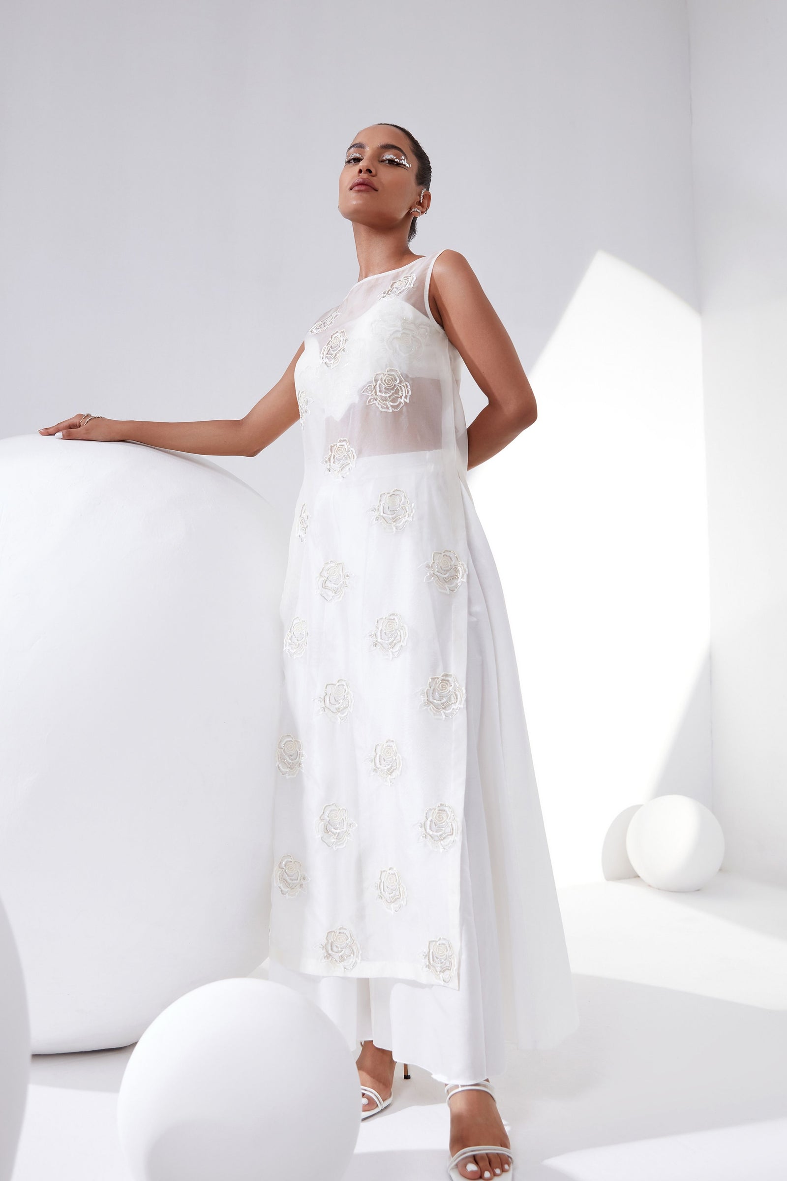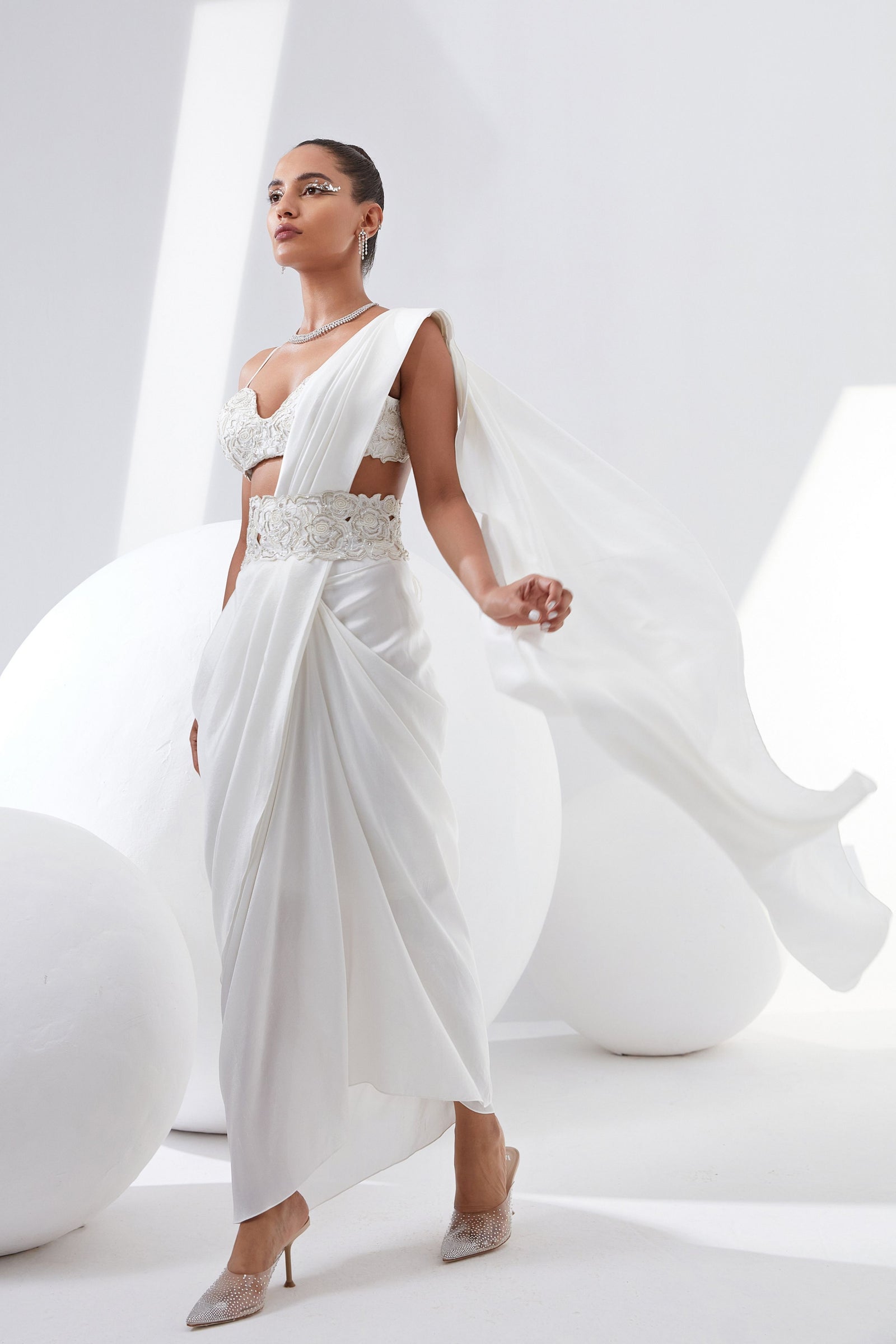 • Botanical print organza cape with scalloped border hand-embroidered with naqshi and fluted beads paired with a draped dress