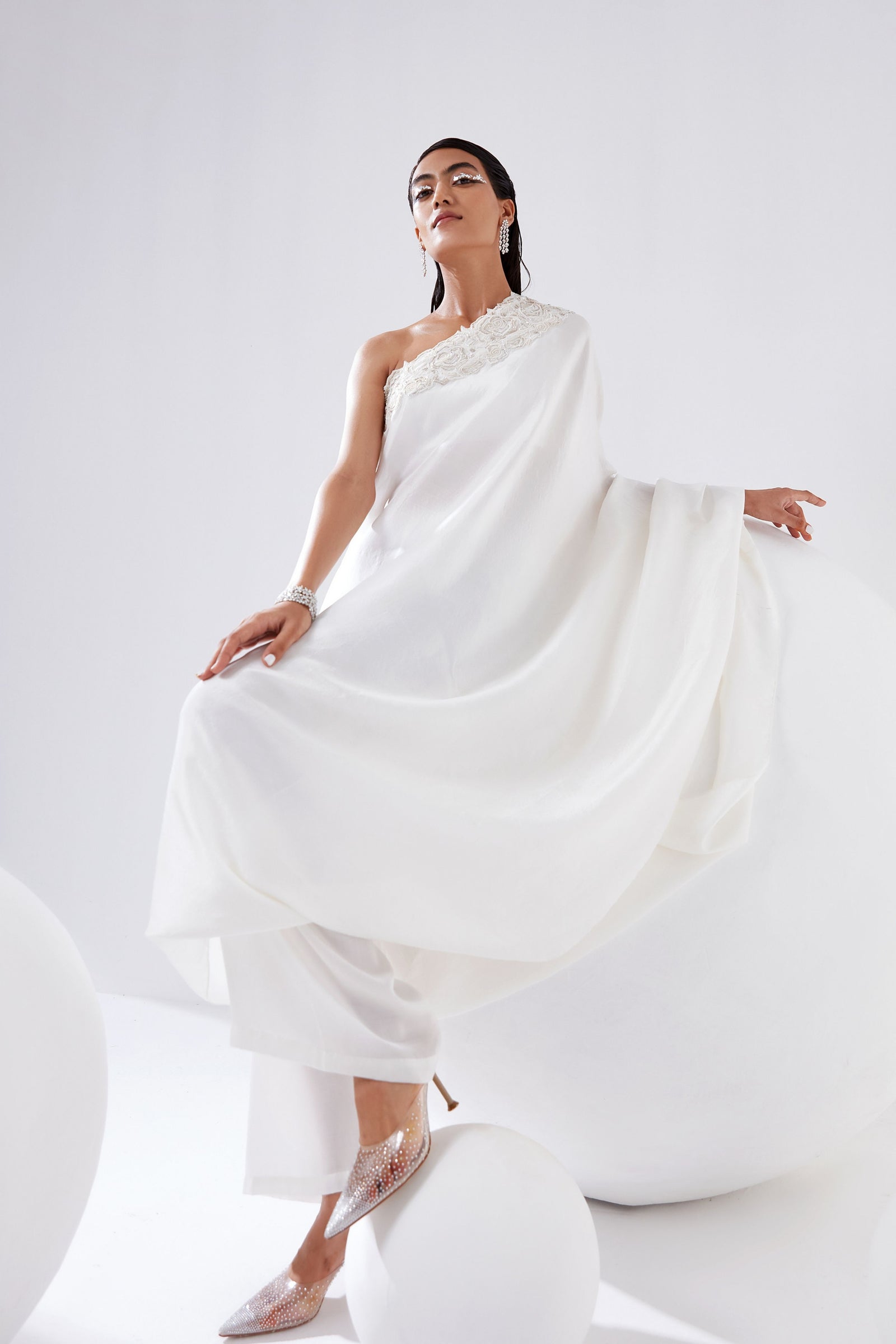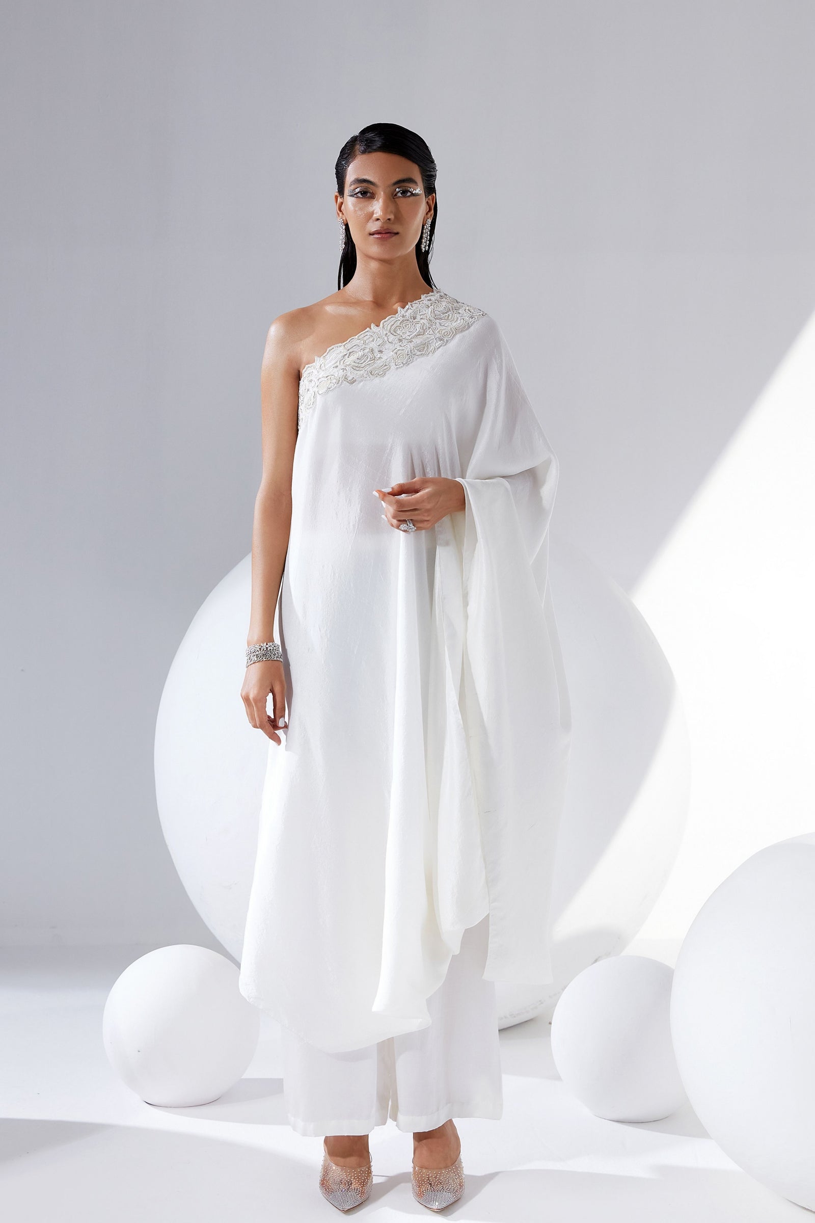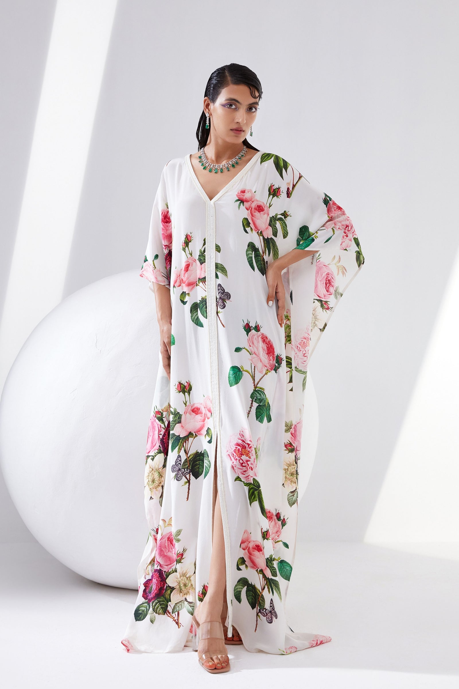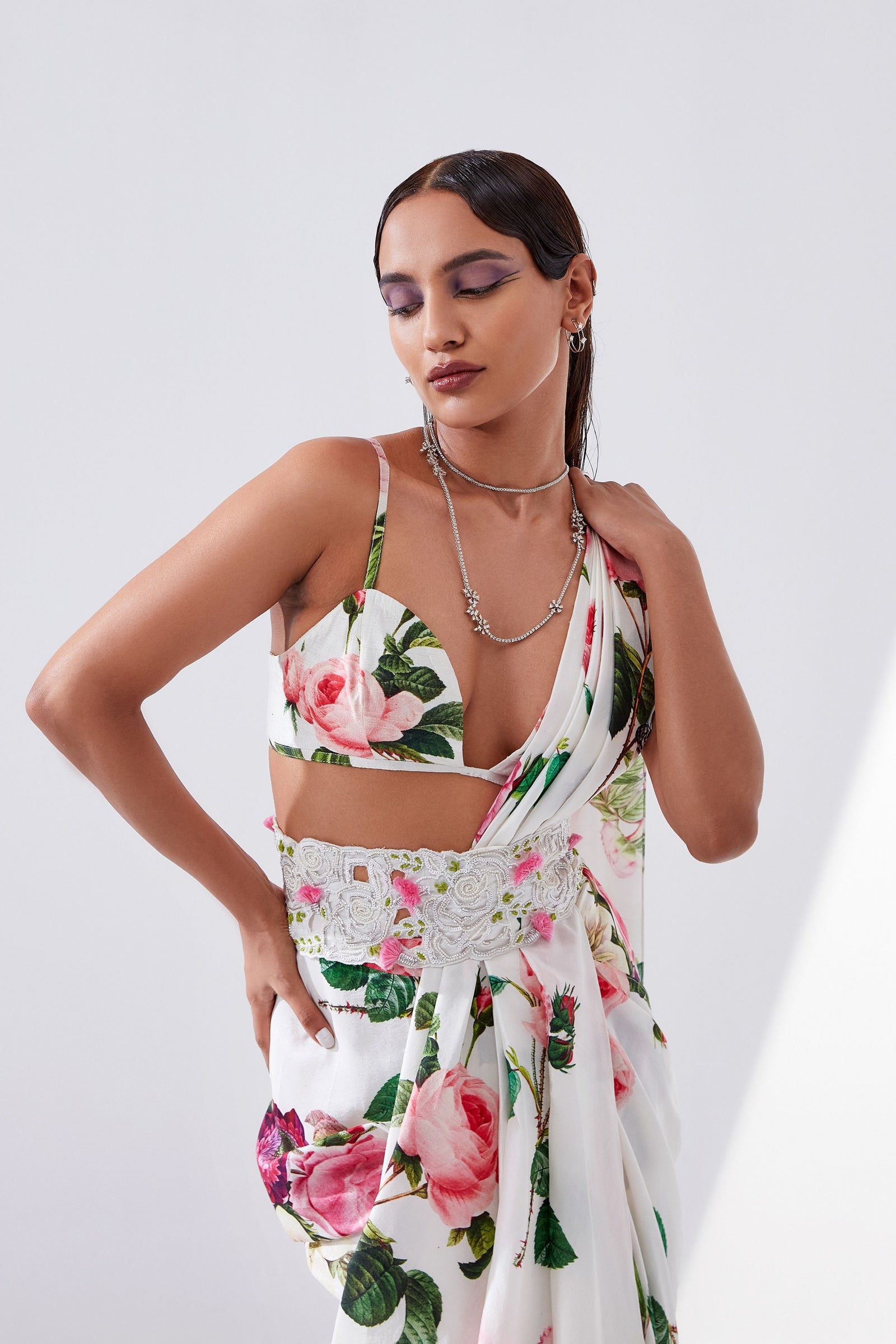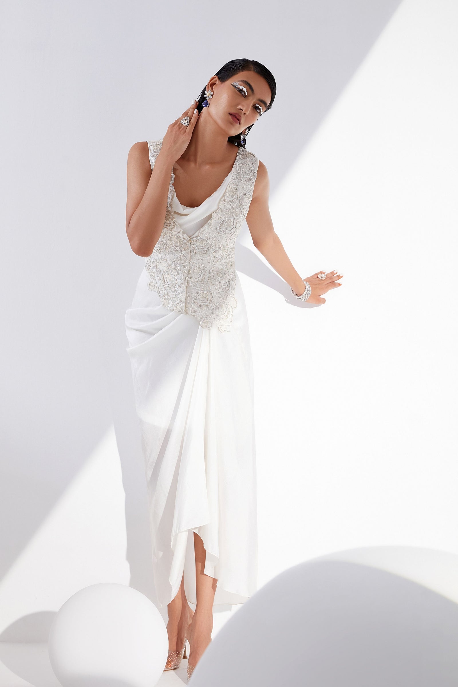 • Botanical print organza cape with scalloped border hand-embroidered with naqshi and fluted beads paired with a draped dress