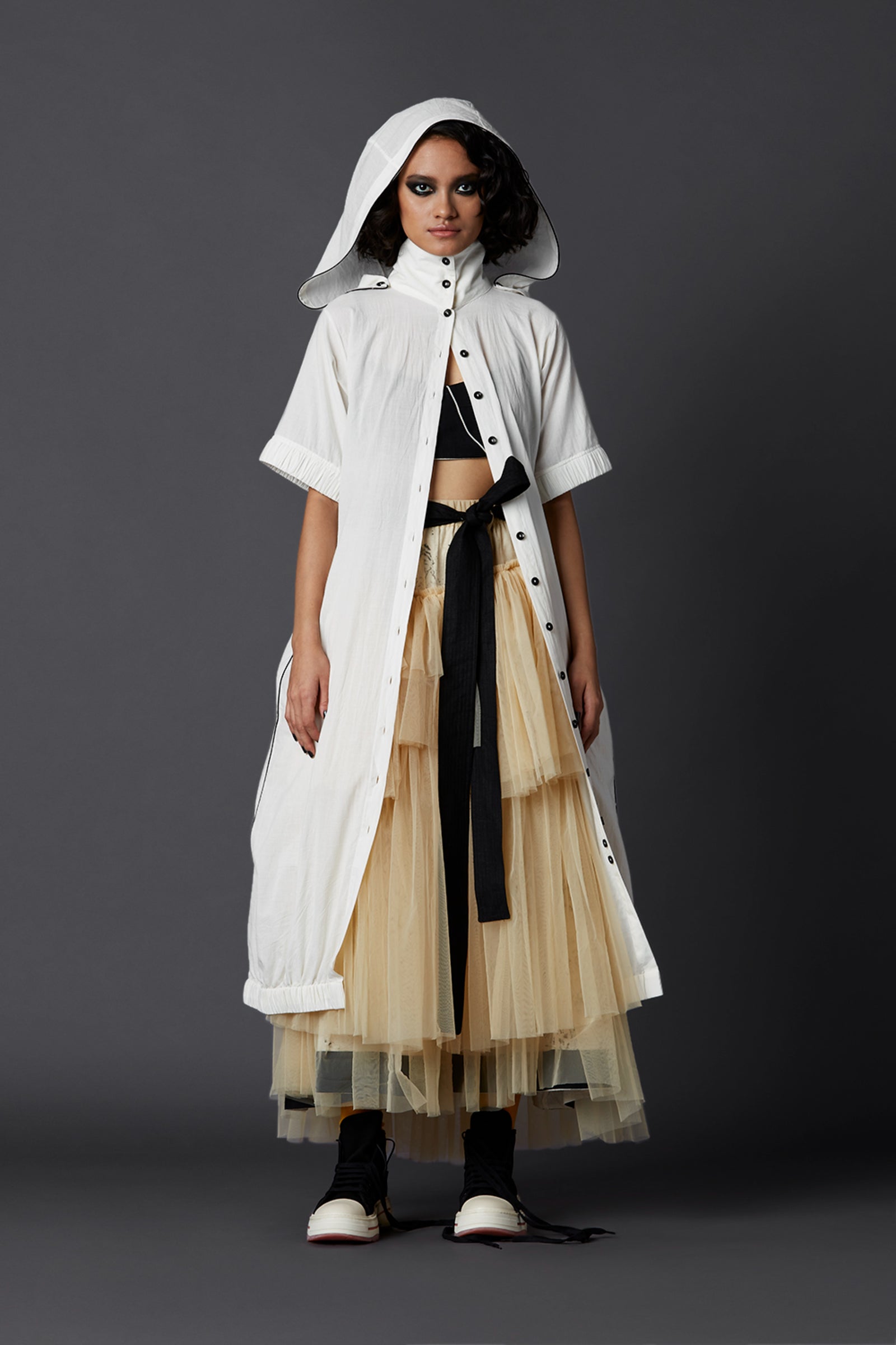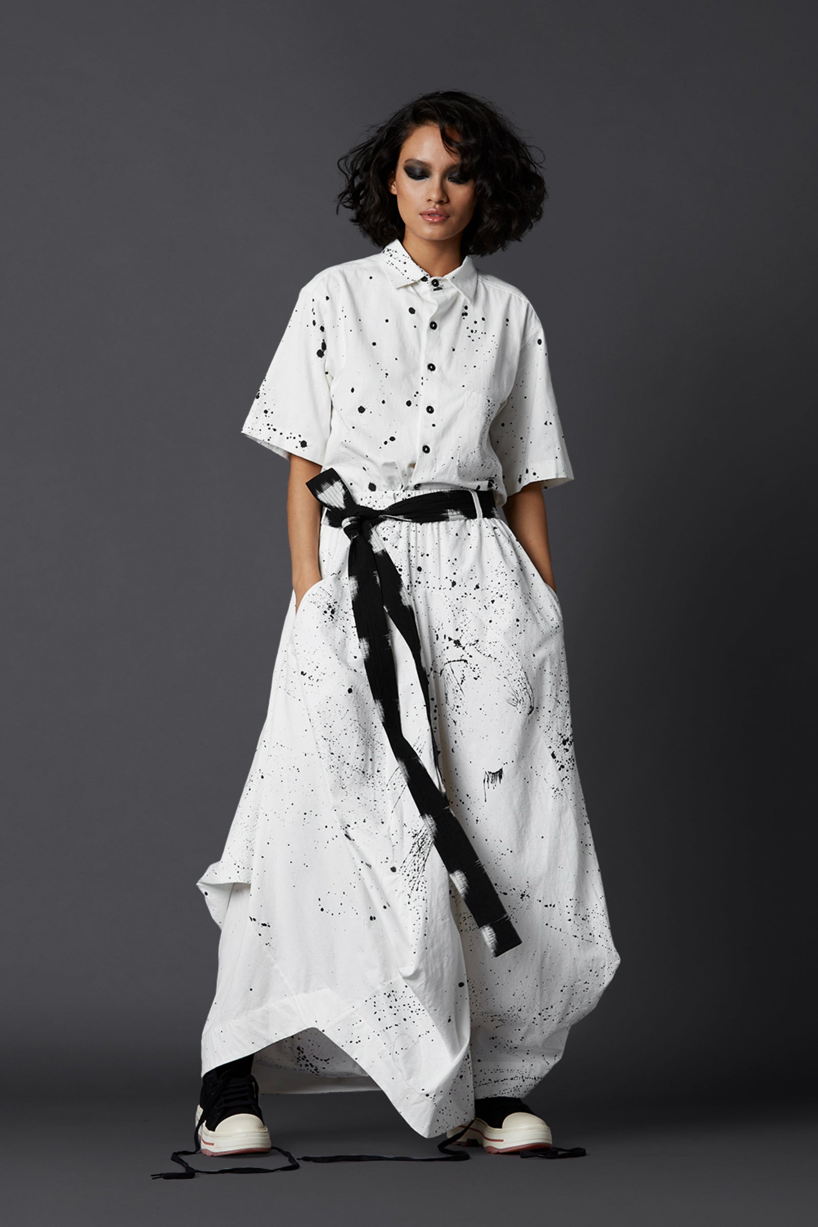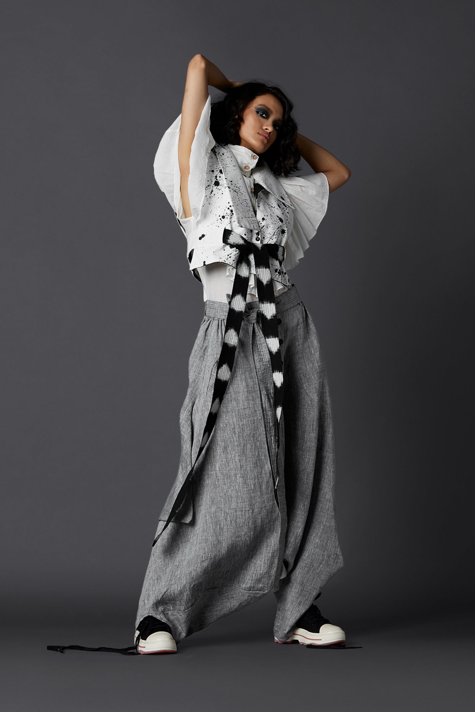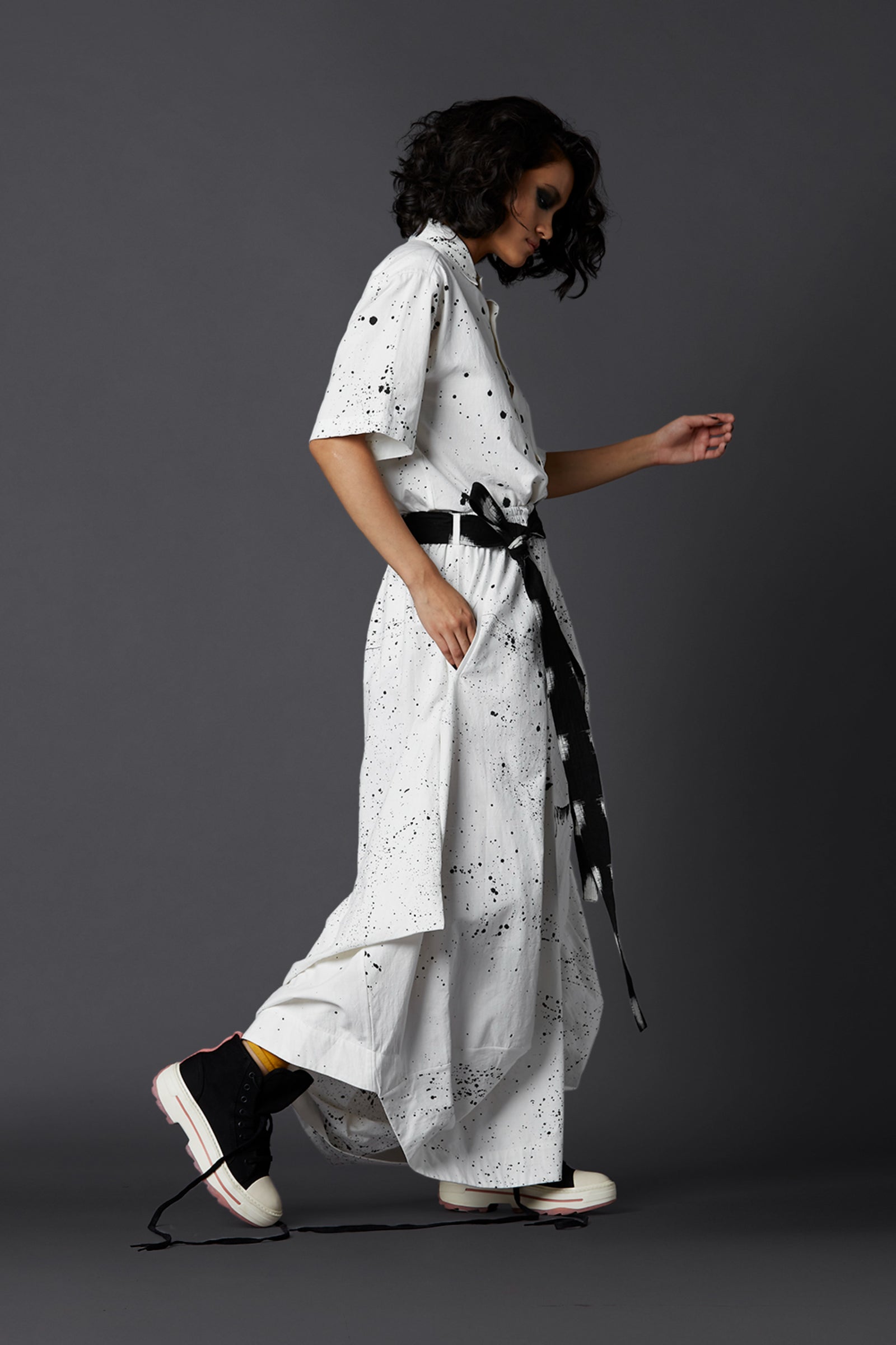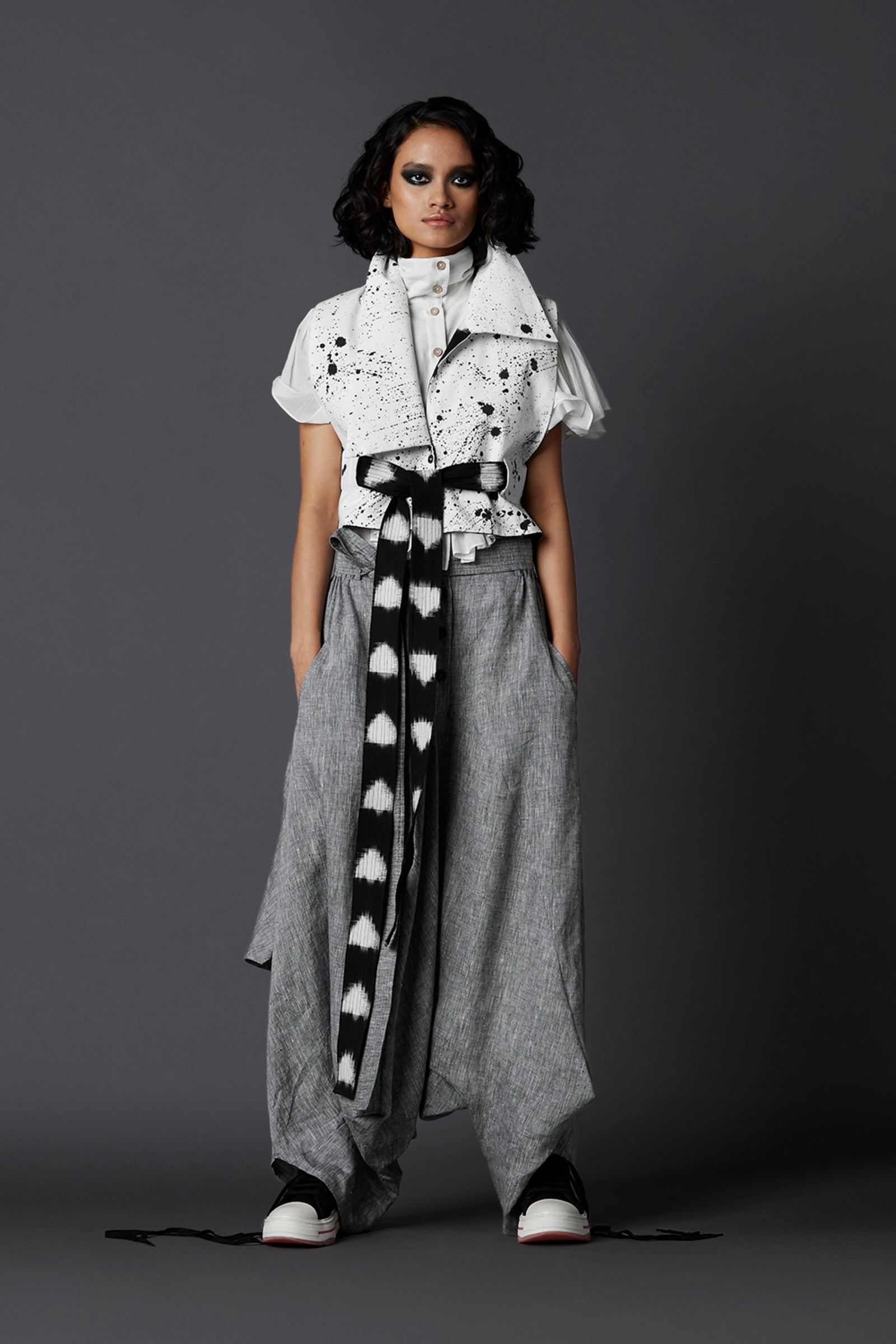 • Hand painted narrow jacket in white with uneven lapel and a belt in khadi.