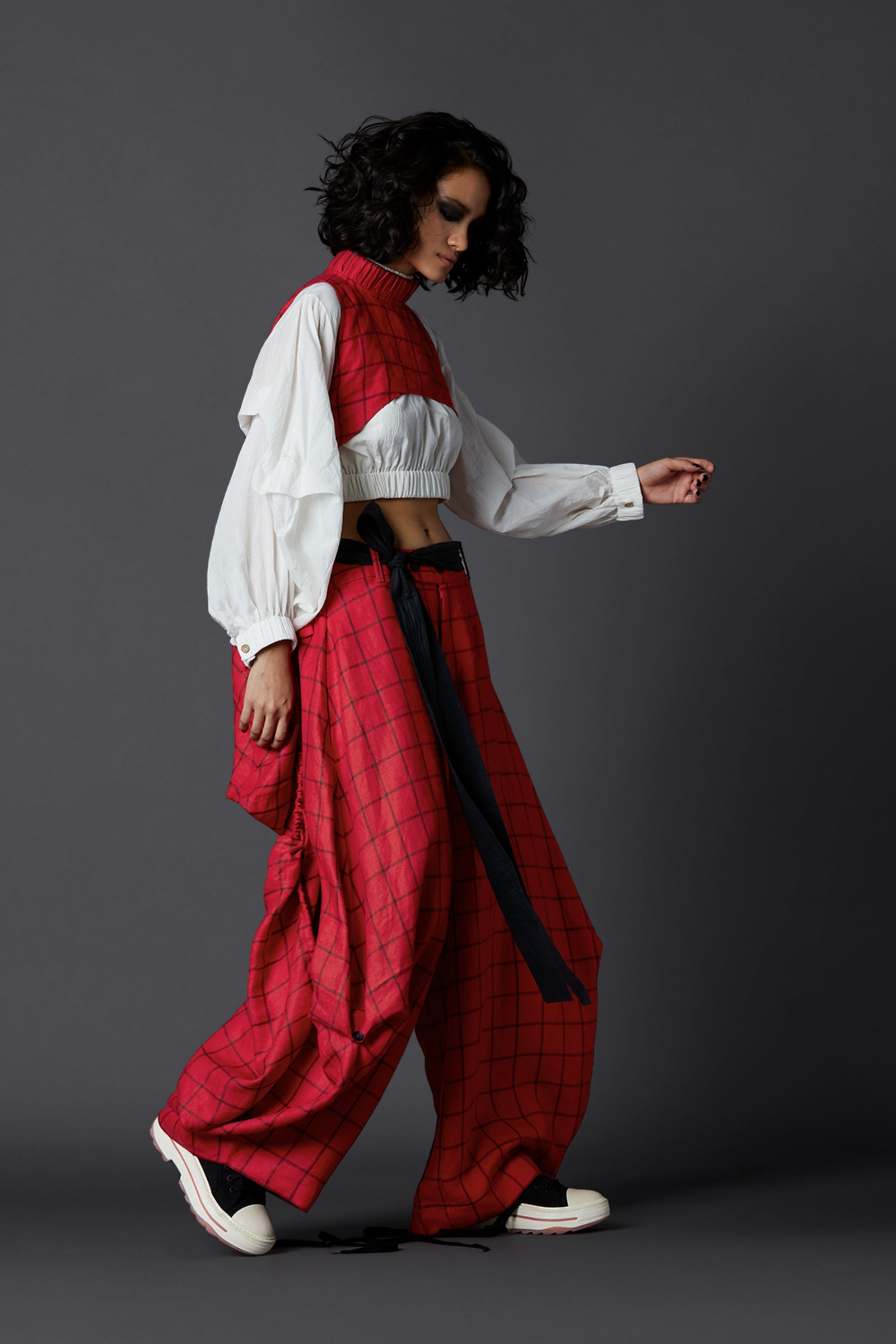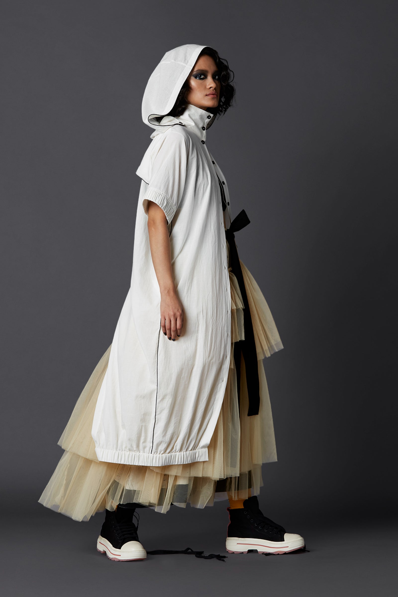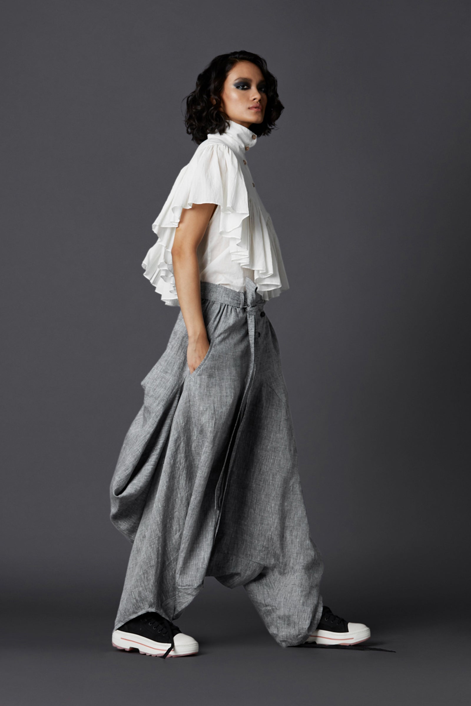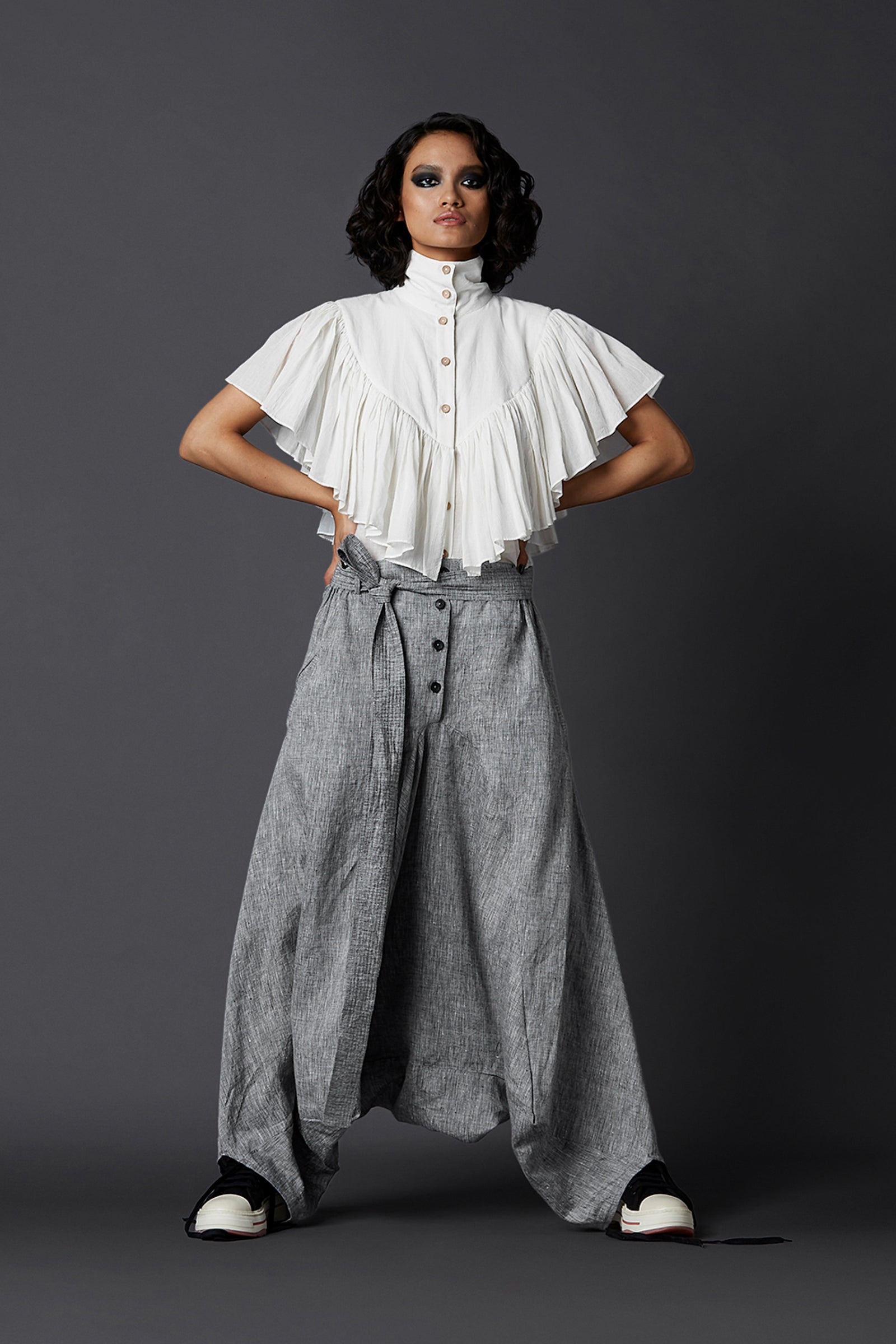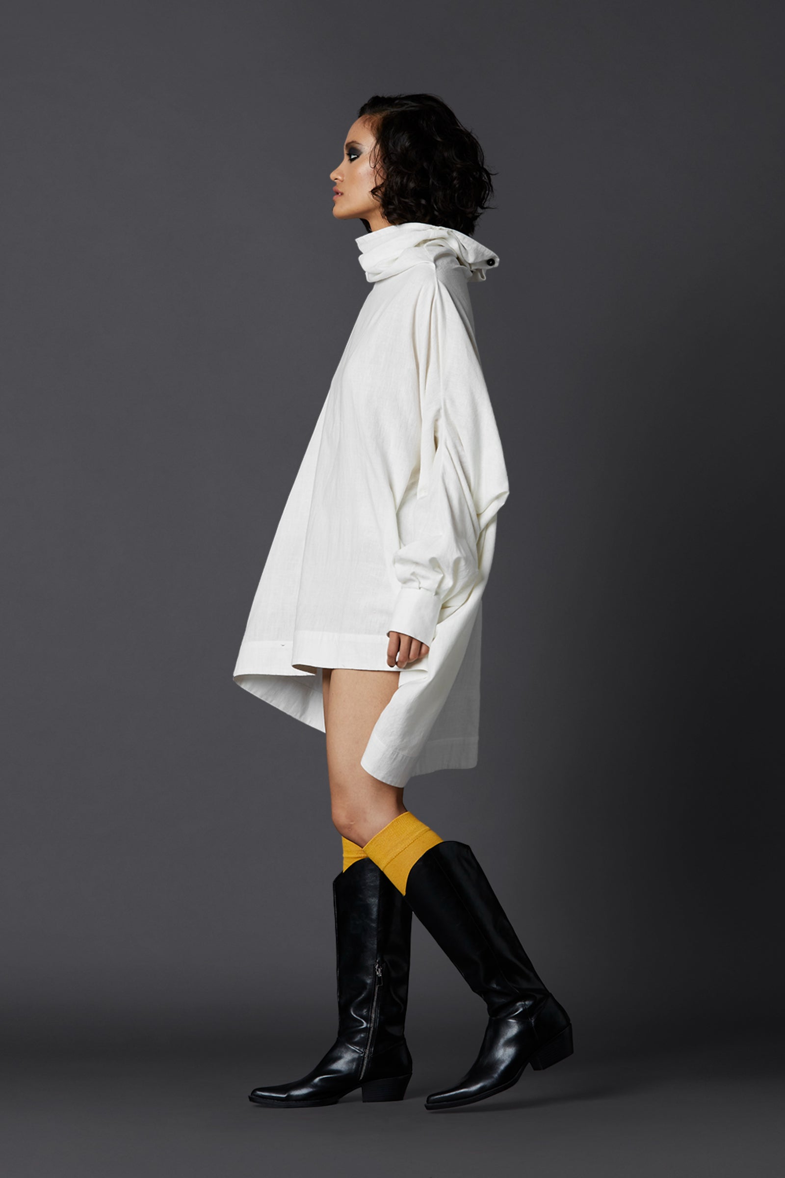• Hand painted narrow jacket in white with uneven lapel and a belt in khadi.