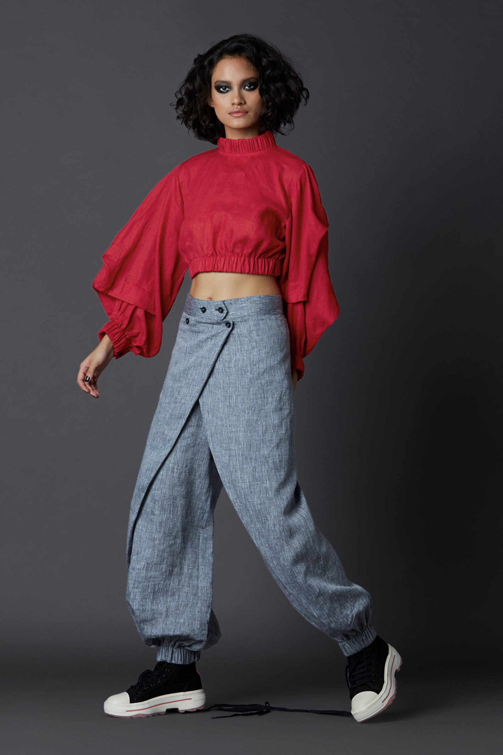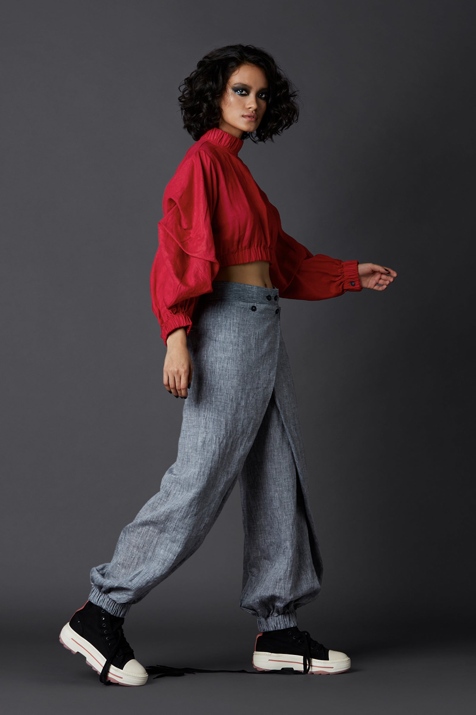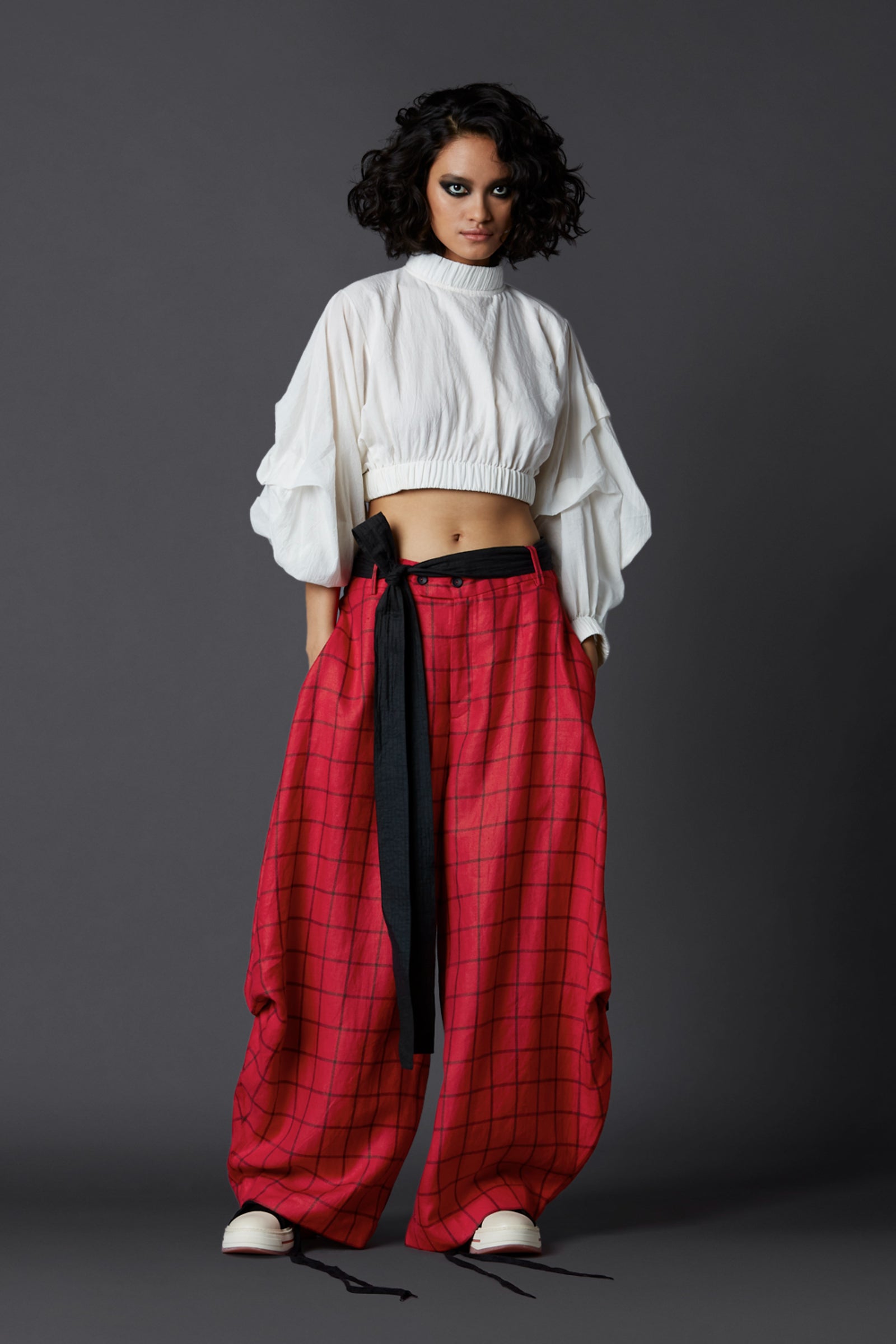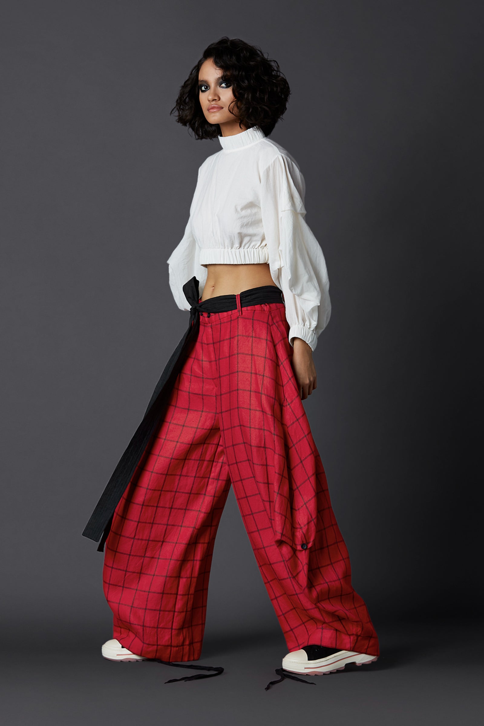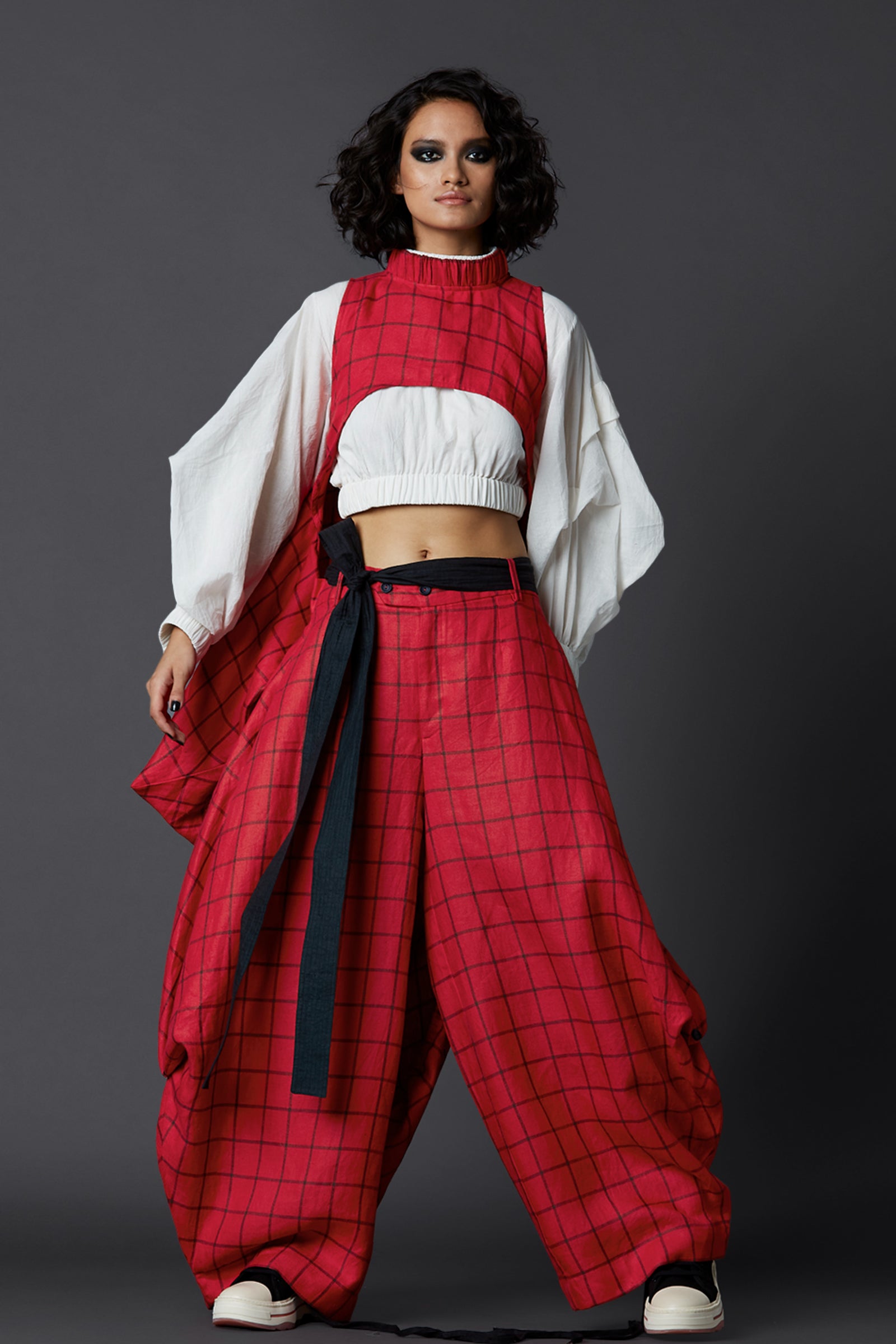 • Hand painted narrow jacket in white with uneven lapel and a belt in khadi.