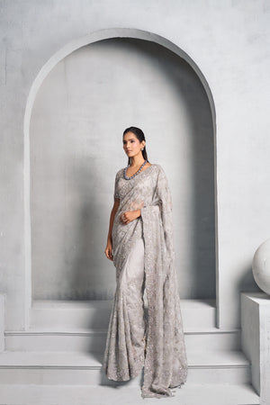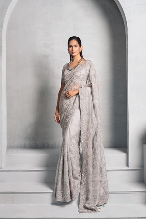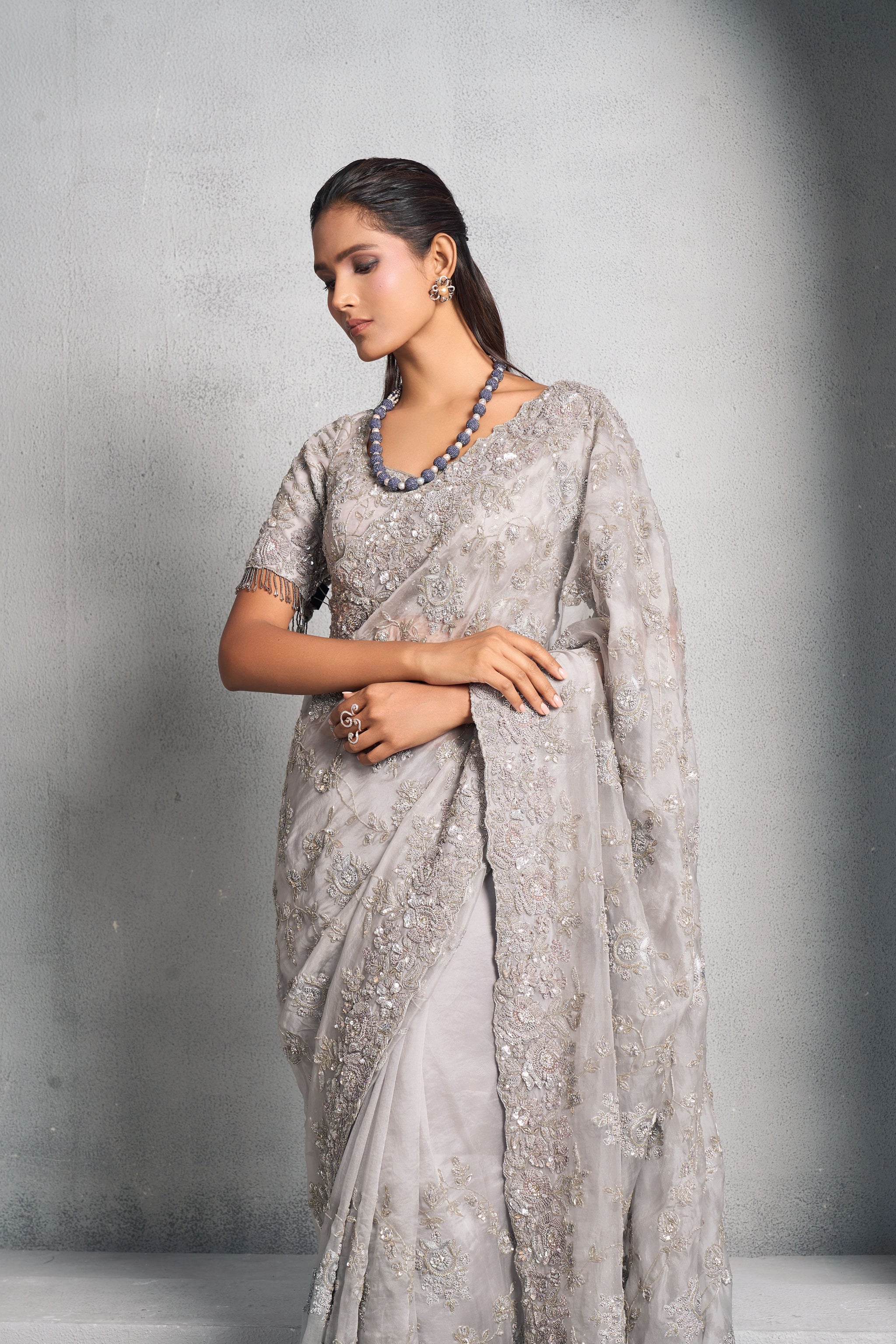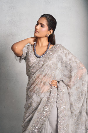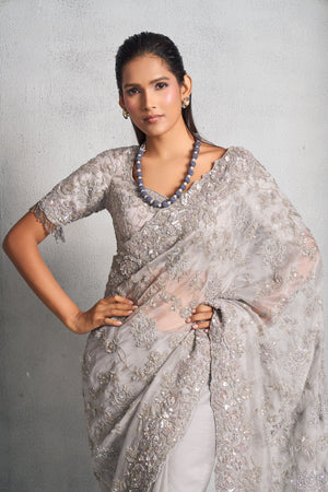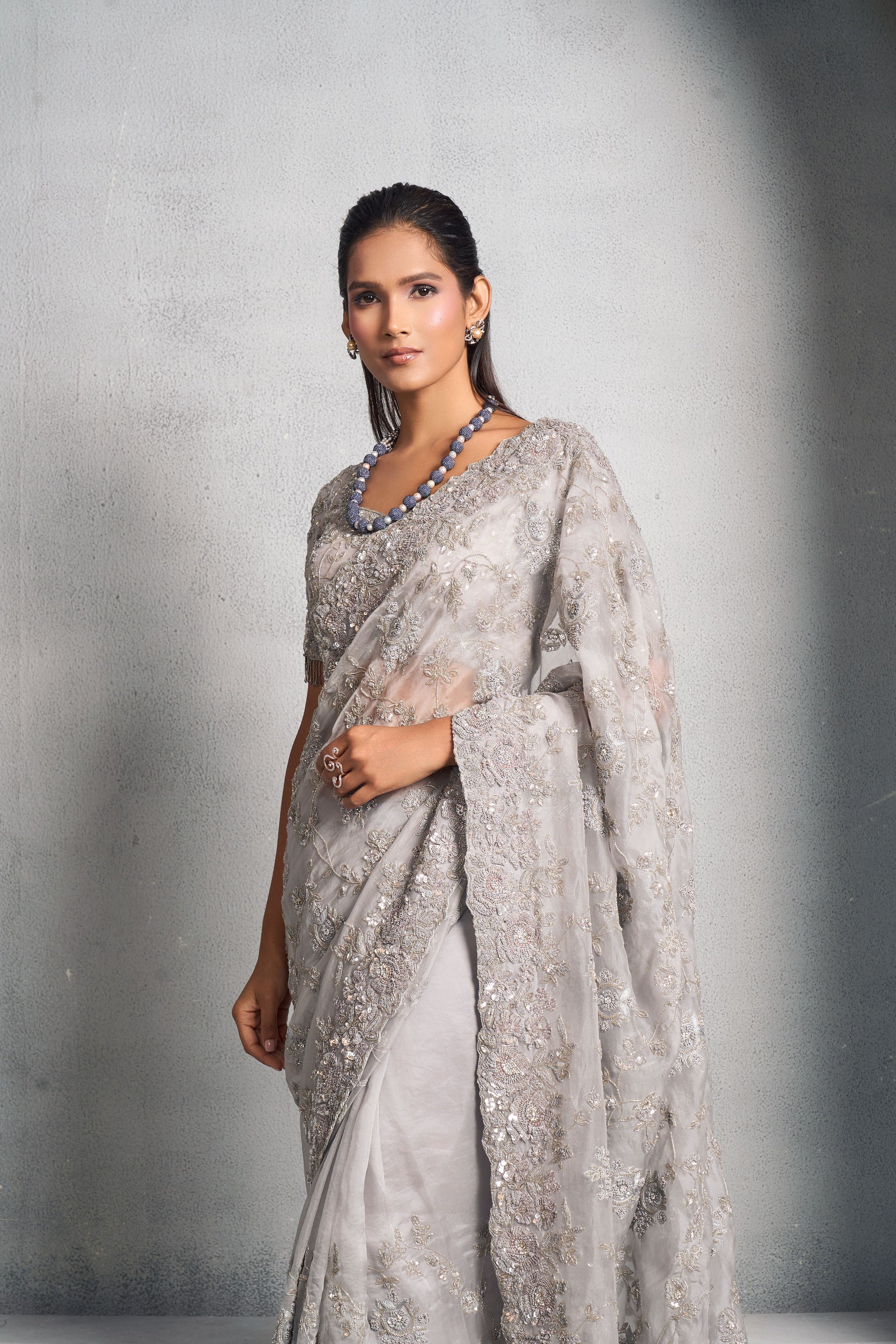 • Classic steel grey hand embellished organza saree with our redefined blouse laden with sequin ,cutdana and french knots further accentuated with pearls, oozes endless glamour and breathtaking radiance to your cocktail saree