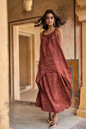 • Sleeveless top with an asymmetric hem and a relaxed, flowing silhouette. Made in a rich textured tonal jacquard. Braided beaded strap detailing along the neckline. Lightweight and elegant. Paired with a matching maxi skirt. Designed with a flattering, fluid silhouette for easy movement. A line shape. Elasticated at the waist with pockets in the sides.