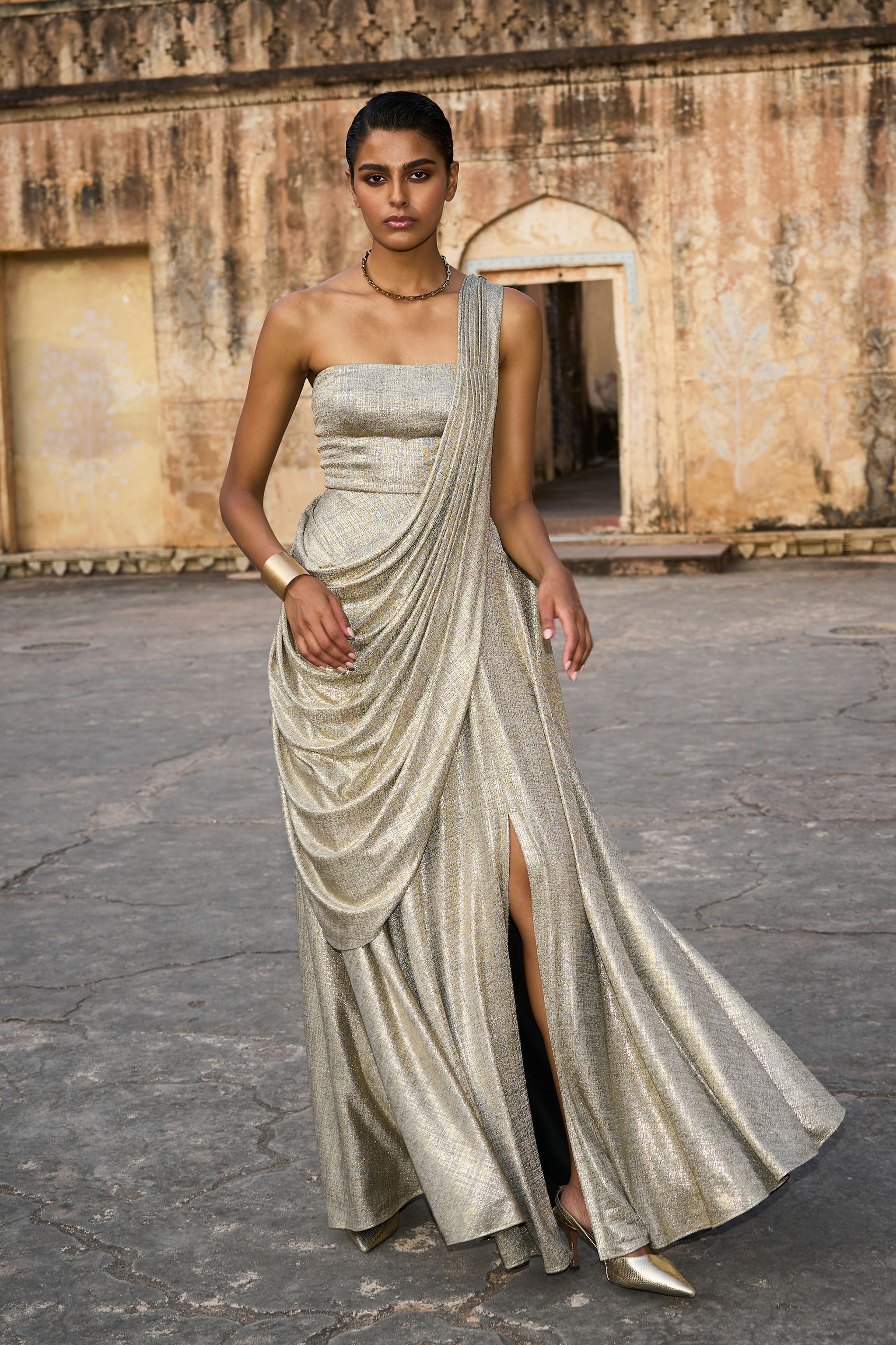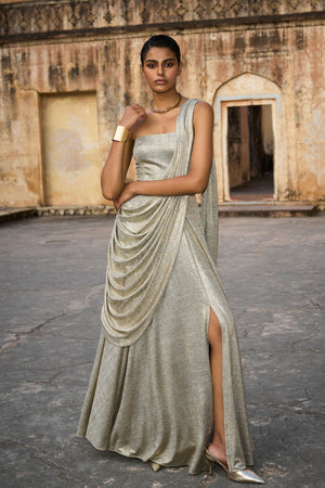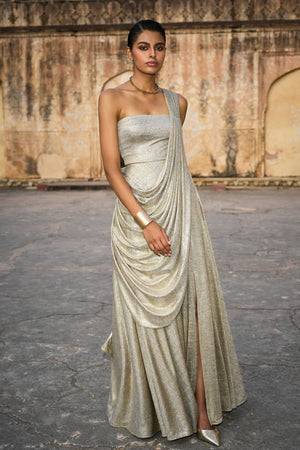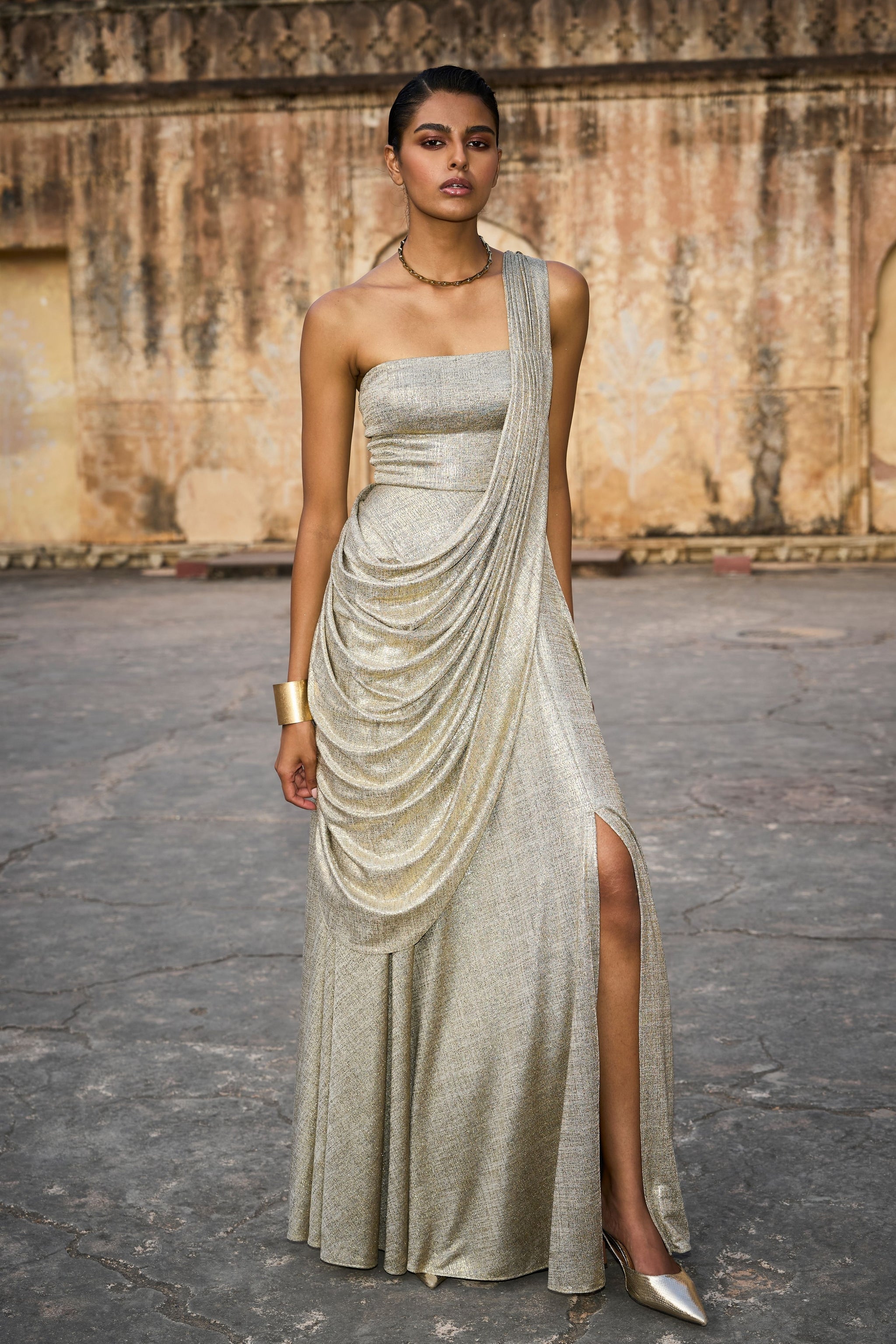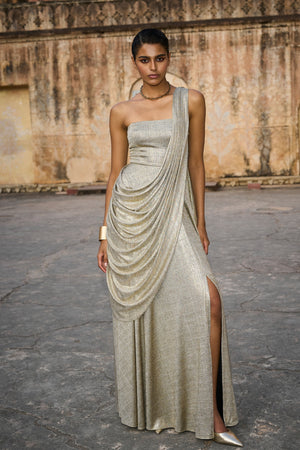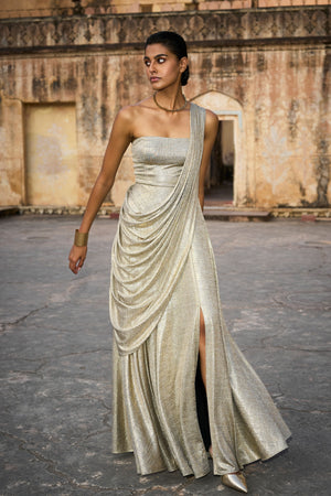 • Fit and flare maxi length off shoulder gown in a shimmering drapey champagne and gold knit fabric. Free flowing pleated panel with wraps around the waist and over the shoulder in a sari-inspired drape detail. Slit in the side. Zipper in the back. Garment is fully lined.