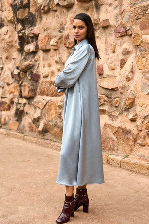 • Relaxed a-line shirt dress in a soft flowing textured satin. Shirt collar, full sleeves with a long cuff. Gold buttons on the front placket and sleeve cuffs.