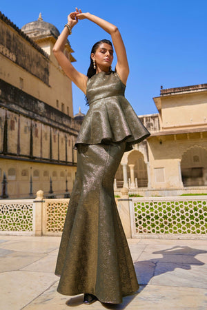 • Peplum shaped self brocade corset inspired sleeveless top in a textured metallic fabric. Zip in the back neck. Paired with a matching mermaid shaped maxi skirt. Zip in the side.