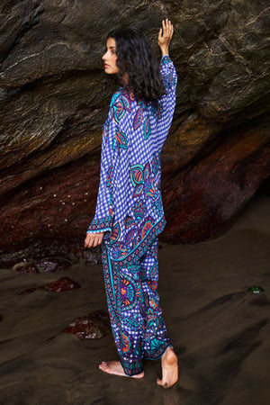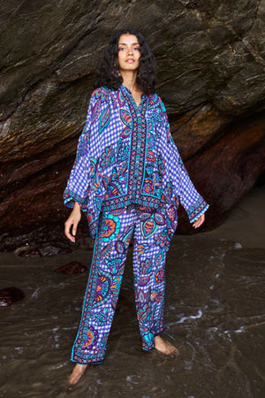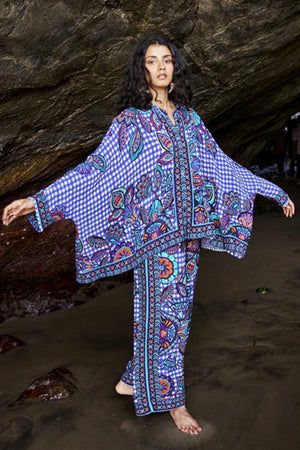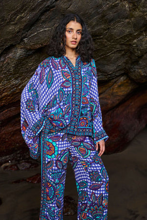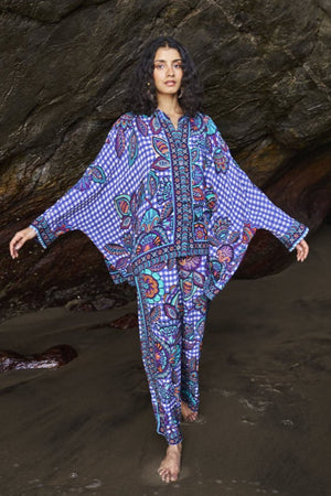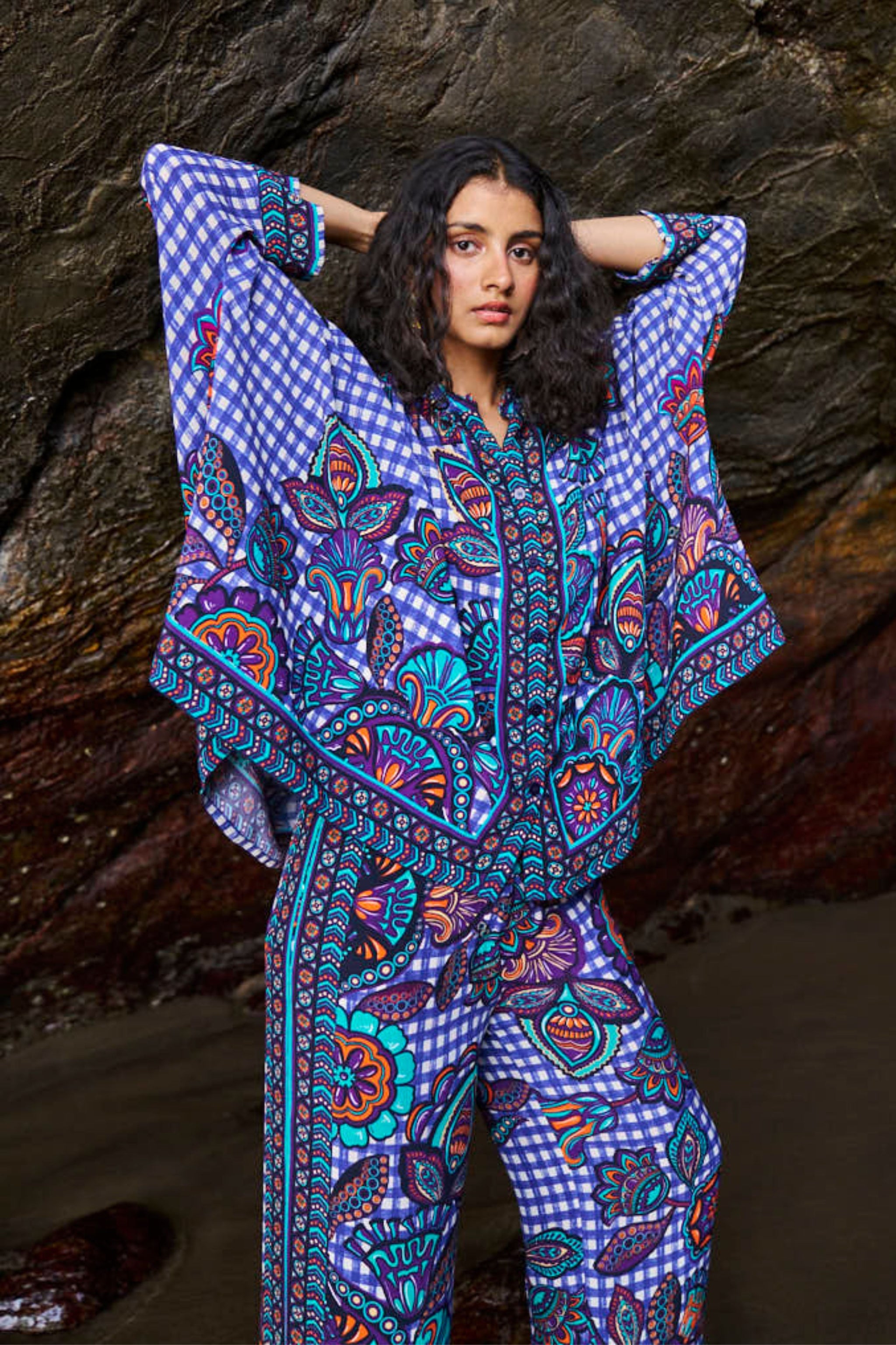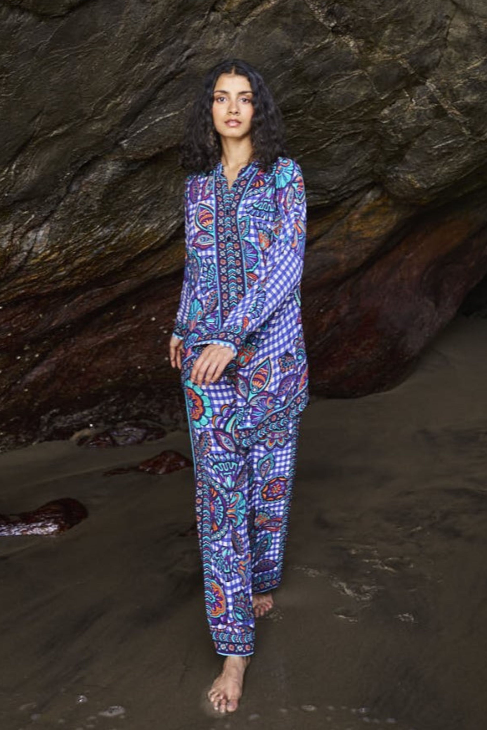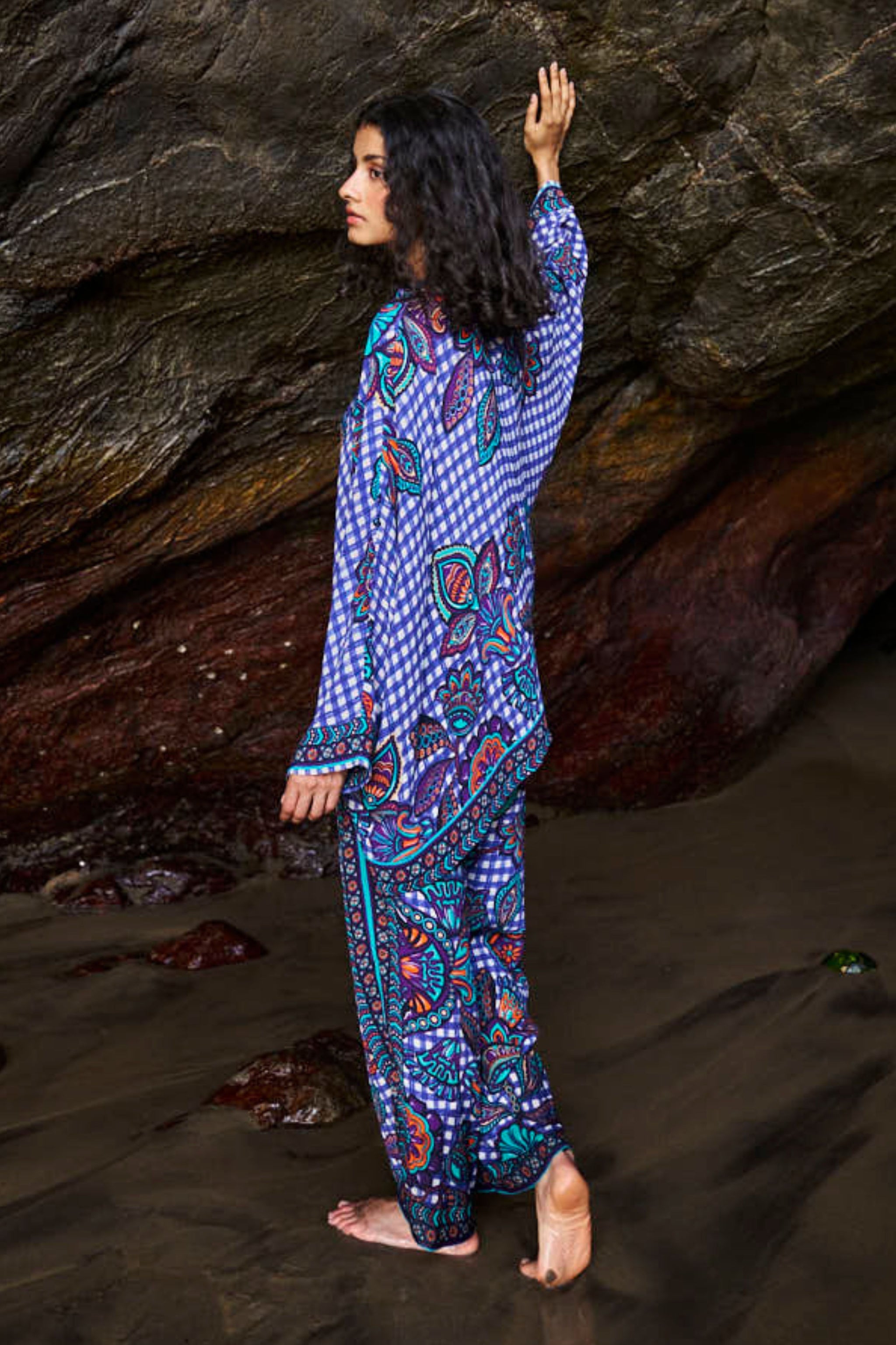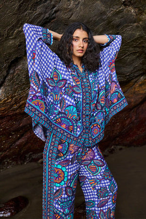 • Boxy band collar shirt in blue and white summer checks with placed floral motifs. Button down front. Flowy crepe fabric, boxy fit. Paired with matching pants that have a zip font closure and pockets at the sides.