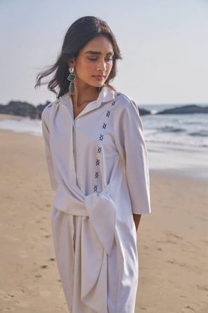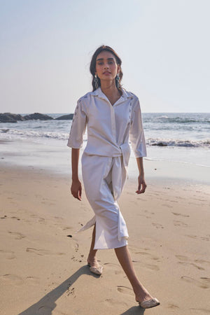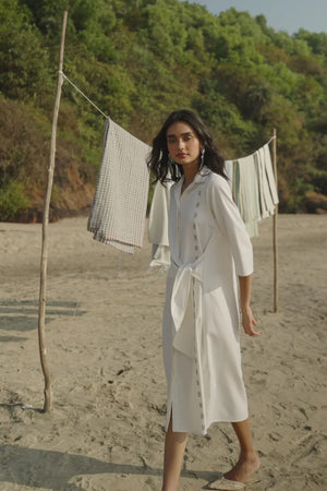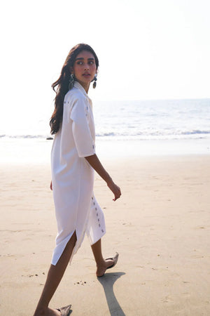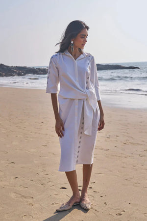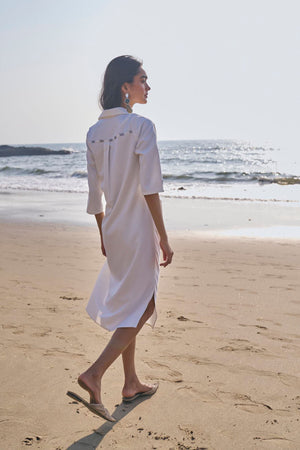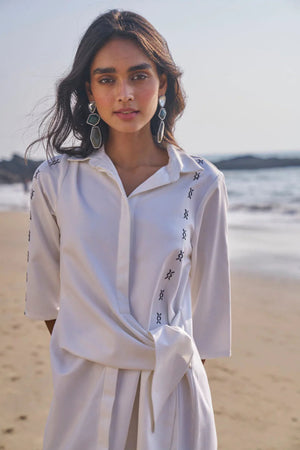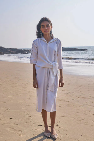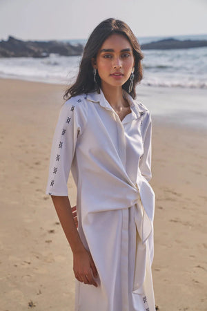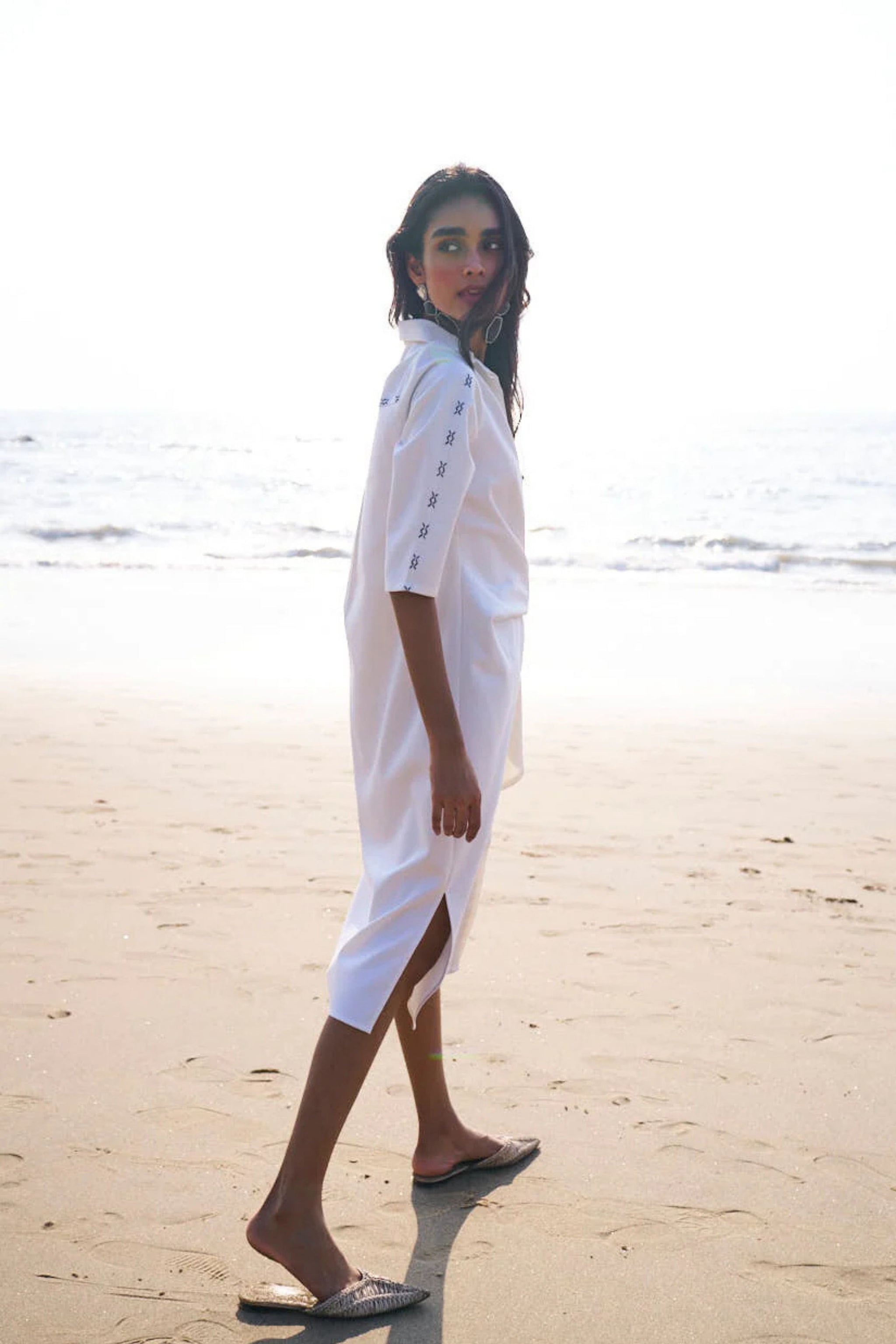 • Ivory shirt dress in midi length with a side tie detailing off the centre front. Placed asymmetric hand applied cross stitch embroidery. Concealed button placket and slits on both sides. 3/4Th sleeves.