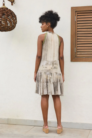 • The halter neck 2 tiered printed dress features floral embroidered motifs and lace detailing.