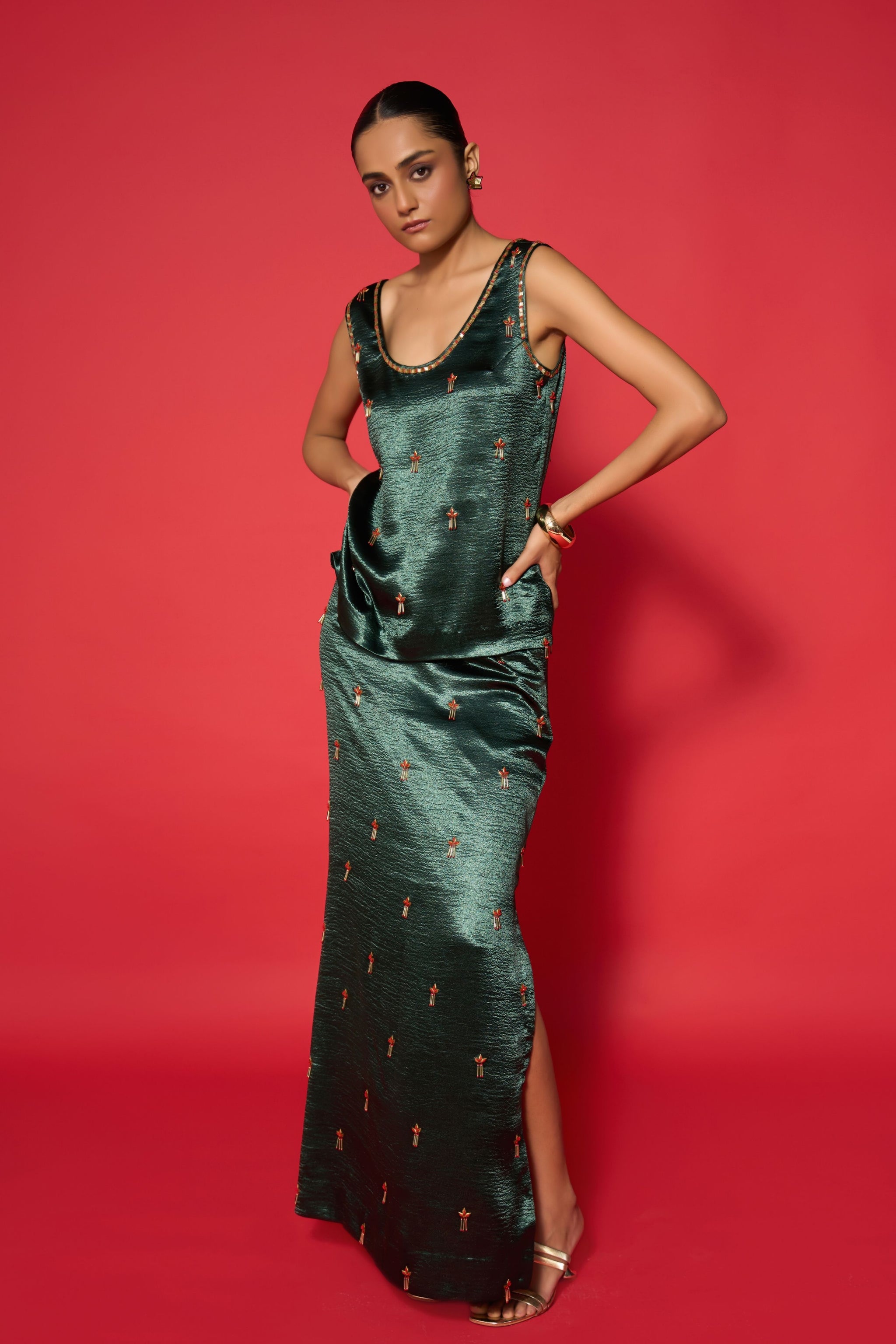 • Elevate your eveningwear with this luxurious emerald green satin top, delicately adorned with intricate hand embroidery all over the body with a an emroidery detailing in neckline and armhole. Perfect for social gatherin or evening parties