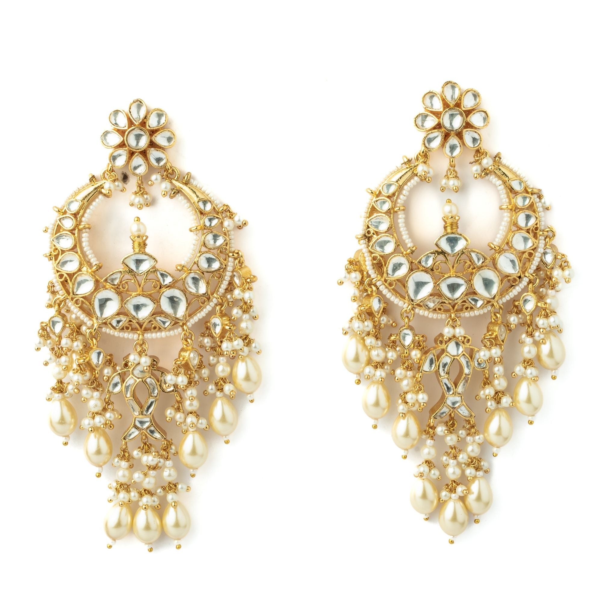 • Elegant gold-plated chandbali earrings adorned with sparkling kundan stones and delicate pearl drops. A perfect blend of tradition and sophistication for weddings and festive occasions. Push back closure. Anti-allergic and safe for skin, products do not tarnish