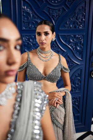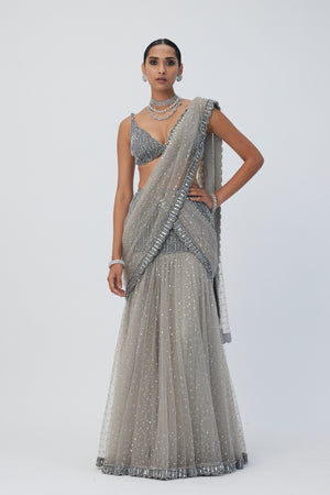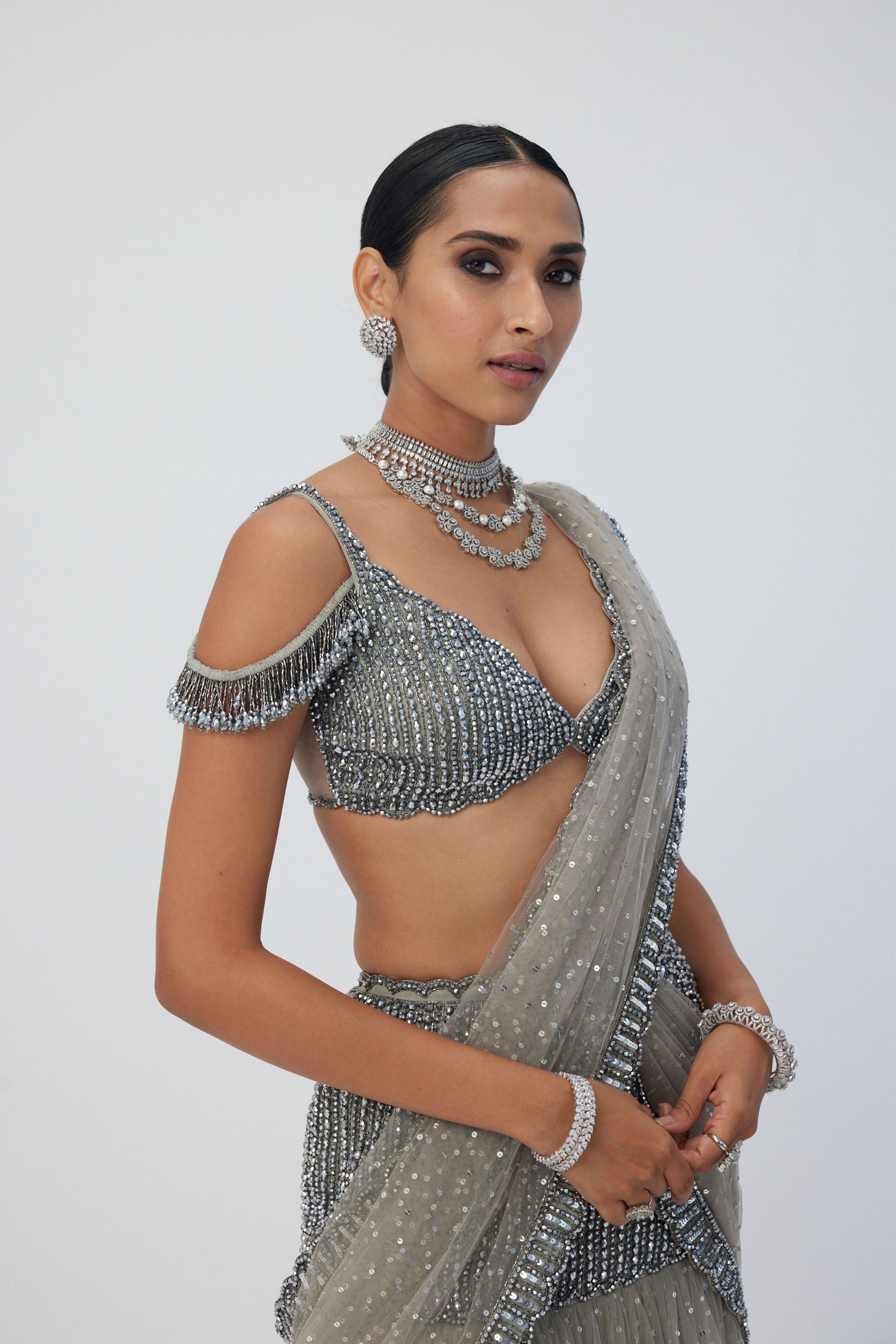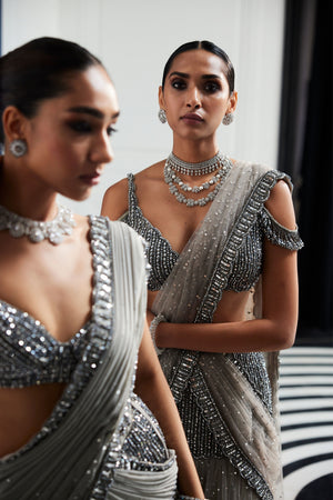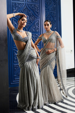 • Intricately hand embroidered pre draped georgette saree featuring sequins and crystal embroidery clubbed with cap sleeved jewelled blouse with crystal embellishments.