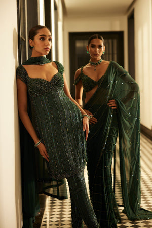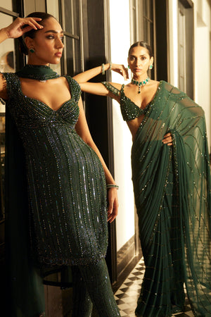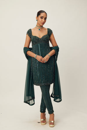 • Intricately hand embroidered kurta, pants and dupatta adorned with cutdana and crystal embroidery.